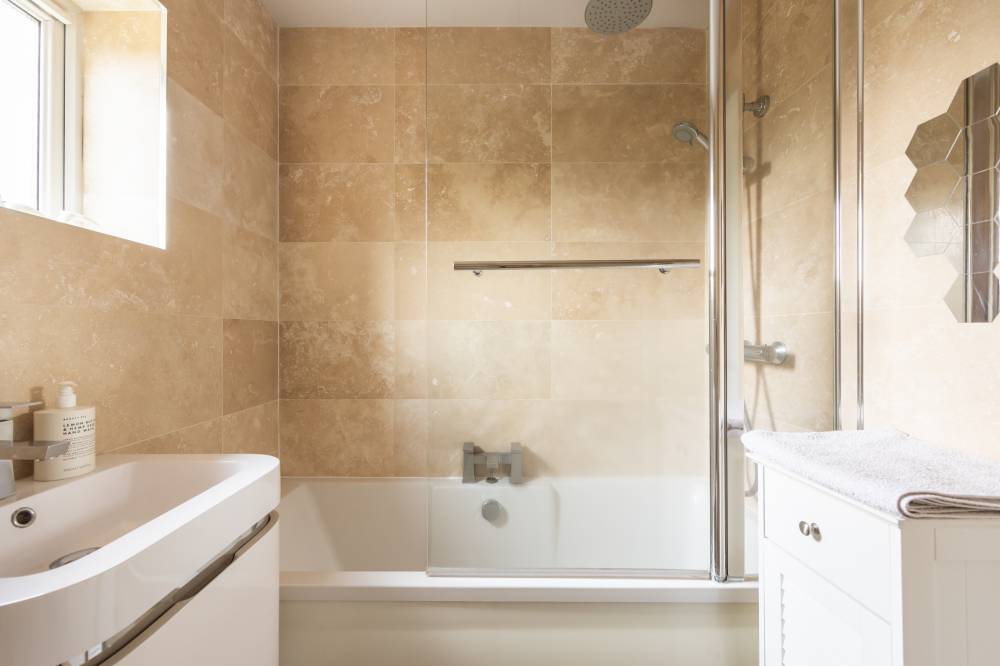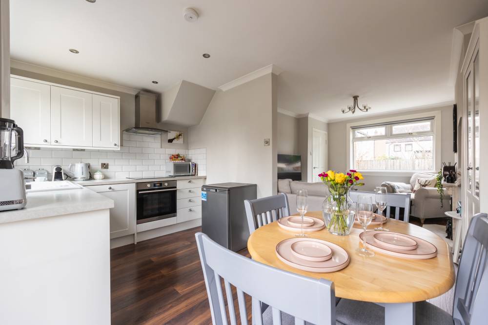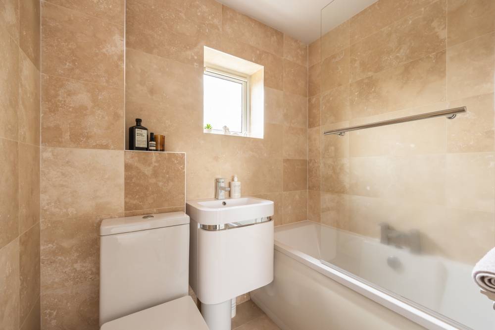 Internally, the accommodation comprises an entrance hallway with staircase and a spacious semi open-plan dual-aspect living space. To the front lies a welcoming reception area with modern décor, while to the rear is a dining area and contemporary fitted kitchen featuring an array of wall and base units, integrated appliances and subway tiling to the splashback areas. Glazed double doors from the dining space provide direct access to the garden. There are two well-proportioned double bedrooms, the principal set to the front with built-in wardrobes and the second enjoying a peaceful rear aspect. The fully tiled bathroom is fitted with a three-piece white suite, dual-headed thermostatic shower over the bath and a chrome heated towel rail. Additional storage is available within the attic, accessed via a loft ladder and partially floored.