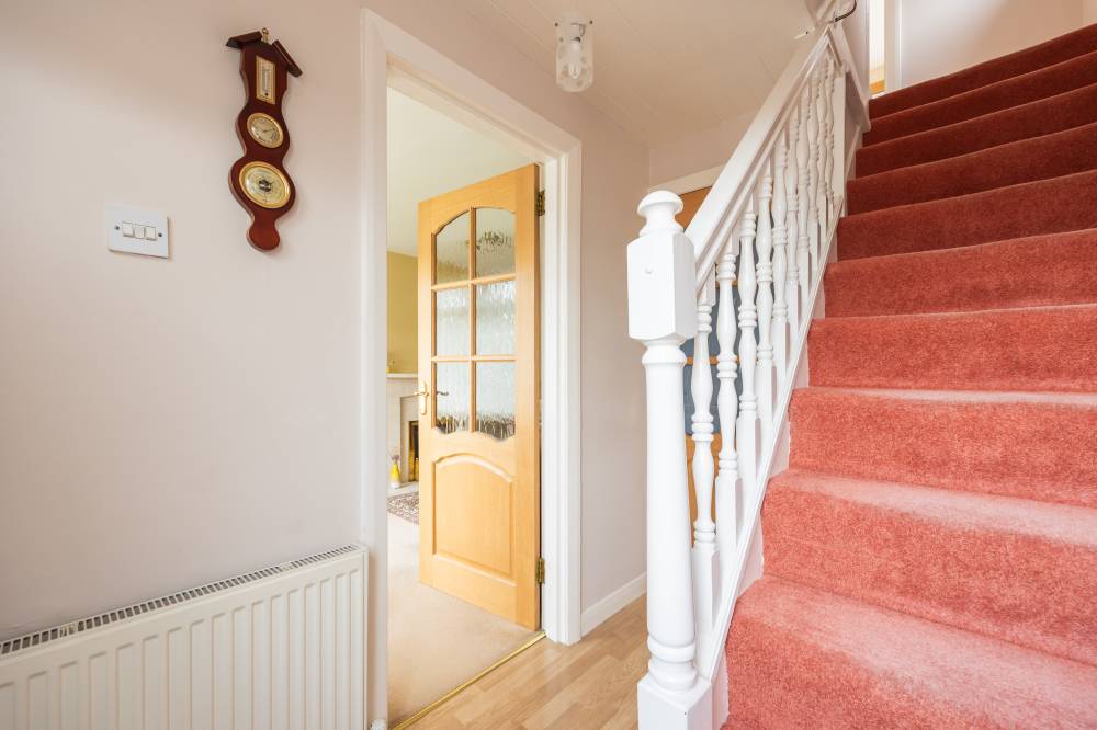 To the front of the house is a neatly kept lawned garden together with an extensive monobloc driveway and large single garage, providing excellent off-street parking/overspill storage. To the rear you have a substantial south facing private garden which has a lovely open feel and comprises lawn, chip beds, well stocked planted borders and a paved seating area.