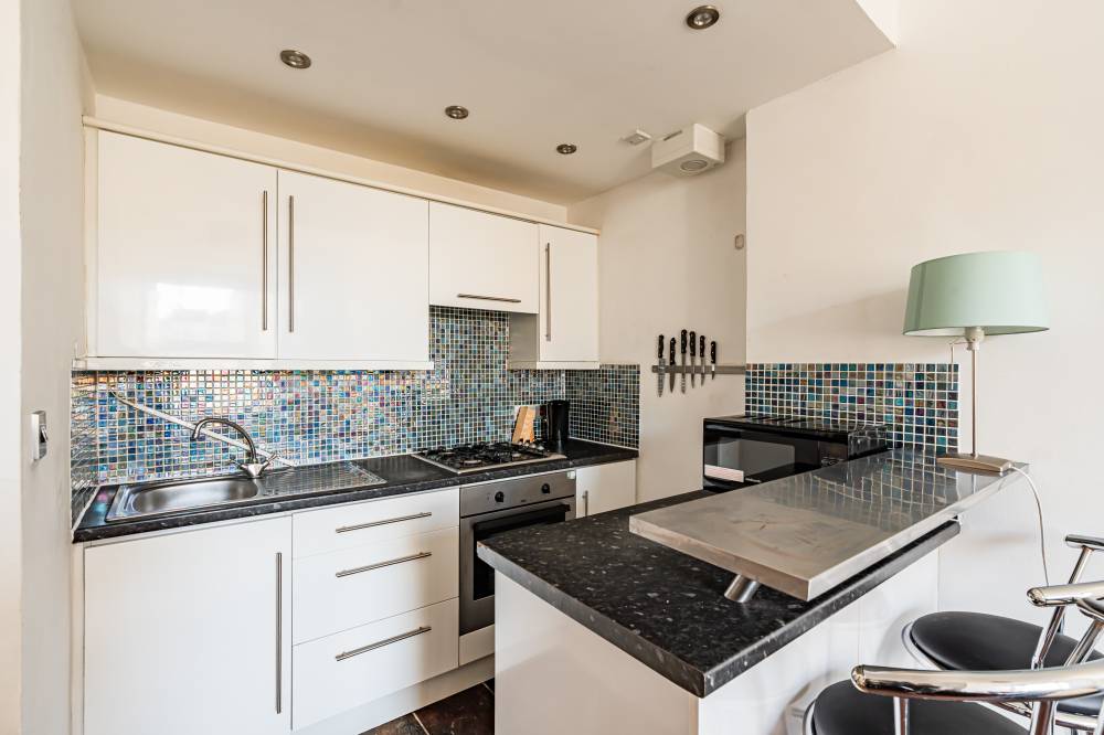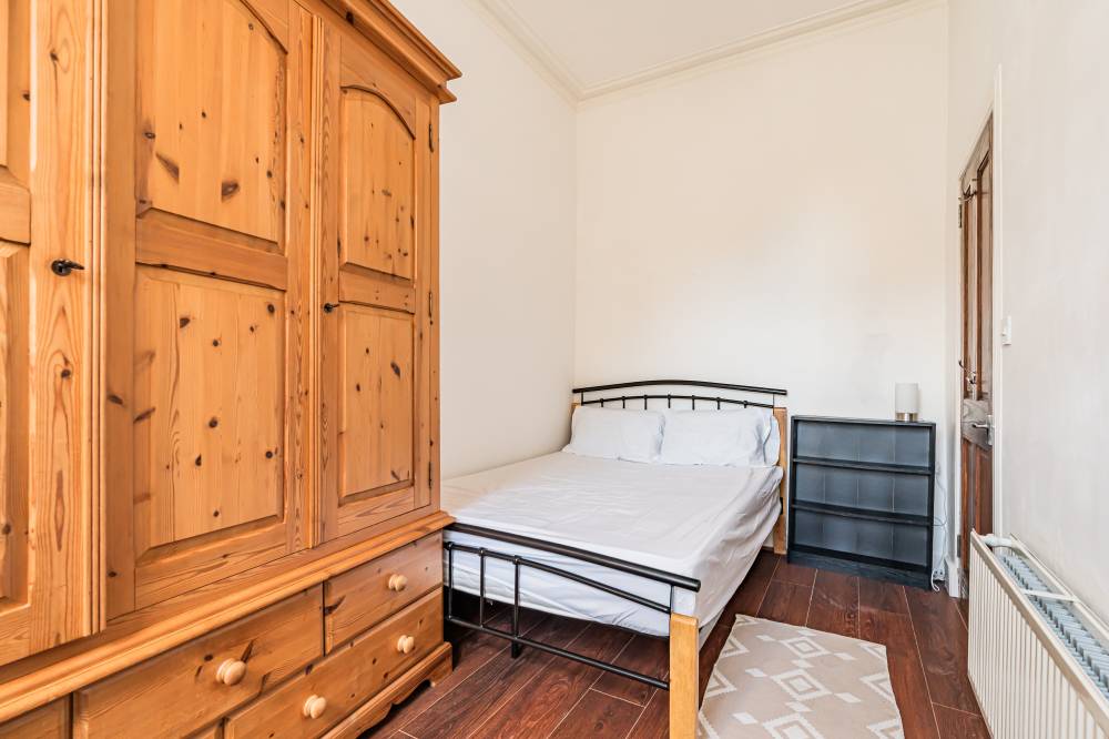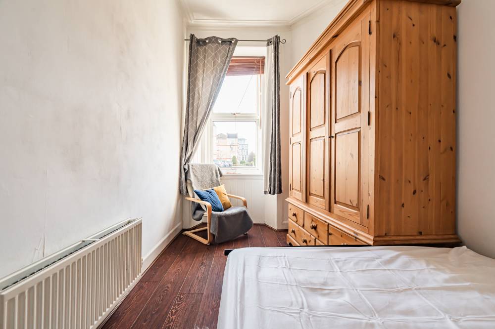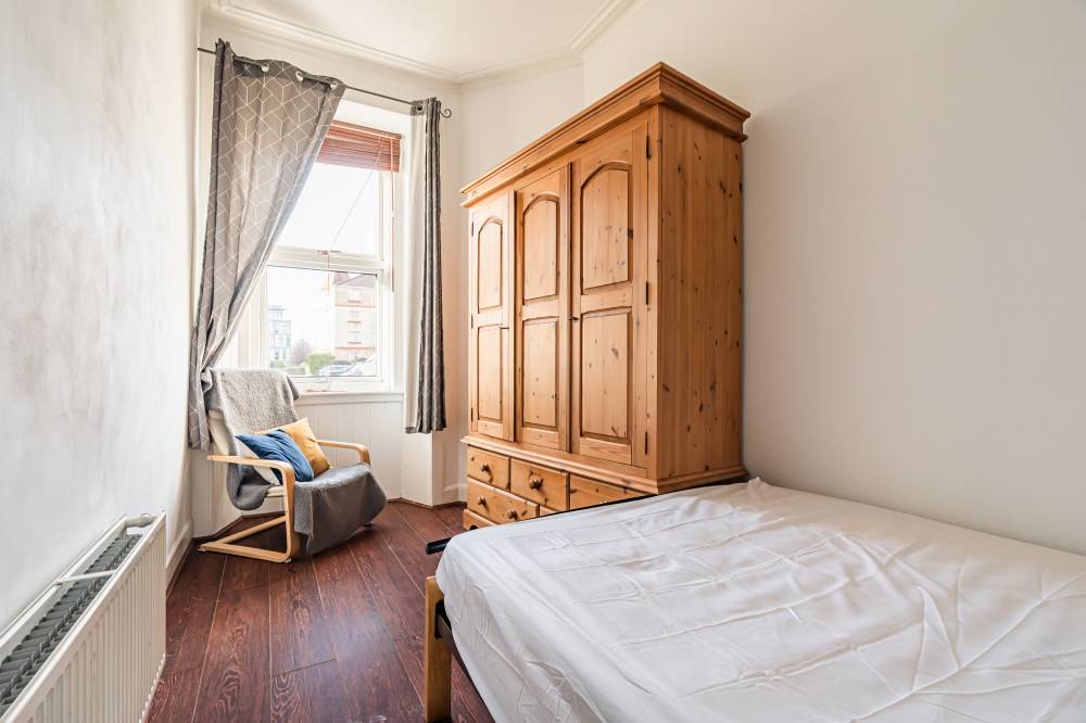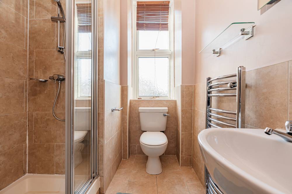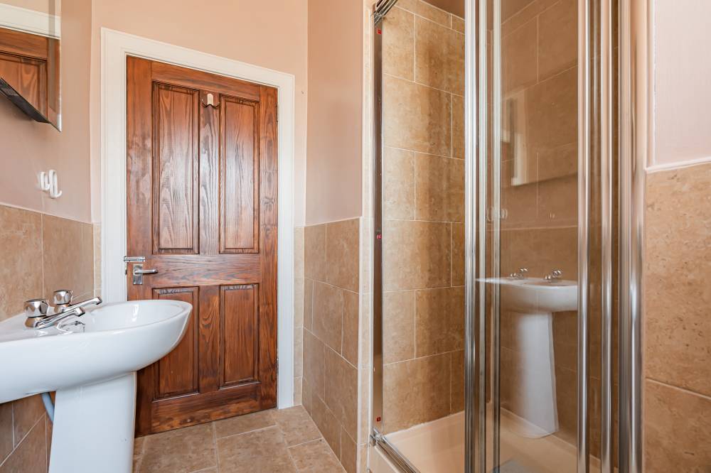 A welcoming entrance hallway leads into the heart of the home – a bright open-plan lounge/kitchen/diner. This well-designed space incorporates a range of integrated and freestanding white goods, a practical breakfast bar, partial tiling in splash areas, and under-unit lighting. Traditional character is retained with a shelved Edinburgh press, while a large pantry/utility cupboard provides excellent additional storage. The bedroom is a comfortable front-facing double room with ample space for freestanding furniture and flexible layout options. Completing the accommodation is a shower room featuring partial wall tiling, tiled flooring, a double shower cubicle, and a heated towel rail.