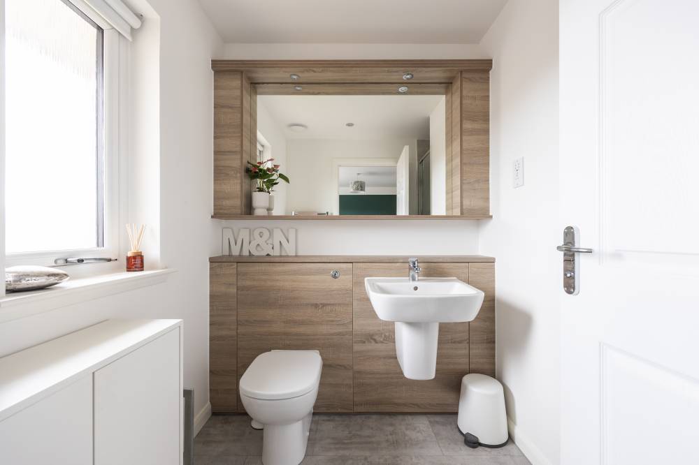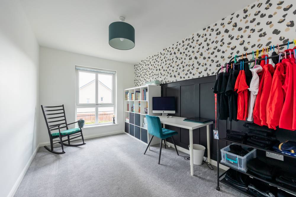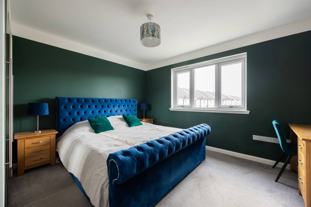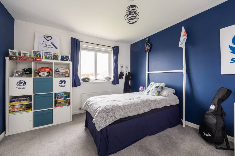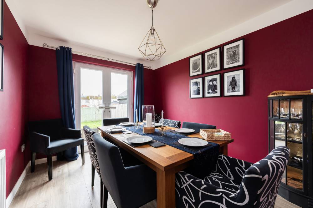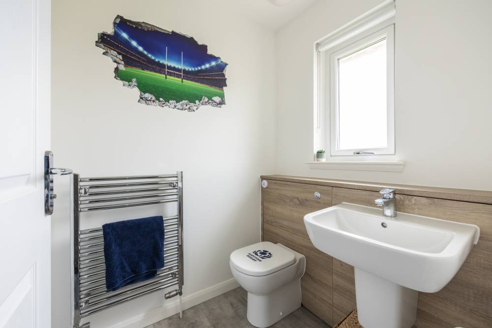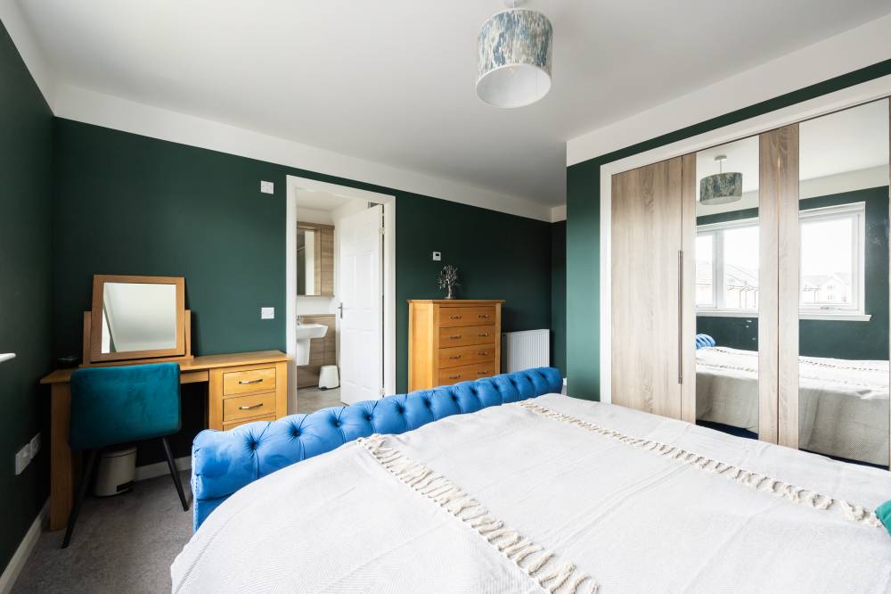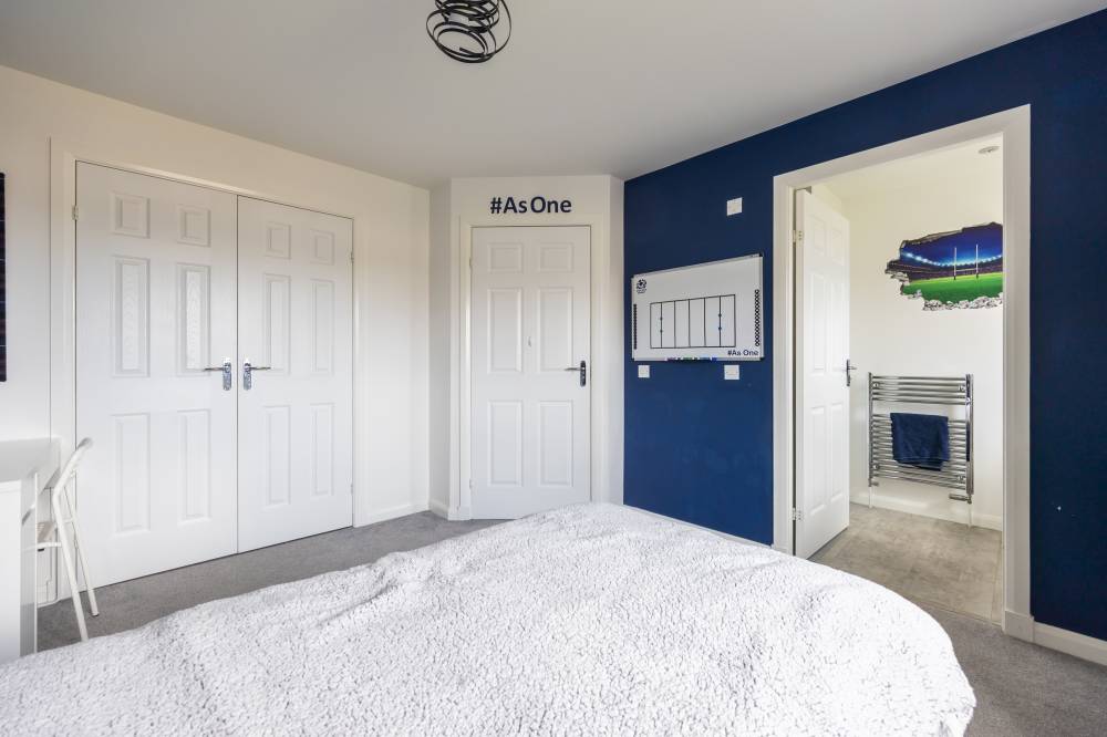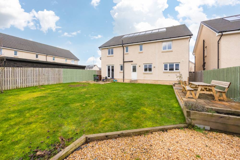 Constructed in 2019 by the highly regarded Scottish builder The Walker Group, this outstanding family home offers generous, flexible accommodation ideally suited to modern living, including working from home. Presented in true move-in condition, it combines all the advantages of a new-build property - peace of mind, fully resolved snagging, and the remainder of an NHBC warranty. The front door opens into a welcoming hallway with useful understair storage and direct access to the integral garage. To the front lies a spacious reception room, complemented by a second reception room currently used as a formal dining room, with French doors opening onto the rear garden. The impressive open-plan kitchen and family room forms the heart of the home, fitted with a contemporary range of wall and base units and integrated appliances including a five-burner gas hob, double oven and dishwasher, with an American-style fridge freezer included. A separate utility room, complete with washing machine, tumble dryer and garden access, sits off the kitchen, and a guest cloakroom/WC completes the ground floor. Upstairs, the generous landing provides excellent built-in storage and access to the loft. The principal bedroom enjoys a walk-in wardrobe/dressing room and a stylish en-suite shower room. Bedroom two, also a double, benefits from its own en-suite and built-in wardrobe. Three further double bedrooms, all with fitted wardrobes, are served by a spacious four-piece family bathroom featuring a separate walk-in shower. Additional benefits include gas central heating, full double glazing and solar panels, ensuring comfort and energy efficiency throughout the year.