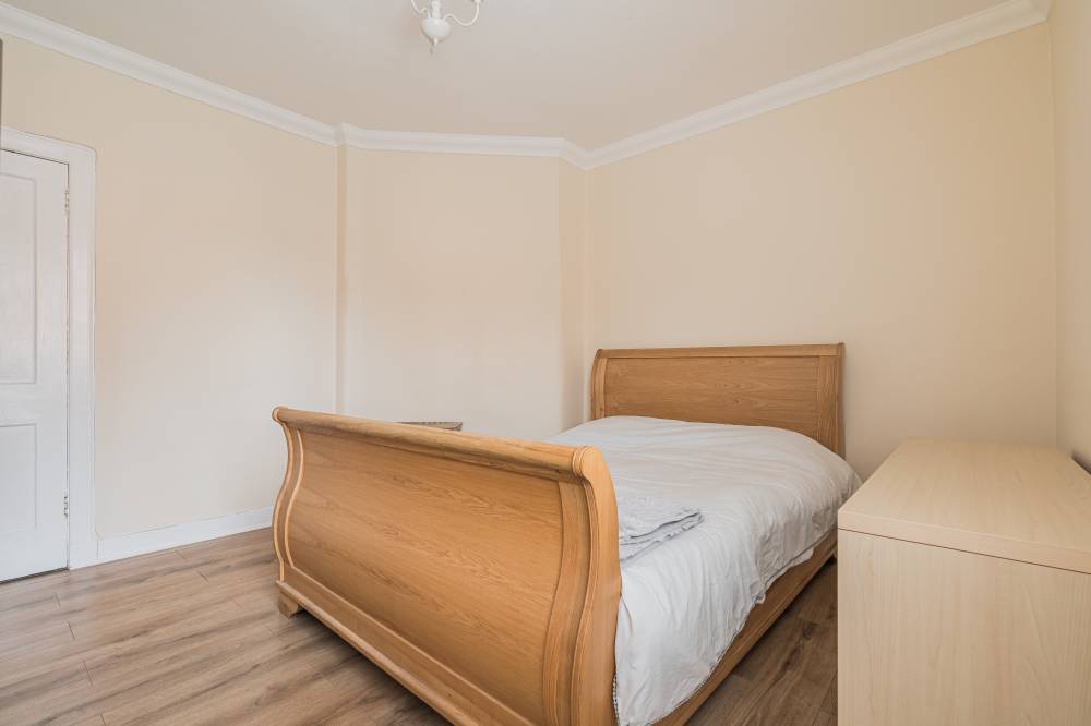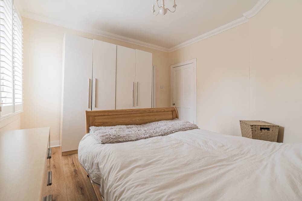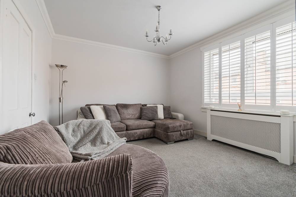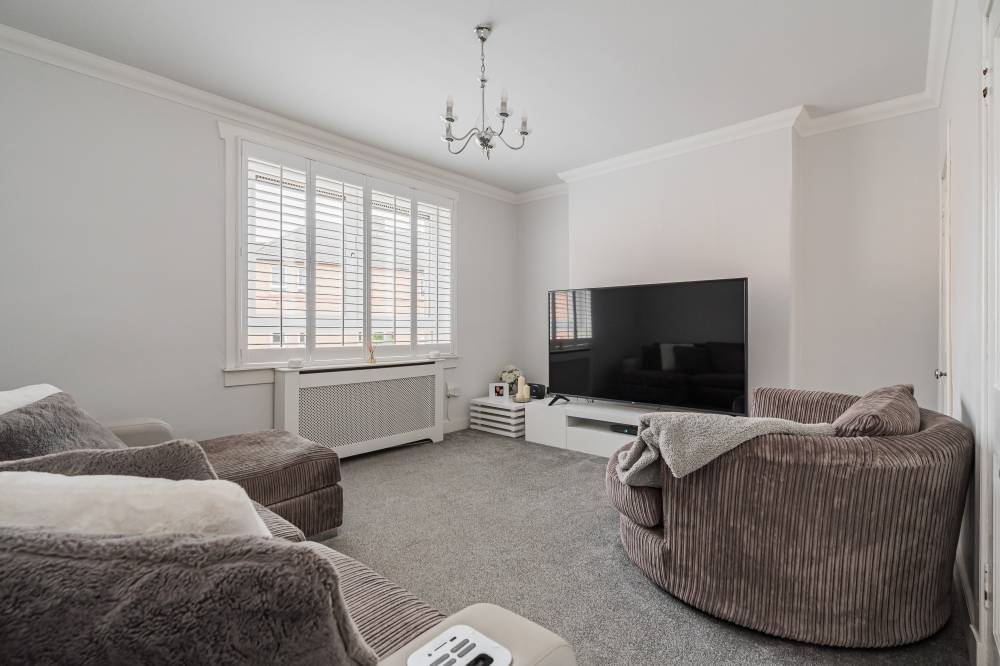 The accommodation is presented in good decorative order throughout, offering a genuine move-in-ready opportunity. A welcoming hallway provides access to all rooms and benefits from two convenient shelved storage cupboards. The bright and generously sized reception room enjoys a pleasant front-facing aspect and is finished in modern, neutral décor with carpeted flooring and window shutters. Built-in storage enhances the space, making it ideal for both relaxing and entertaining. The kitchen is well appointed with contemporary high-gloss wall and base units, complemented by integrated appliances including a newly installed hob, oven along with a fridge freezer. A breakfast bar provides an informal dining option and adds to the kitchen’s practicality. There are two well-proportioned double bedrooms, one positioned to the front of the property and the other to the quiet rear, overlooking the communal gardens. Both rooms feature laminate flooring and offer ample space for freestanding bedroom furniture. The modern bathroom is fully tiled and fitted with a crisp white two-piece suite. Additional features include vanity storage, a heated chrome towel rail and a glass shower cubicle housing a thermostatic shower.