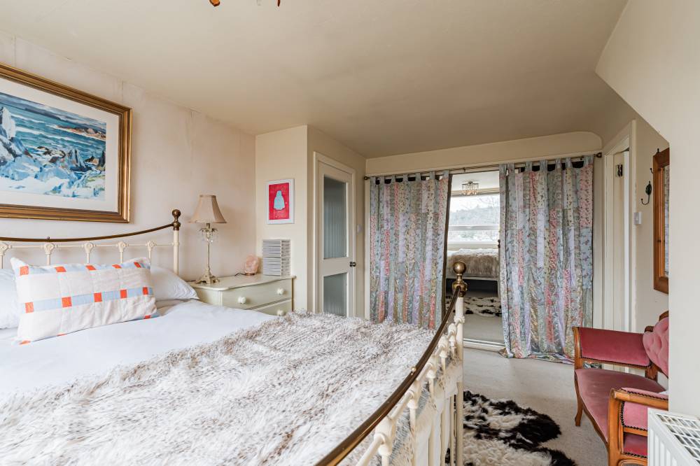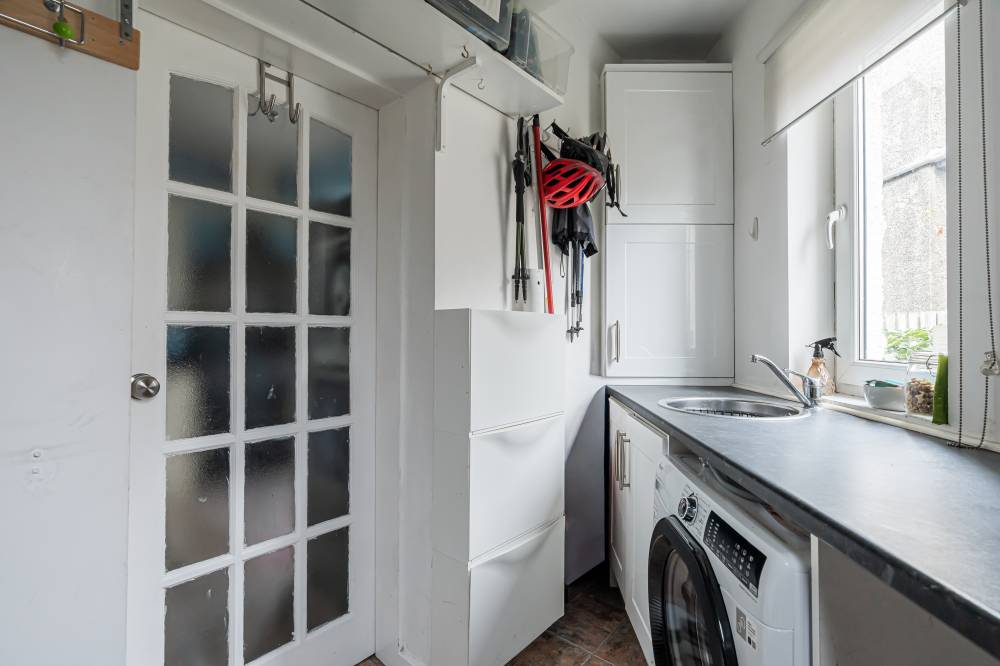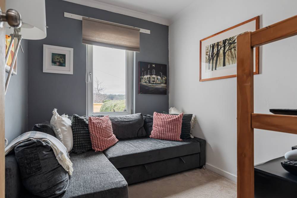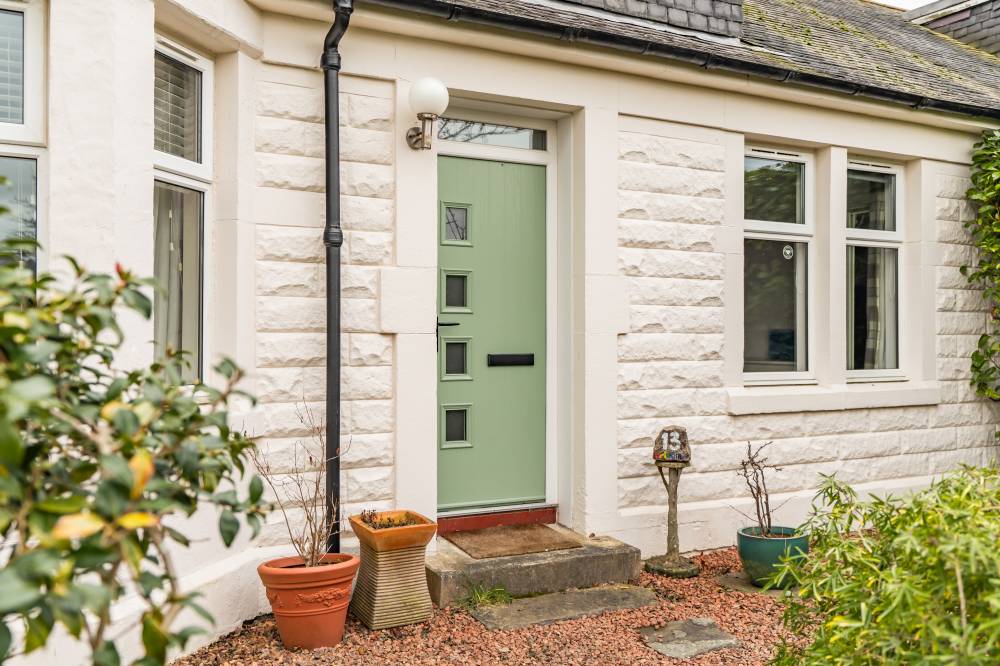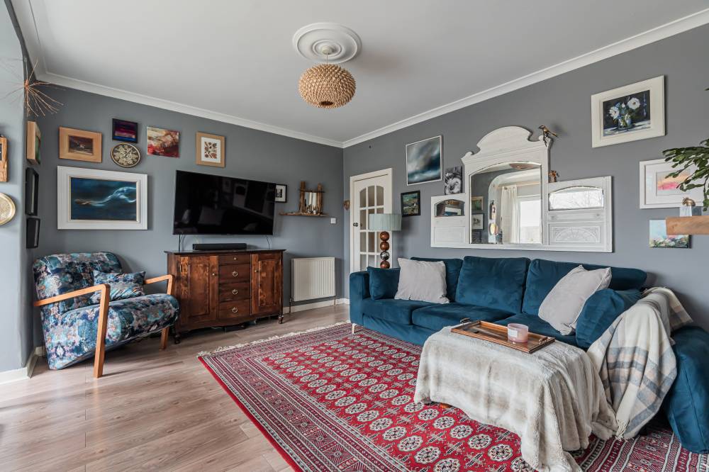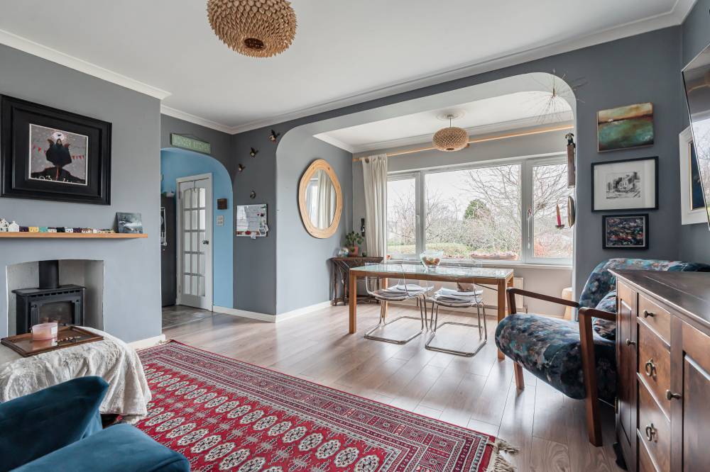 The house is set back from the street by generous garden ground with bespoke gates and a mature hedge affording a high degree of privacy. The spacious and flexible accommodation can be configured a number of ways to suit individual needs with a choice of bedrooms and reception rooms, ideal for family life or for those looking for space to work from home, further enhanced by a garden studio pod with power and light, ideal as a home office, workshop, hobby space or art studio. Over two floors, the accommodation briefly comprises: welcoming vestibule and hallway, spacious open plan reception/dining room with fireplace housing a gas flame effect stove, triple window overlooking the garden and beyond and archway to the kitchen/breakfast room, creating a sociable connection between the two spaces, ideal for both family life and entertaining. The kitchen is fitted with a good range of wall and base units with breakfasting bar, range cooker and dishwasher included in the sale. A separate utility room offers further useful storage space and has a door to the rear garden. The washing machine and freezer are also included in the sale. Two generous double bedrooms overlook the garden to the front of the property, one with a large bay window which could easily be used as a formal reception room if desired. A further bedroom or snug is located on ground floor level and there is a smart family bathroom with white suite and over bath shower. Upstairs, the principal bedroom enjoys open views towards Corstorphine Hill and has built-in wardrobes and an en-suite bathroom with spa bath and over bath shower. There is a useful dressing room offering ample additional storage space and a further bedroom, currently in use as an artist’s studio, with dormer window to the front and two walk-in storage spaces in to the eaves. Further benefits include gas central heating and full double glazing and there is additional cellar storage space accessed to the rear.