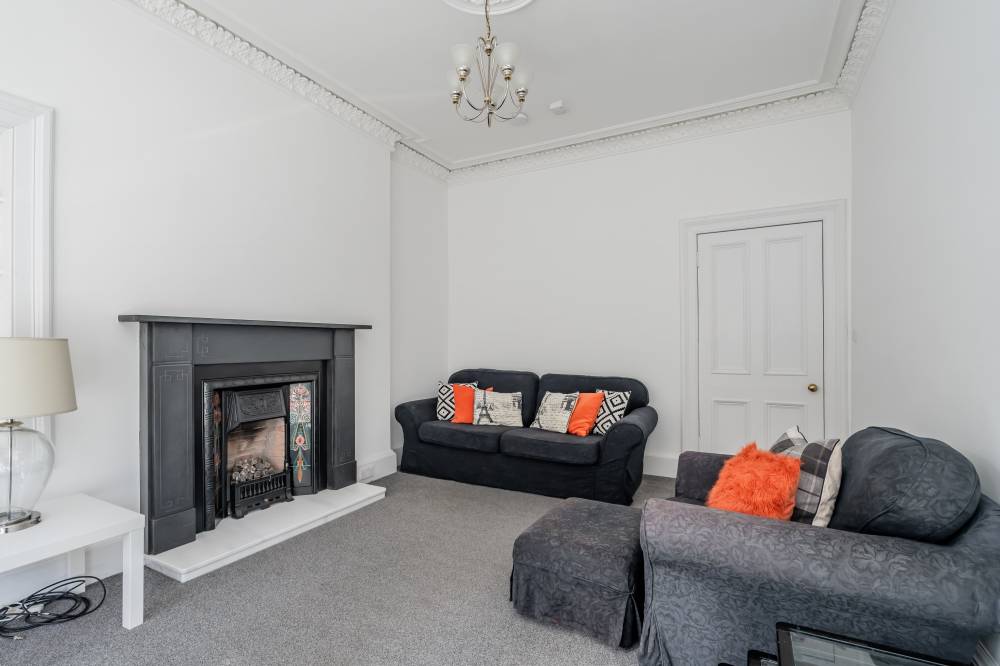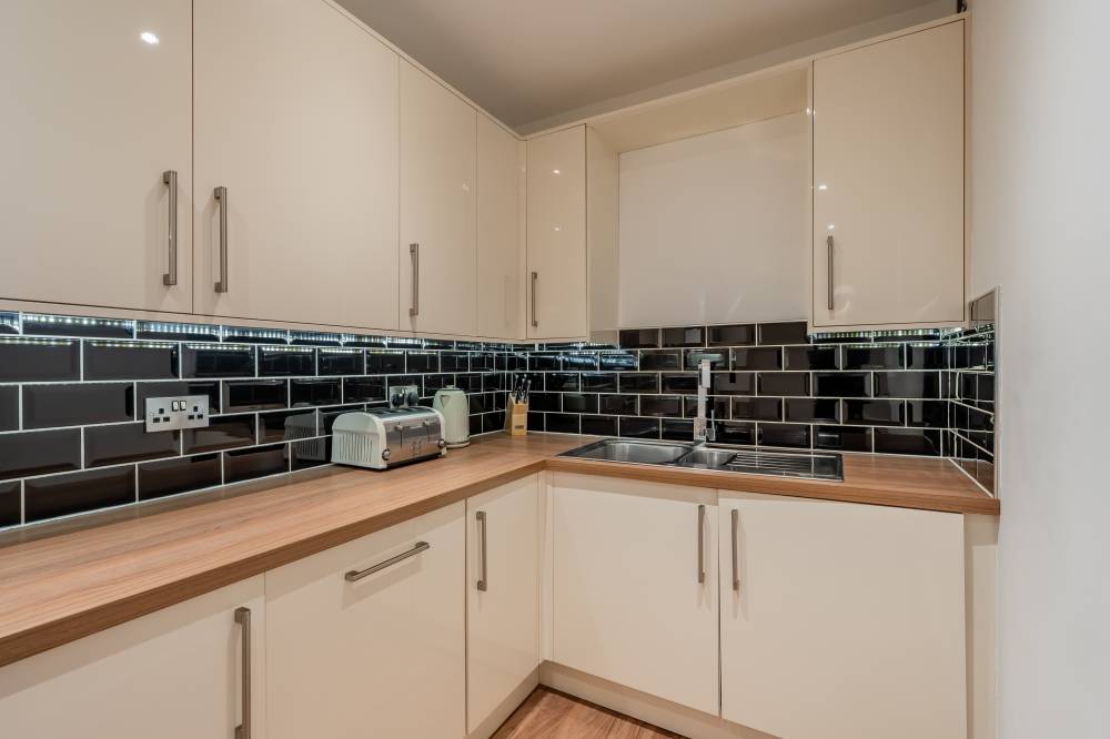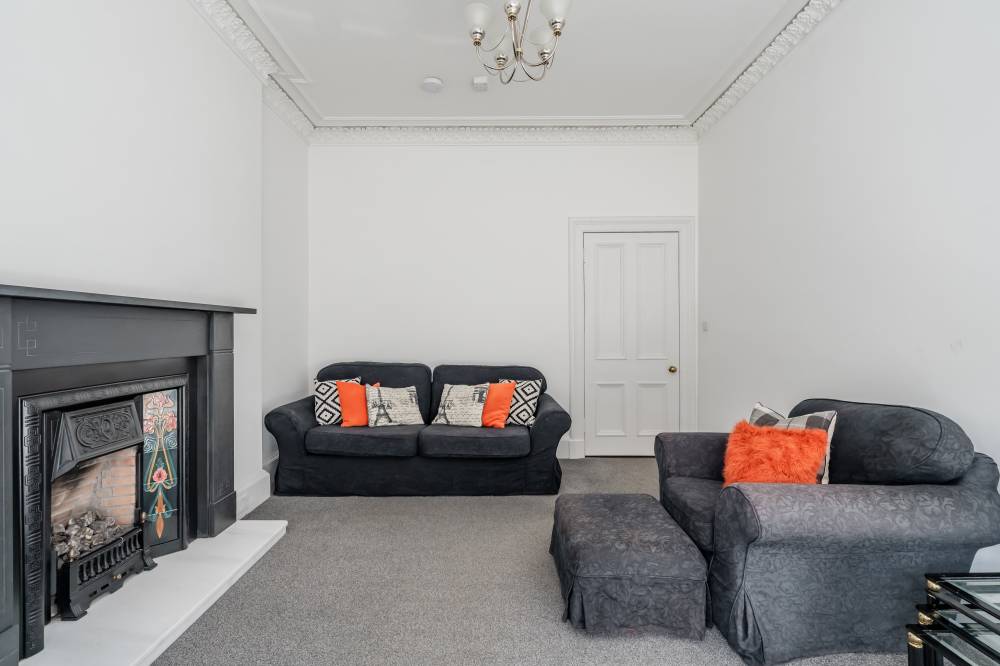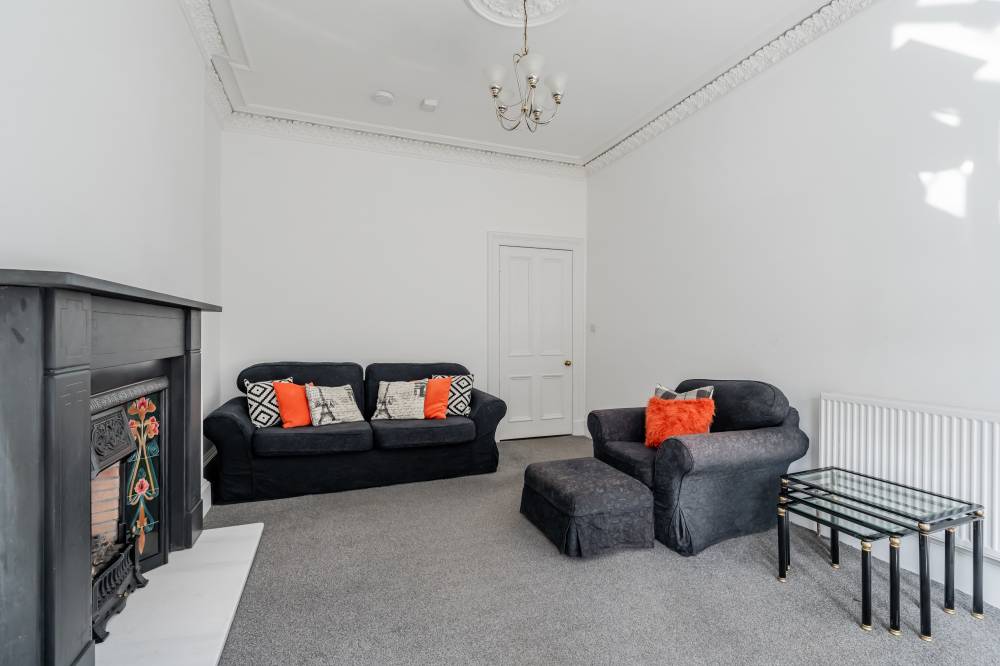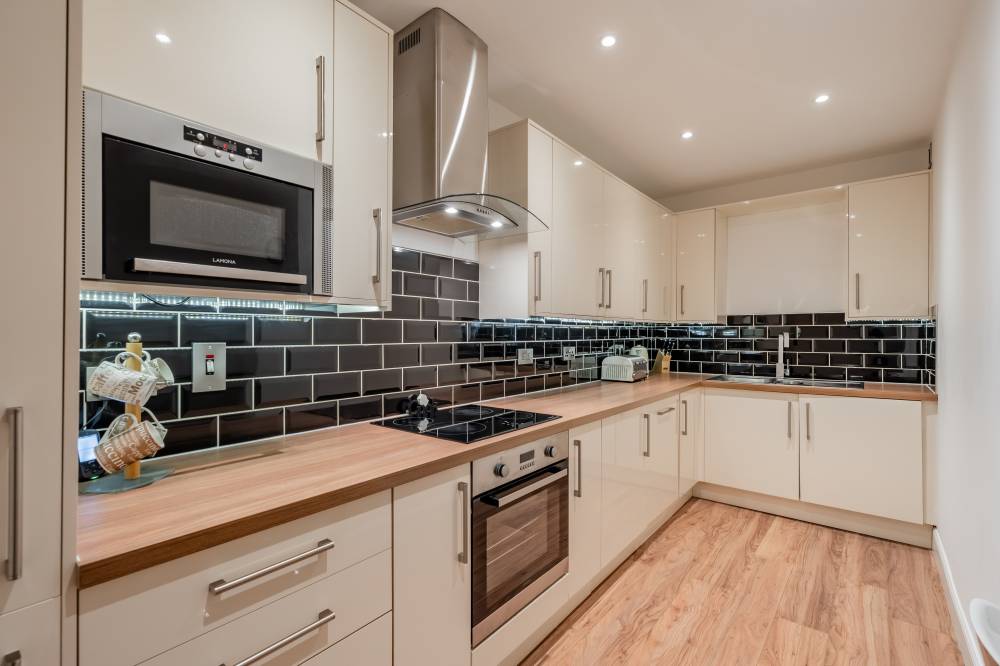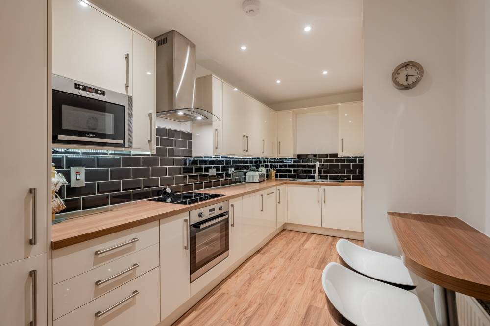 The accommodation is accessed via a welcoming hallway which provides useful storage provisions and access to all rooms. To the front of the property is an impressive bay-windowed reception room, filled with natural light and showcasing attractive original features including ornate cornicing, a decorative ceiling rose and an elegant fireplace. Soft carpeted flooring completes this inviting living space. The stylish kitchen is well equipped with an excellent range of contemporary wall and base units, complemented by a breakfast bar ideal for casual dining. Black subway tiling adds a modern edge to the splashback areas, while integrated appliances include a hob, oven, fridge freezer, dishwasher and washer/dryer, ensuring a sleek and functional finish. There are two well-presented double bedrooms, both enjoying a peaceful rear-facing aspect away from the main street, providing calm and comfortable accommodation. The bathroom is fitted with a white three-piece suite, featuring a shower over the bath and tiled surrounds.
