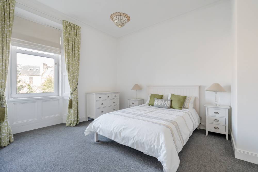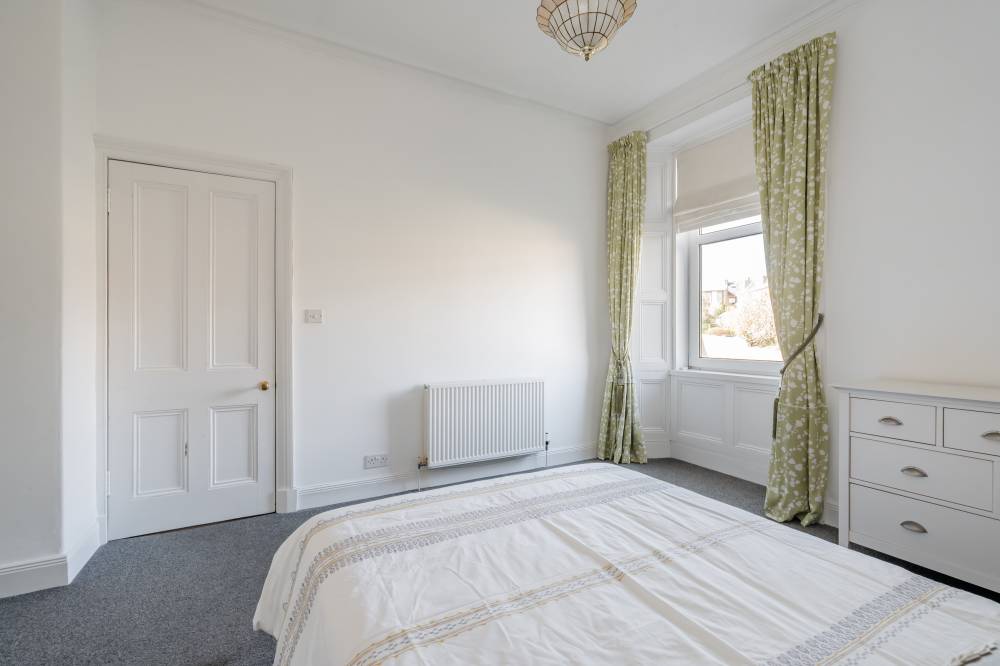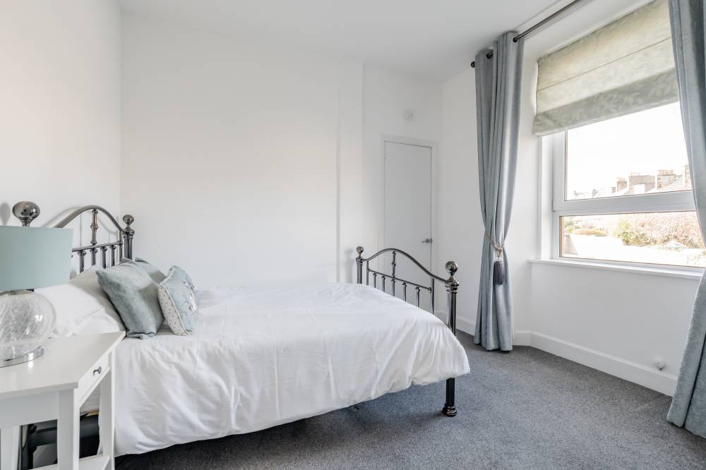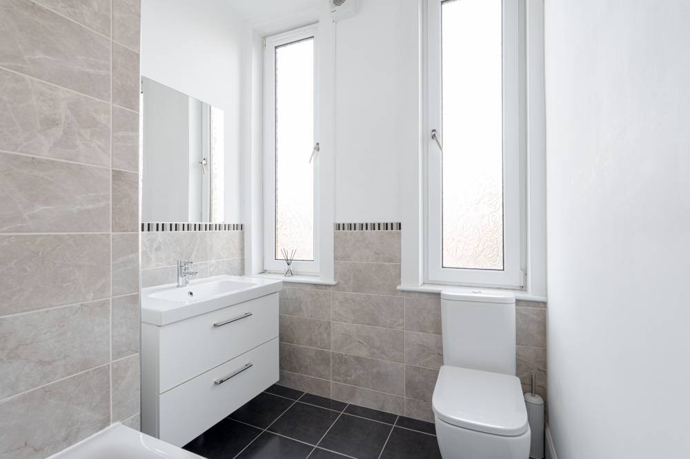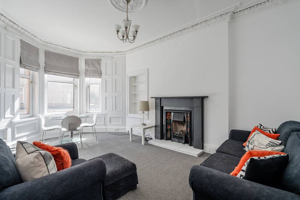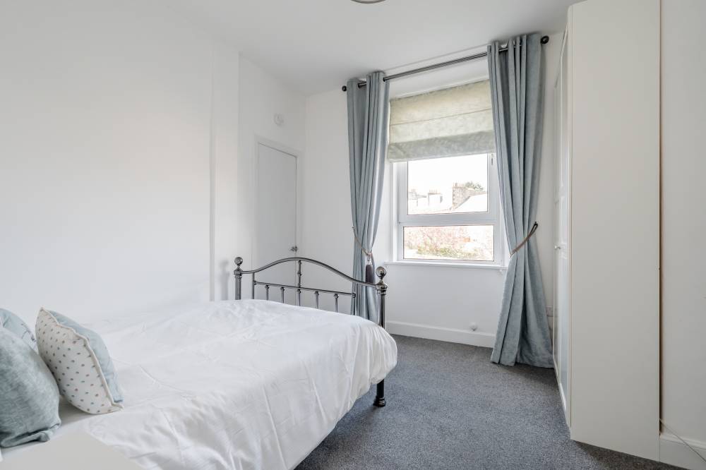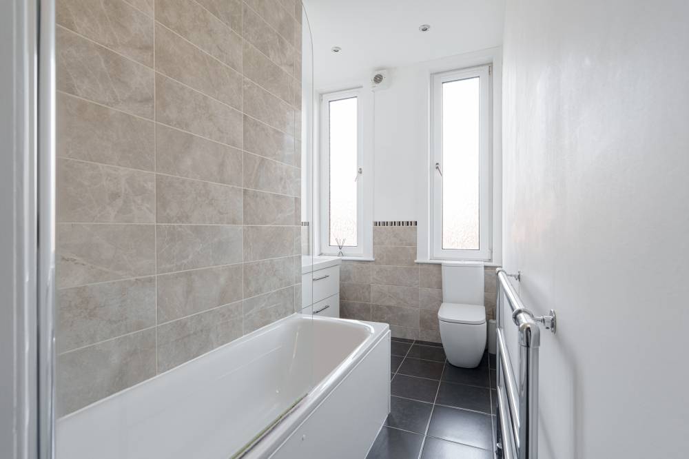 The accommodation is accessed via a welcoming hallway which provides useful storage provisions and access to all rooms. To the front of the property is an impressive bay-windowed reception room, filled with natural light and showcasing attractive original features including ornate cornicing, a decorative ceiling rose and an elegant fireplace. Soft carpeted flooring completes this inviting living space. The stylish kitchen is well equipped with an excellent range of contemporary wall and base units, complemented by a breakfast bar ideal for casual dining. Black subway tiling adds a modern edge to the splashback areas, while integrated appliances include a hob, oven, fridge freezer, dishwasher and washer/dryer, ensuring a sleek and functional finish. There are two well-presented double bedrooms, both enjoying a peaceful rear-facing aspect away from the main street, providing calm and comfortable accommodation. The bathroom is fitted with a white three-piece suite, featuring a shower over the bath and tiled surrounds.