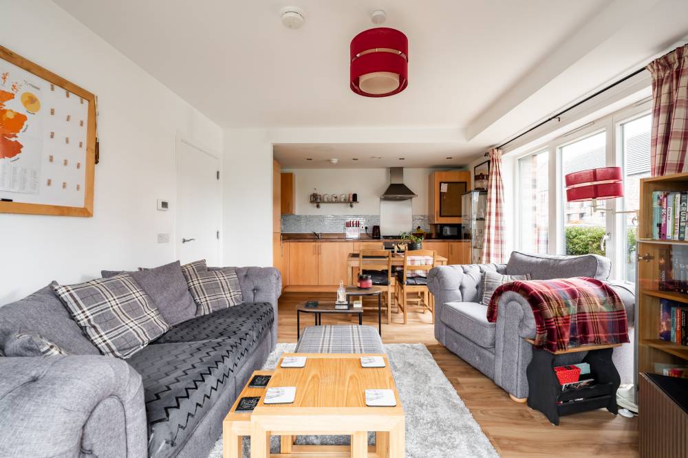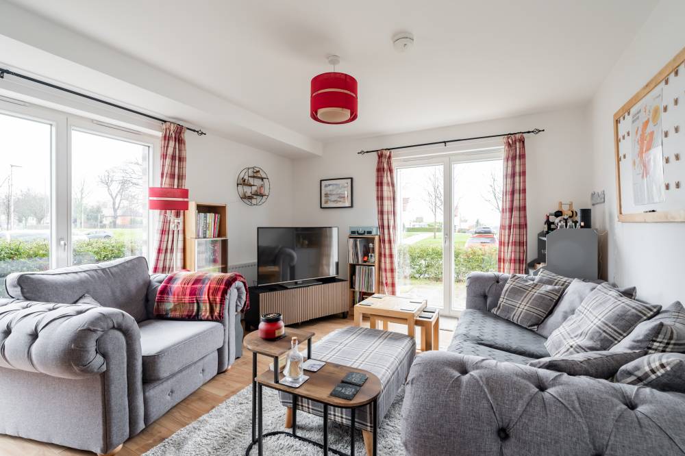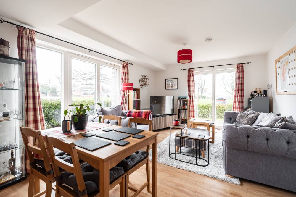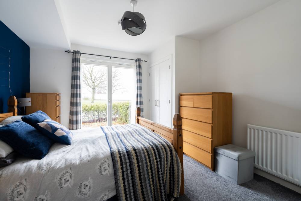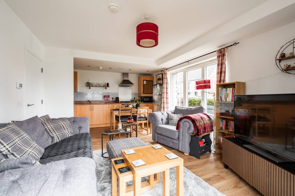 The accommodation is entered via a welcoming hallway which benefits from an excellent amount of built-in storage. The heart of the home is the bright open-plan living space, incorporating lounge, dining and kitchen areas. The lounge and dining space enjoy an abundance of natural light and direct access to the patio via two sets of French doors, creating a seamless connection between indoor and outdoor living. The modern kitchen is fitted with a range of wall and base units and includes integrated appliances, offering both style and practicality. The principal bedroom is a spacious double room and features built-in wardrobes, direct access to the patio through a glazed door, and an en-suite shower room fitted with a white two-piece suite and a glass shower enclosure with electric shower. The second bedroom is also a well-proportioned double, benefiting from built-in wardrobe space and patio access. Completing the accommodation is a bathroom fitted with a crisp white three-piece suite, a mains shower over the bath, and tiling to splash areas.