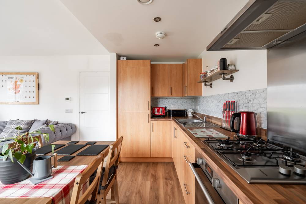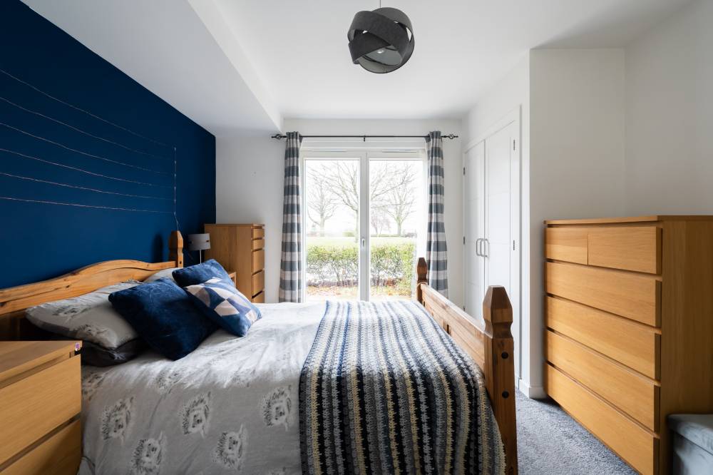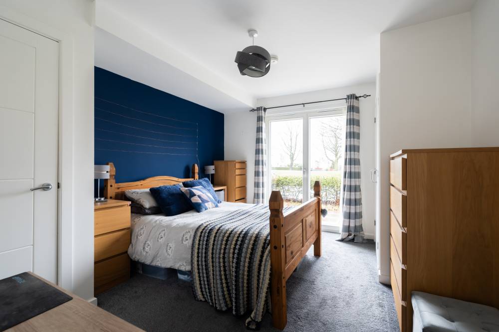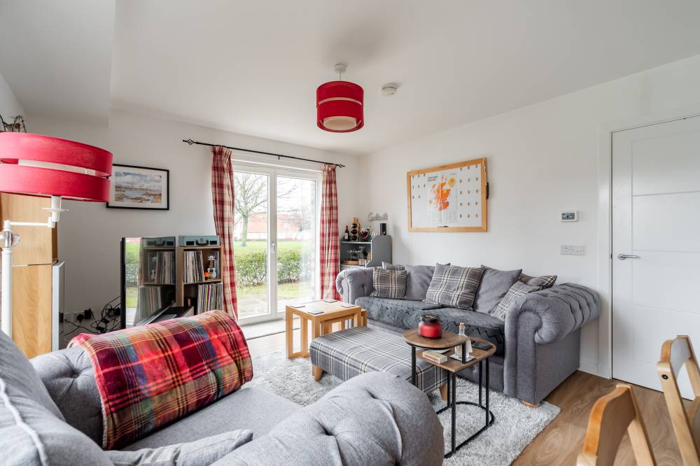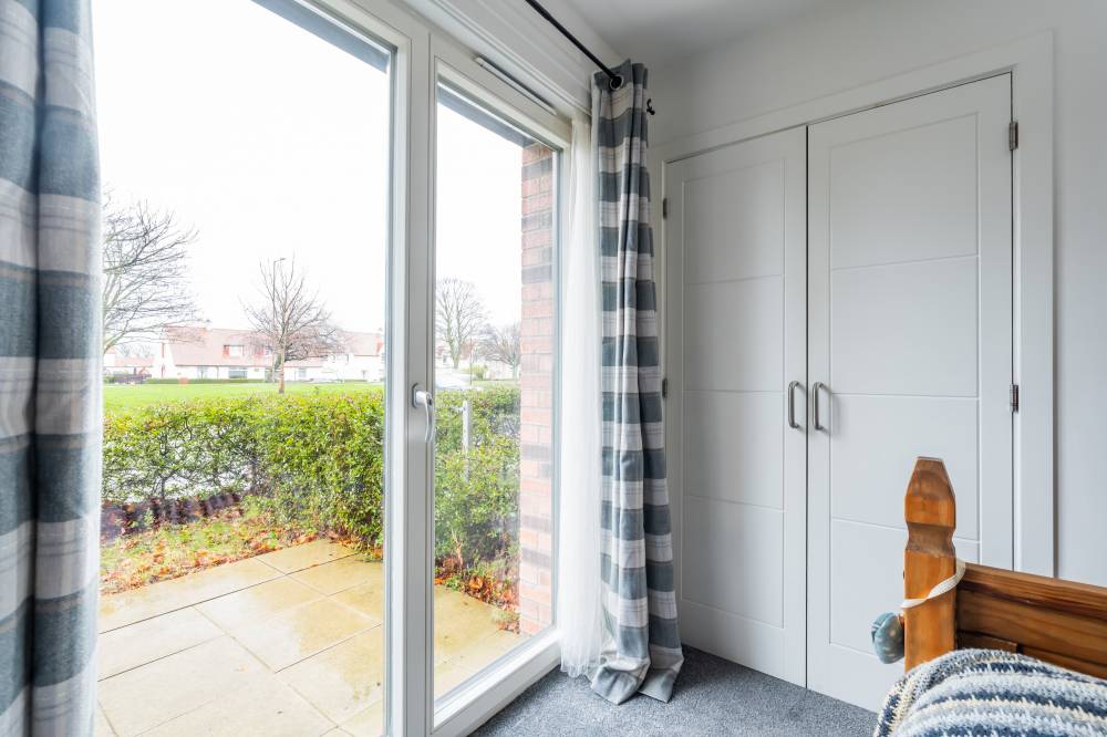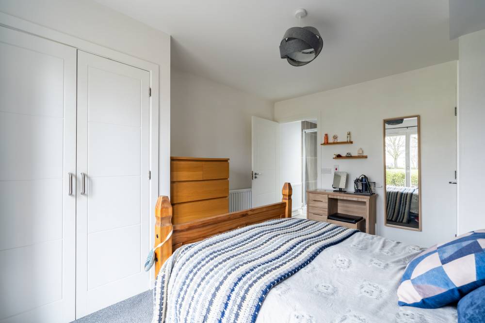 The accommodation is entered via a welcoming hallway which benefits from an excellent amount of built-in storage. The heart of the home is the bright open-plan living space, incorporating lounge, dining and kitchen areas. The lounge and dining space enjoy an abundance of natural light and direct access to the patio via two sets of French doors, creating a seamless connection between indoor and outdoor living. The modern kitchen is fitted with a range of wall and base units and includes integrated appliances, offering both style and practicality. The principal bedroom is a spacious double room and features built-in wardrobes, direct access to the patio through a glazed door, and an en-suite shower room fitted with a white two-piece suite and a glass shower enclosure with electric shower. The second bedroom is also a well-proportioned double, benefiting from built-in wardrobe space and patio access. Completing the accommodation is a bathroom fitted with a crisp white three-piece suite, a mains shower over the bath, and tiling to splash areas.
