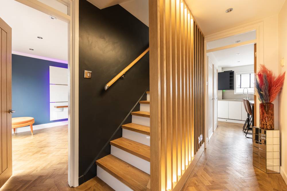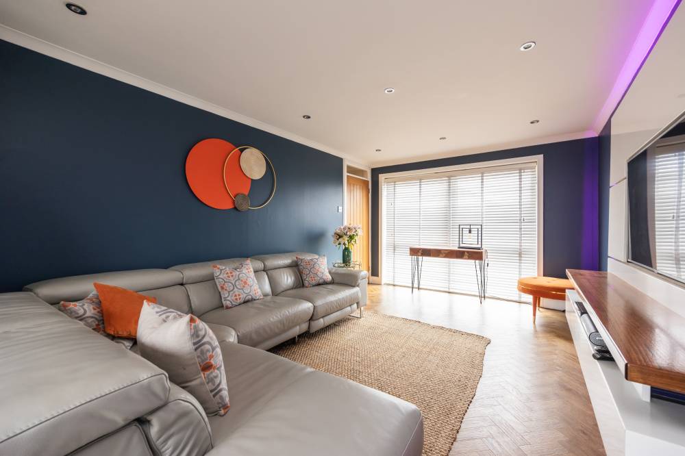 A welcoming entrance hallway provides access to a handy walk-in box room offering excellent storage. The bright and spacious lounge/diner enjoys a dual aspect outlook and is finished with a striking feature media wall complete with integrated lighting, creating a stylish focal point for relaxing and entertaining. The stunning kitchen diner, completed in 2024, is finished to a high standard and features a range of integrated white goods, mood-setting under-unit and kickboard lighting, stylish splashback panelling, and two useful built-in storage cupboards, making this an ideal space for everyday living and hosting. A convenient two-piece WC completes the ground floor accommodation. On the first floor, the landing provides access to four well-proportioned bedrooms. The principal bedroom is a front-facing double with integrated mirrored sliding wardrobes. Bedroom two is another generous front-facing double, with both rooms offering ample space for freestanding furniture and flexible layout options. Bedroom three is a rear-facing double, while bedroom four is a large single room offering optional use as a nursery or home office. The sleek family bathroom is finished with partially tiled walls, tiled flooring and a rainfall shower over bath.