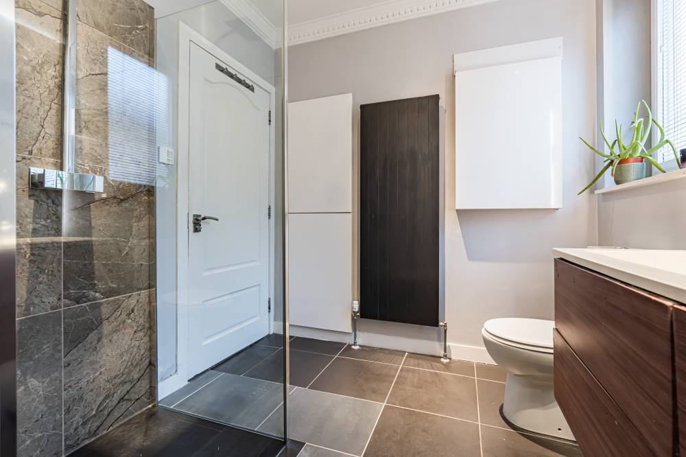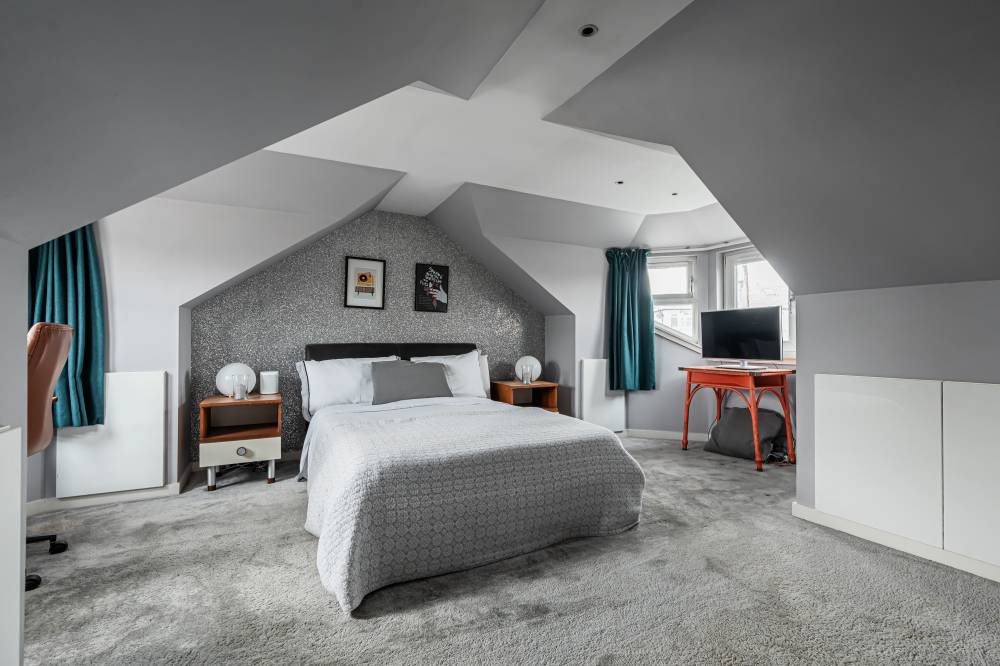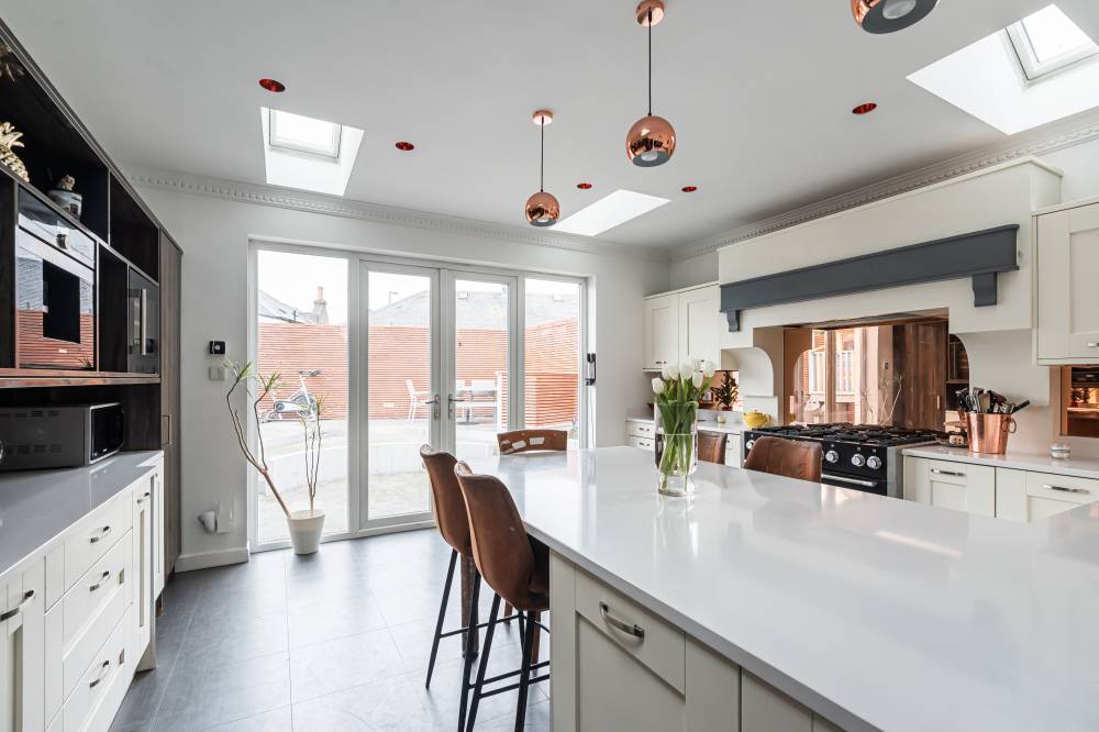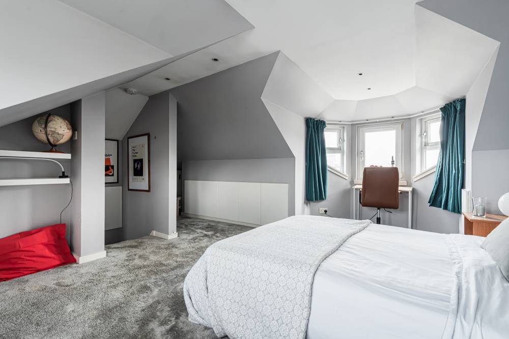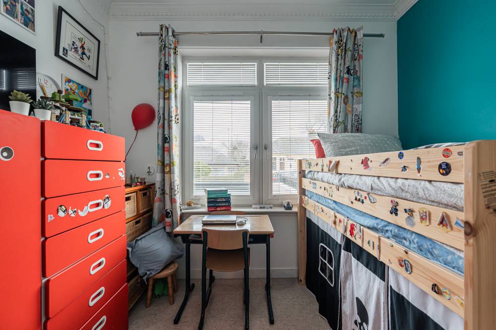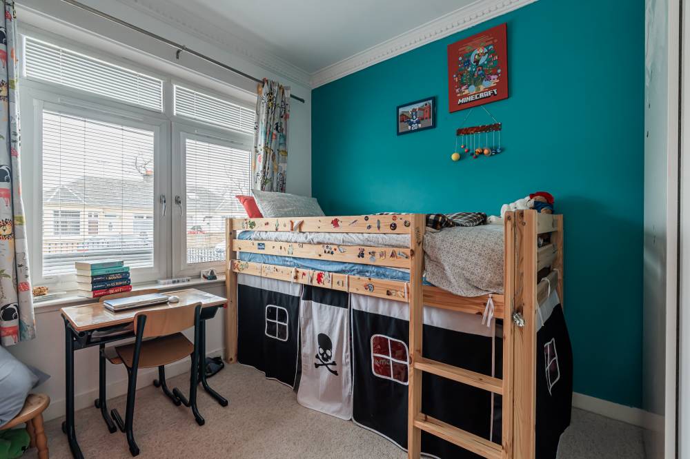 The property has been comprehensively upgraded and reconfigured to an exceptional standard, creating a luxurious and flexible family home finished with quality fittings throughout. Internally, the accommodation is both spacious and beautifully presented. The welcoming entrance hallway includes a useful utility cupboard, while the elegant bay-windowed lounge provides a bright and comfortable living space. To the rear, the heart of the home is the impressive contemporary kitchen, fitted with sleek modern units, integrated appliances including a wine fridge and coffee machine, and a central breakfast bar island. Flooded with natural light via four electric roof windows, the kitchen offers direct access to the private rear garden, making it ideal for everyday family living and entertaining alike. The ground floor also hosts a generous double bedroom with built-in wardrobes, a further well-proportioned single bedroom to the front, and a stunning family bathroom. The bathroom is finished to a high specification and features a luxurious sunken spa bath, walk-in shower and twin “his and hers” wash hand basins set within a stylish vanity unit. A carpeted staircase leads to the upper level, where the impressive dual-aspect principal bedroom enjoys excellent built-in storage and breathtaking open views towards Arthur’s Seat.