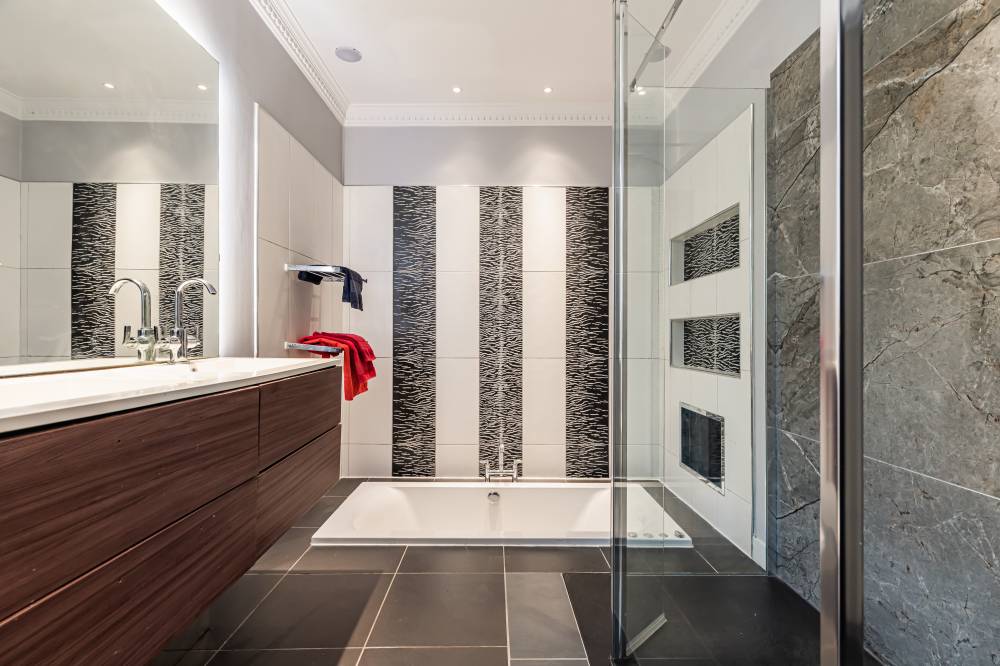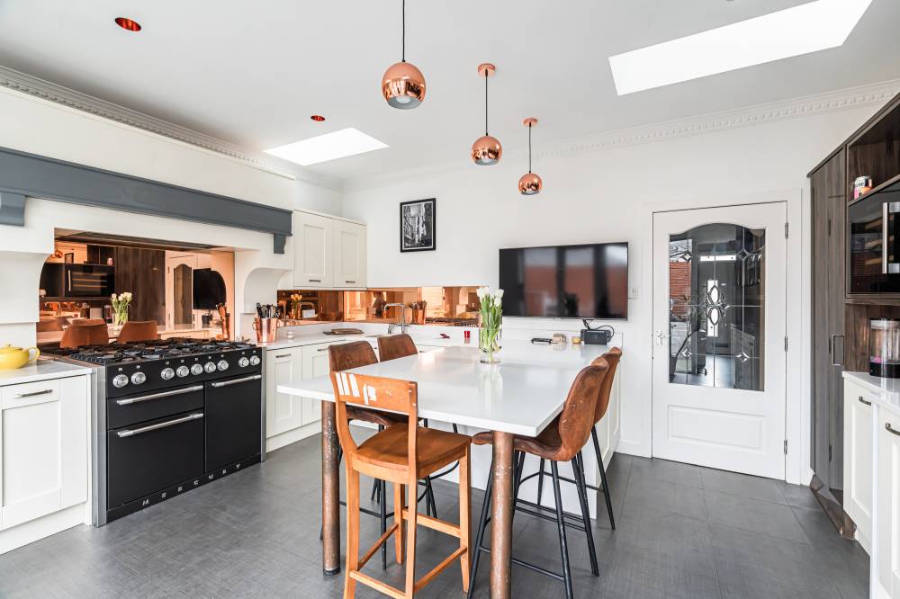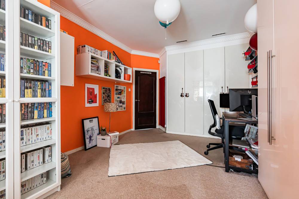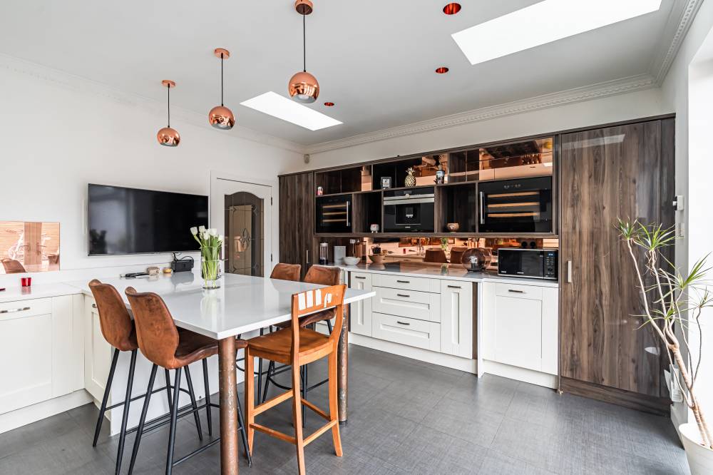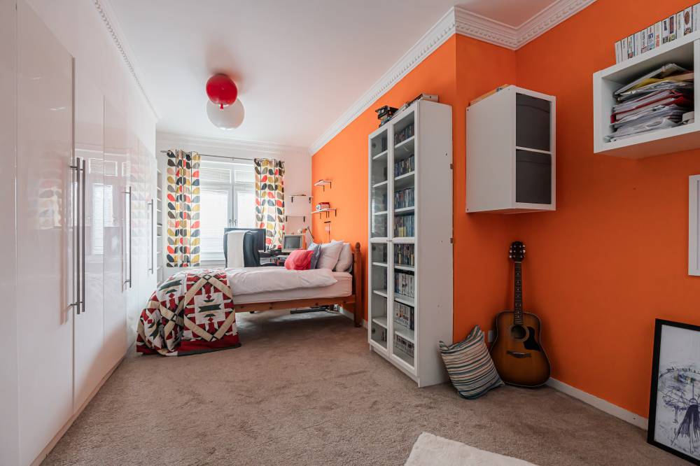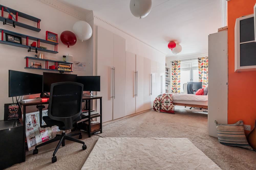 The property has been comprehensively upgraded and reconfigured to an exceptional standard, creating a luxurious and flexible family home finished with quality fittings throughout. Internally, the accommodation is both spacious and beautifully presented. The welcoming entrance hallway includes a useful utility cupboard, while the elegant bay-windowed lounge provides a bright and comfortable living space. To the rear, the heart of the home is the impressive contemporary kitchen, fitted with sleek modern units, integrated appliances including a wine fridge and coffee machine, and a central breakfast bar island. Flooded with natural light via four electric roof windows, the kitchen offers direct access to the private rear garden, making it ideal for everyday family living and entertaining alike. The ground floor also hosts a generous double bedroom with built-in wardrobes, a further well-proportioned single bedroom to the front, and a stunning family bathroom. The bathroom is finished to a high specification and features a luxurious sunken spa bath, walk-in shower and twin “his and hers” wash hand basins set within a stylish vanity unit. A carpeted staircase leads to the upper level, where the impressive dual-aspect principal bedroom enjoys excellent built-in storage and breathtaking open views towards Arthur’s Seat.