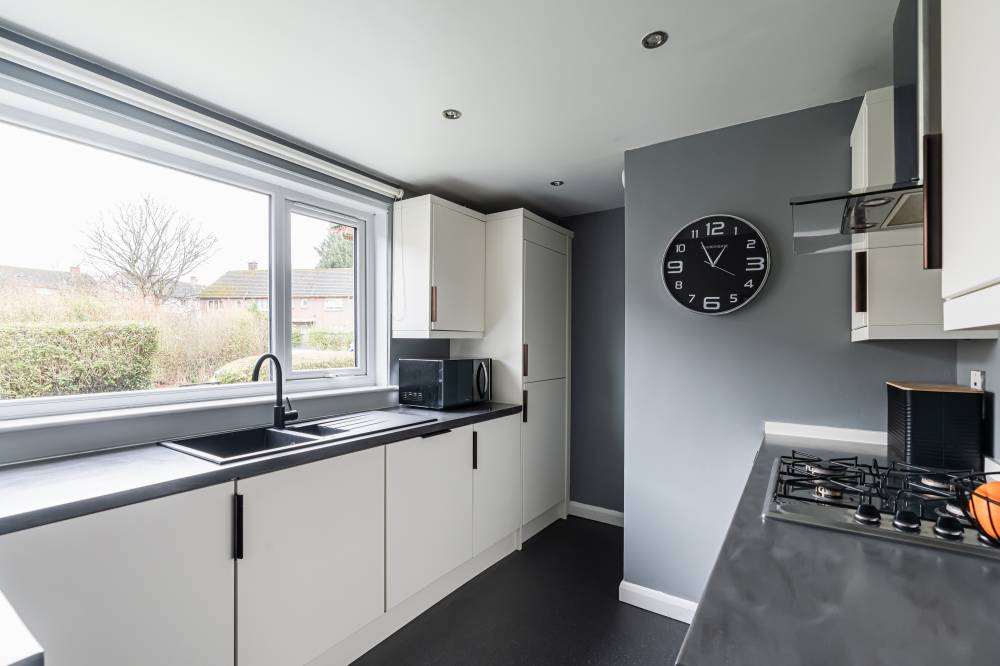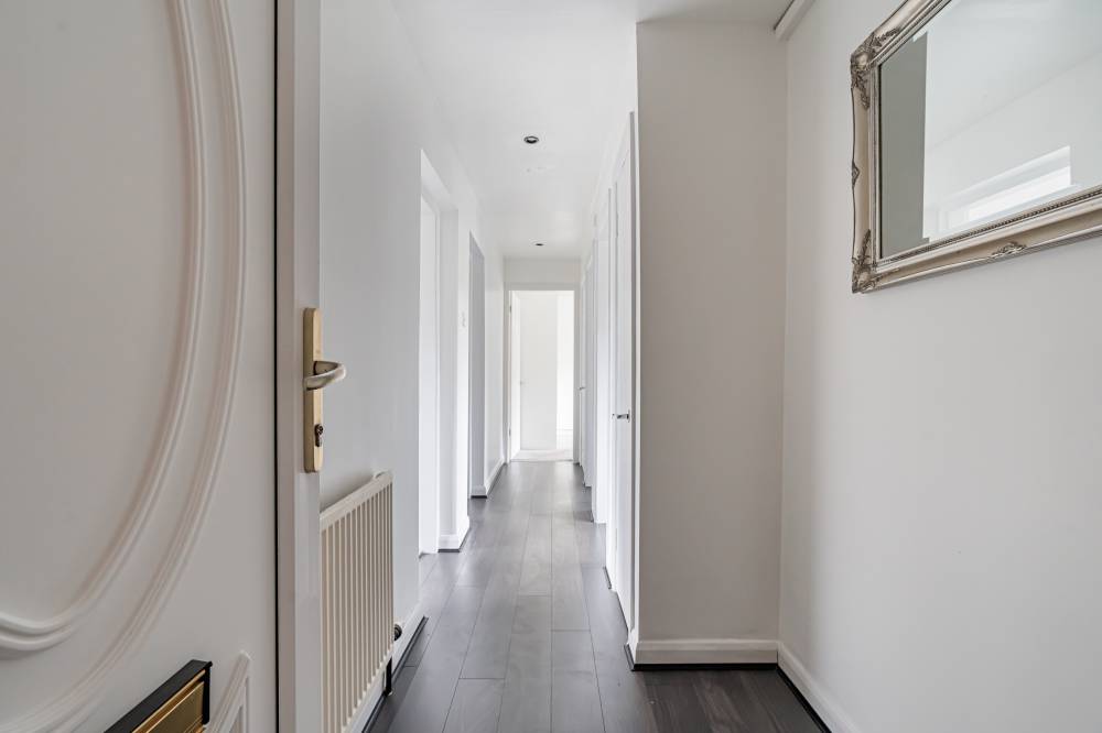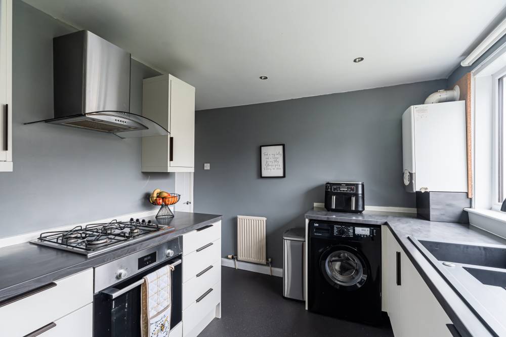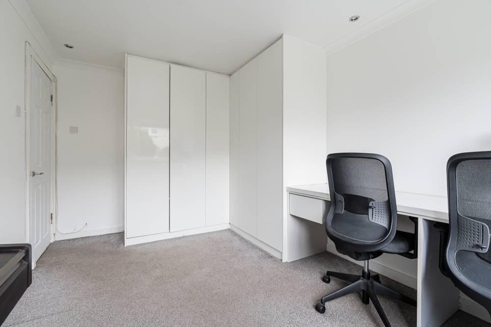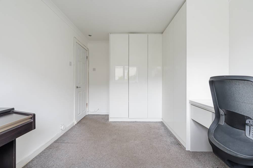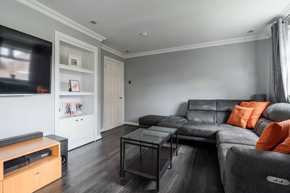 The flat has been meticulously maintained by the current owner and is entered via a light and welcoming hallway featuring laminate flooring and useful storage. This leads through to a spacious reception room finished in modern, neutral décor, offering ample space for both lounge and dining furniture. Glazed sliding doors provide direct access to the enclosed rear garden, creating a seamless connection between indoor and outdoor living. The stylish kitchen is fitted with white wall and base units, complemented by contrasting worktops and contemporary fixtures and fittings. Integrated appliances include a gas hob, oven, fridge freezer and dishwasher. The principal double bedroom is quietly positioned to the rear and features neutral décor and carpeting, while the second well-proportioned double bedroom enjoys a front aspect and is currently utilised as a home office, complete with built-in wardrobes and a cleverly designed workstation. A modern bathroom completes the accommodation.