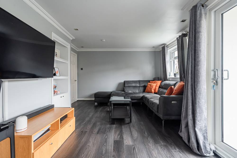 Externally, the property benefits from off-street parking via a gated private driveway, along with a front lawn bordered by hedgerow. The fully enclosed rear garden is accessed directly from the reception room and features a two-level decked area alongside artificial turf, offering an attractive and low-maintenance outdoor space.