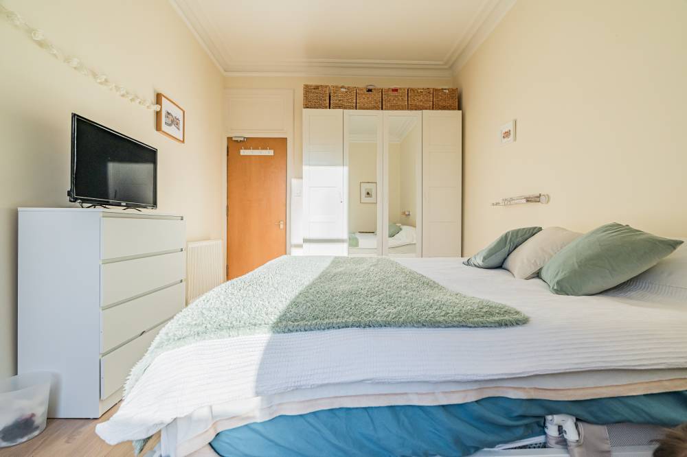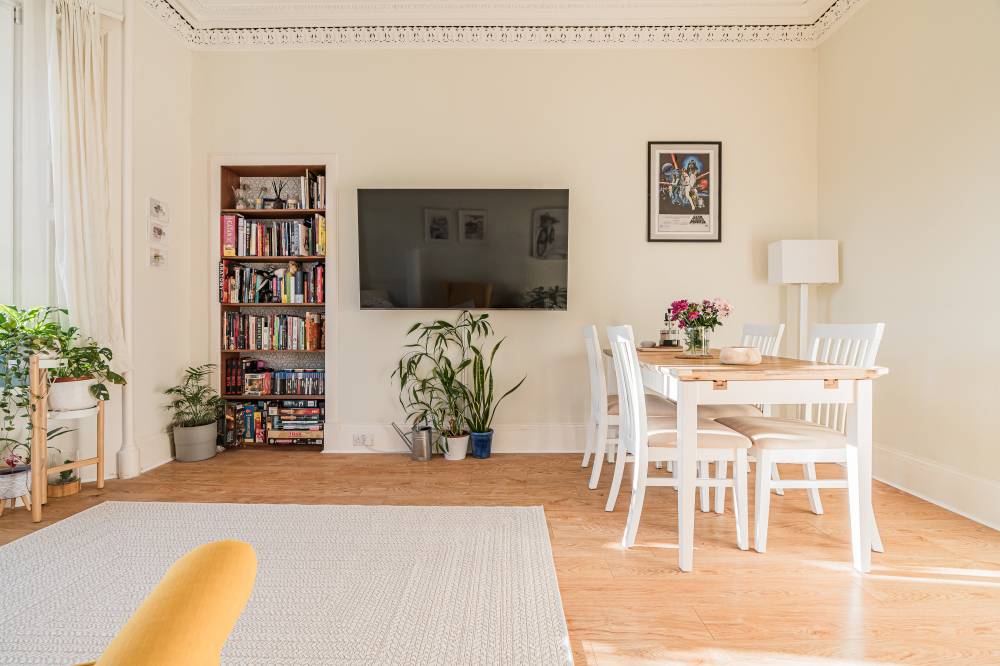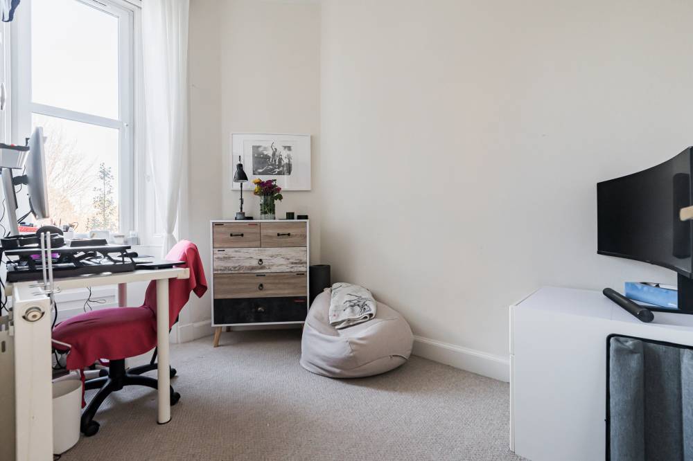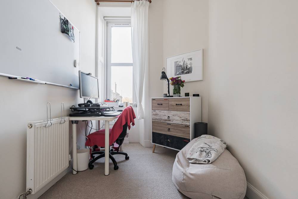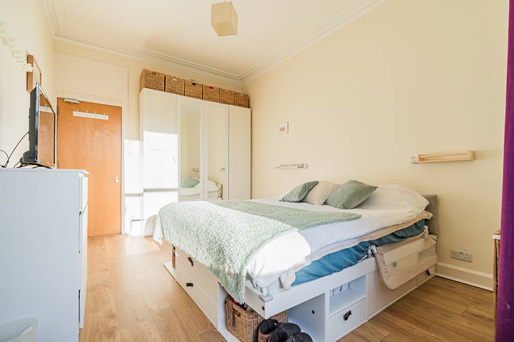 Internally, the flat offers a tasteful combination of period charm and contemporary design, creating a bright and comfortable living environment. Original features sit effortlessly alongside modern upgrades, while gas central heating, powered by a boiler installed in November 2020, last serviced in February 2026, and double glazing throughout ensure warmth and efficiency year-round. Generous storage solutions further enhance the practicality of the home. Accessed via a secure entry system, the property opens into a bright and welcoming entrance hallway, setting the tone for the accommodation beyond. The hallway benefits from two excellent built-in storage cupboards, providing practical space for coats, household items, and everyday essentials while keeping the living areas clutter-free. The impressive bay-windowed reception and dining room is a particular highlight of the home. Generously proportioned and flooded with natural light, this elegant space effortlessly accommodates both lounge and dining furniture. Period features such as attractive decorative cornicing and a traditional Edinburgh press add charm and character, blending classic architectural detail with modern-day living. The modern fitted kitchen is thoughtfully designed with ample worktop space, and plentiful wall and base units, making it both functional and stylish. It offers an efficient layout ideal for everyday cooking as well as entertaining. There are two generously sized double bedrooms, each offering comfortable accommodation with space for freestanding furniture. In addition, a well-proportioned third bedroom provides excellent flexibility and could be utilised as a home office, nursery, dressing room, or guest bedroom depending on individual requirements. Completing the accommodation is a contemporary three-piece bathroom, fitted with a bath and shower over, combining practicality with comfort.