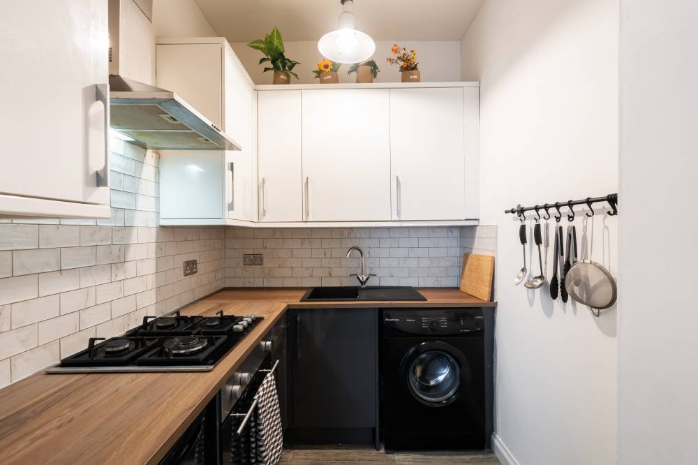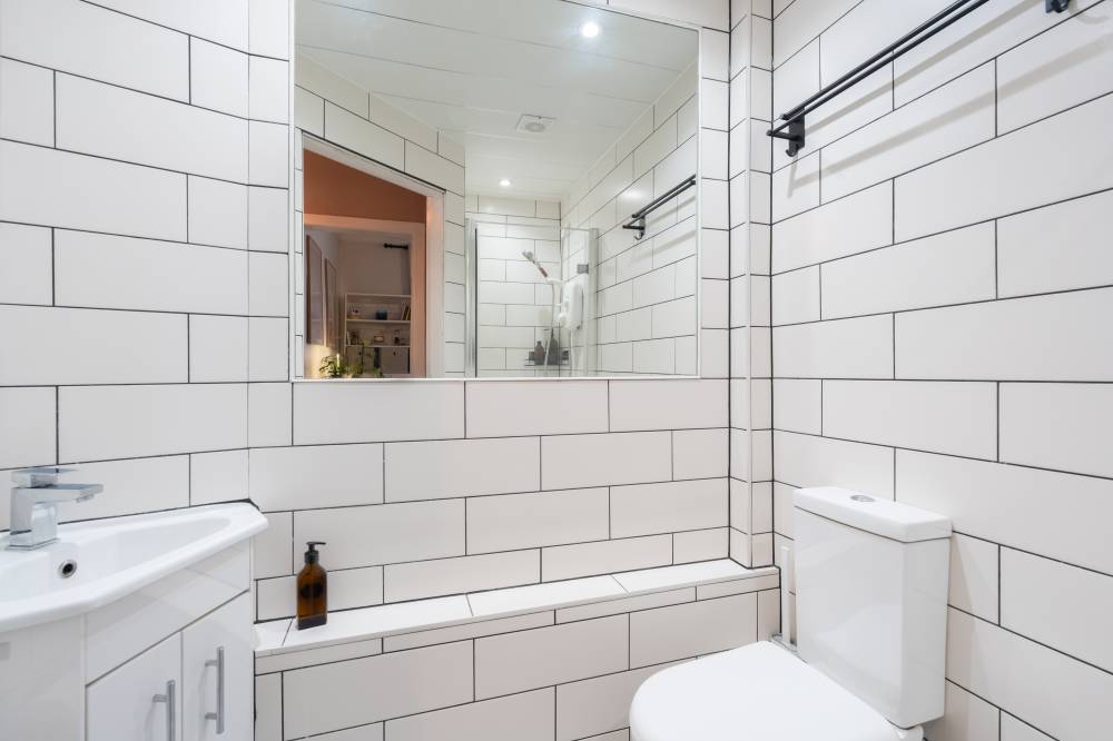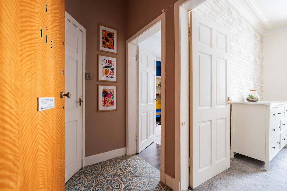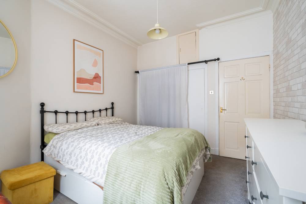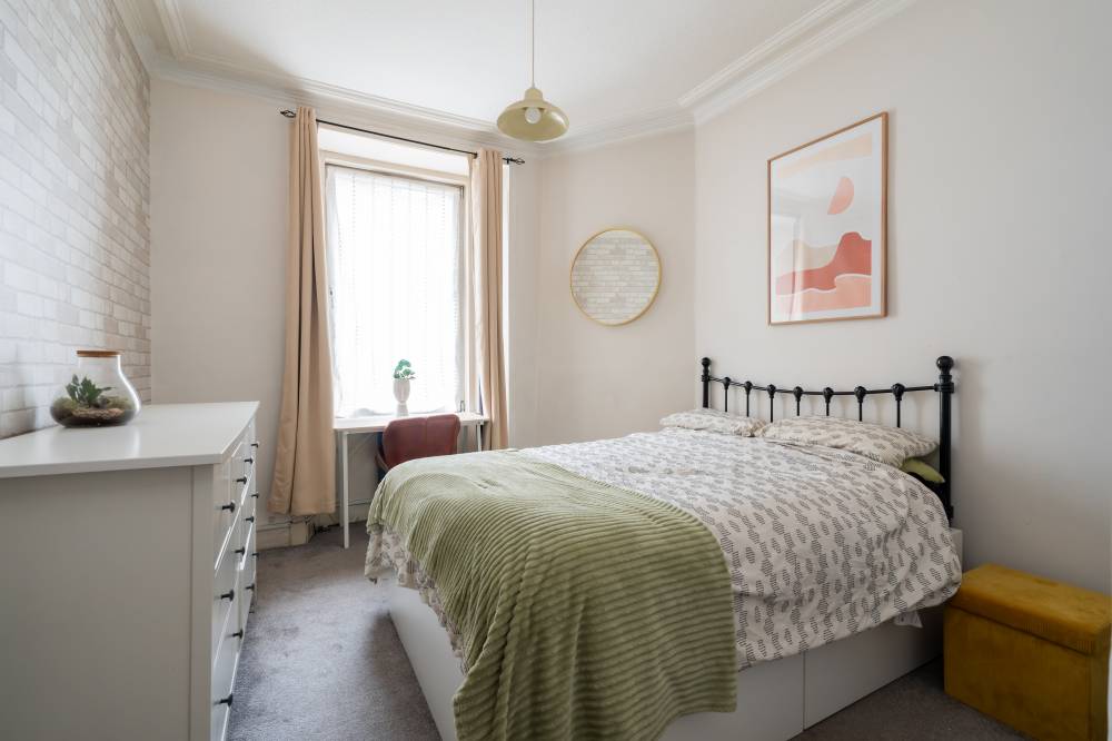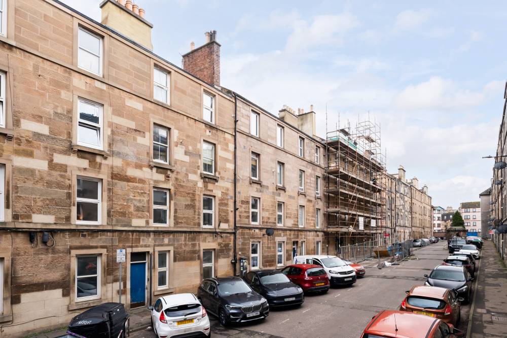 Forming part of an attractive traditional tenement with secure entry and access to a shared garden and drying green, this beautifully presented first-floor flat offers an ideal opportunity for first-time buyers seeking a stylish yet practical home. A welcoming hallway with contemporary ceramic tiled flooring leads into a bright and generously proportioned reception room to the front, providing excellent space for both relaxing and dining, while the adjoining kitchen creates a sociable layout perfect for entertaining friends. The kitchen is finished to a high standard with modern wall and base units, striking metro-tiled splashbacks and integrated oven and hob, with the washing machine and fridge also included in the sale. The spacious double bedroom enjoys excellent built-in storage, including wardrobes and cupboards housing the water tanks, while a sleek and luxurious shower room with underfloor heating completes the accommodation. Additional features such as electric heating and full double glazing enhance comfort and efficiency, making this an appealing and move-in-ready home in a popular setting.