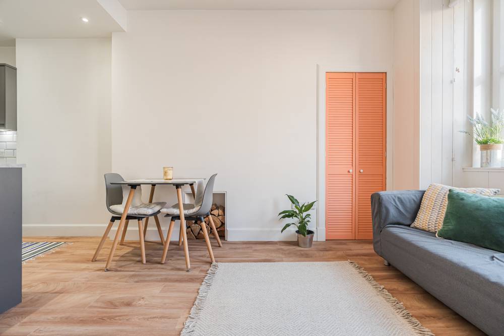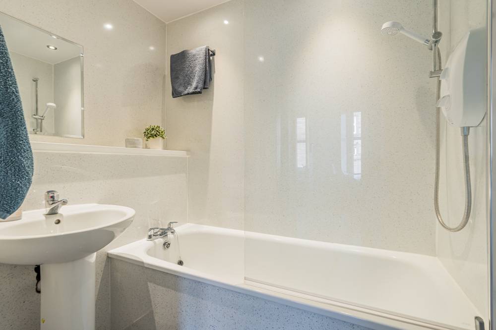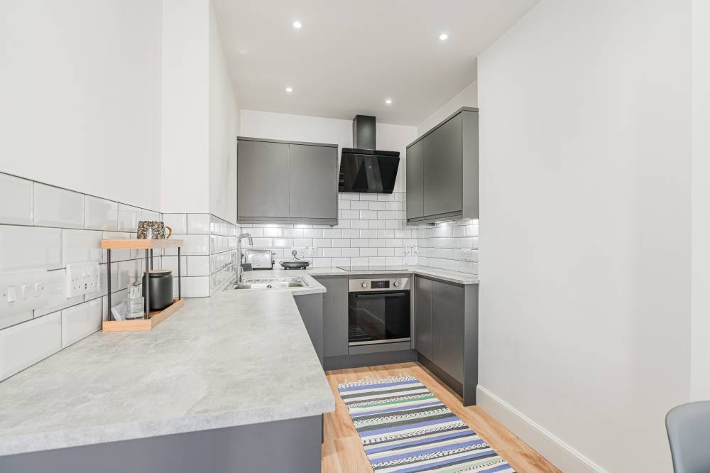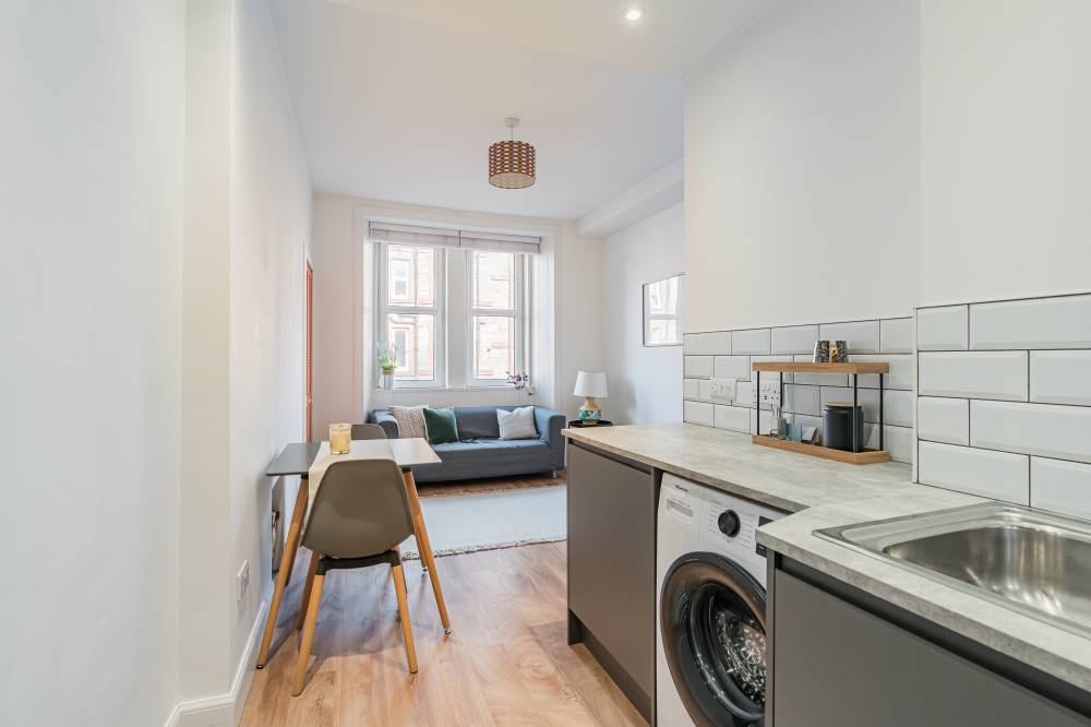 The accommodation is accessed via a well-maintained communal stair and opens into a welcoming hallway with useful storage. To the front of the property, the open-plan living space provides a bright and comfortable reception area finished in neutral décor with laminate flooring and additional storage. The adjoining kitchen area is fitted with contemporary grey wall and base units, stylish subway-style tiling, and integrated appliances including an induction hob and oven, creating a modern and practical space for everyday living and entertaining. The property further benefits from a generous double bedroom offering excellent storage, including built-in wardrobes, providing ample space and functionality. Completing the accommodation are separate WC and bathroom facilities, with the bathroom fitted with a bath and electric shower over, wash hand basin, and easy-maintenance wet wall panelling.