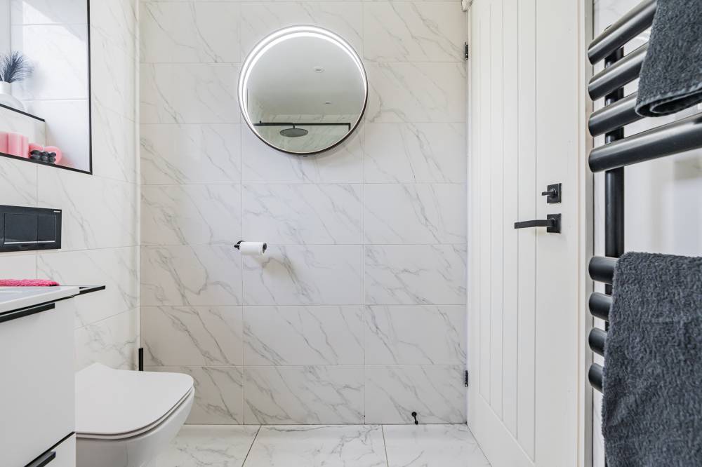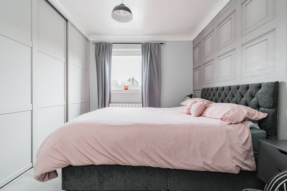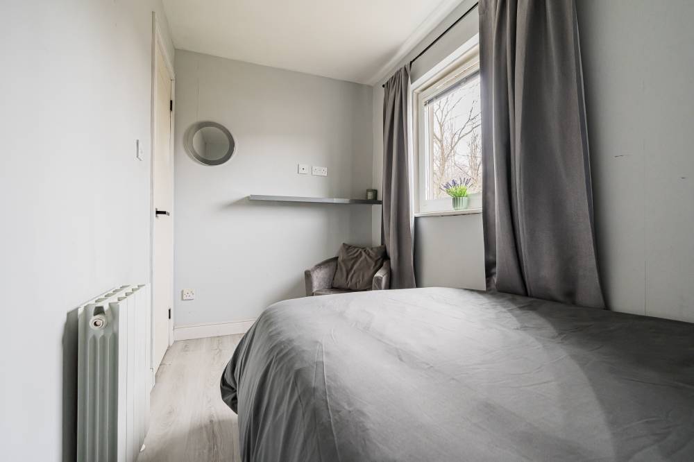 The principal bedroom is a generously proportioned double, tastefully decorated in modern tones and enhanced by full-height, full-width fitted wardrobes providing excellent storage. A second, compact bedroom offers flexibility and would be perfect as a home office, study, nursery, or child’s bedroom. Completing the accommodation is a chic, fully tiled bathroom featuring a crisp white two-piece suite, a walk-in cubicle with remote-controlled thermostatic electric shower, recessed shelving, and striking black fixtures and fittings for a contemporary finish.