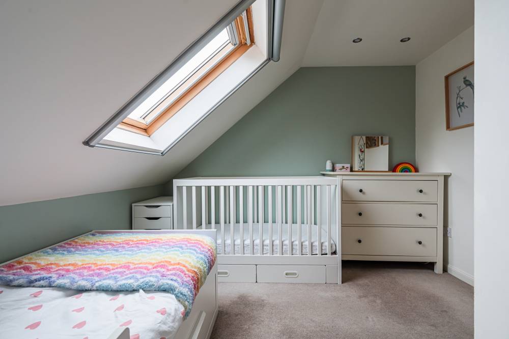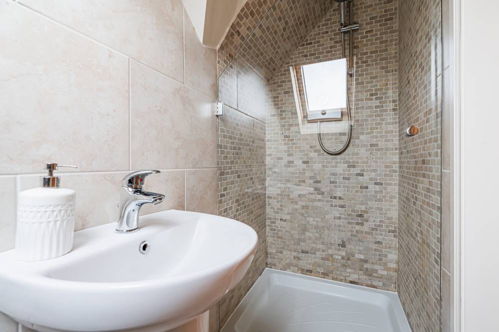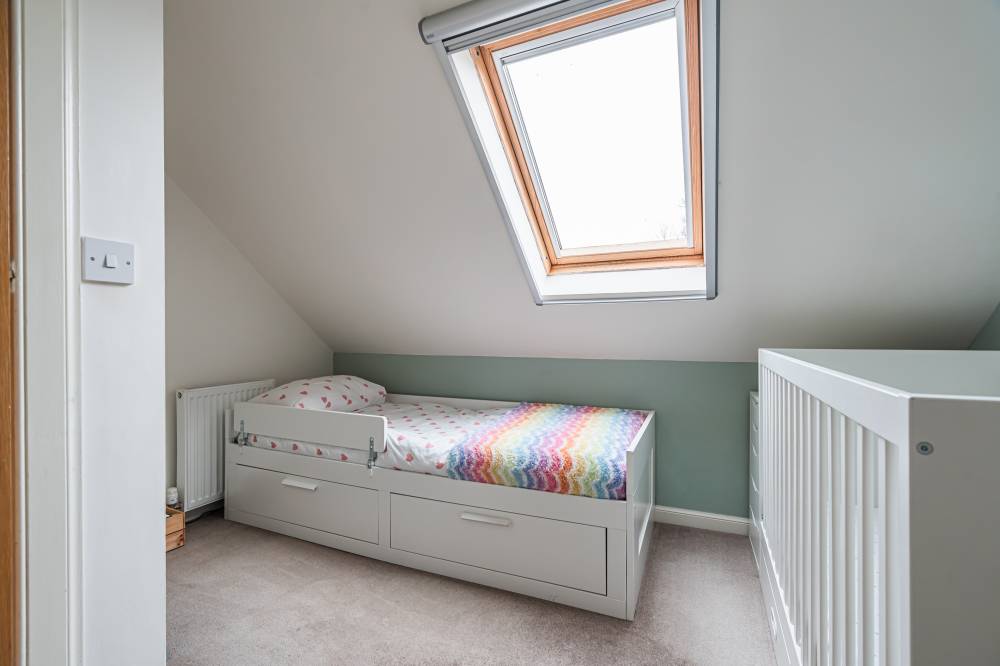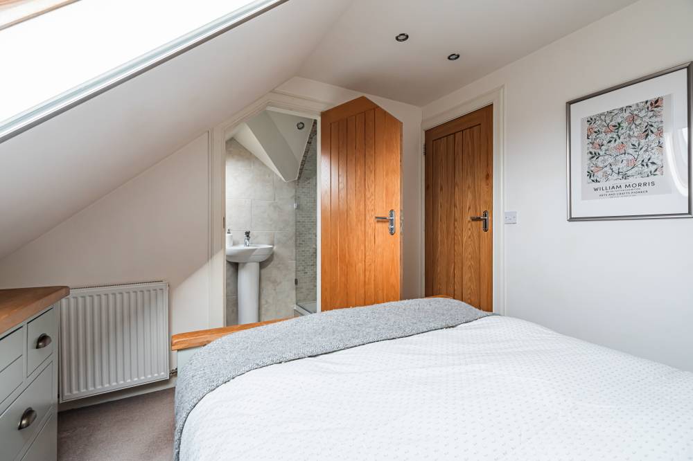 On the upper level you have the landing with access to excellent eaves storage, a good-sized principal bedroom with southwest facing Velux style window and convenient en-suite shower room, and a second well-proportioned double bedroom with tasteful modern décor and carpeted floor.