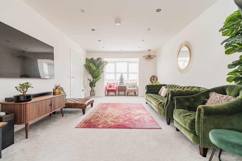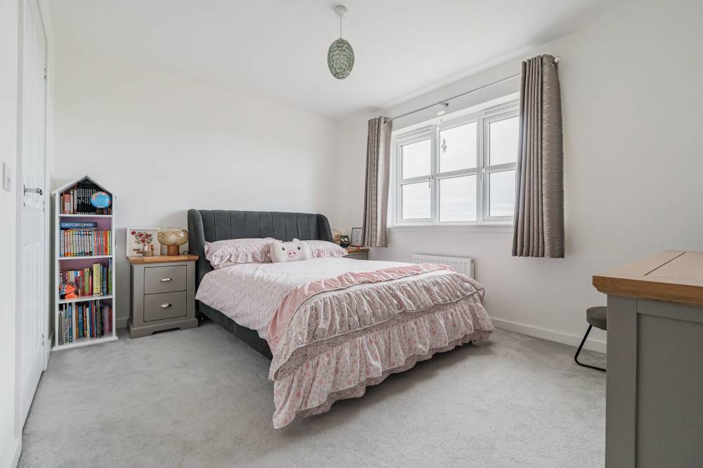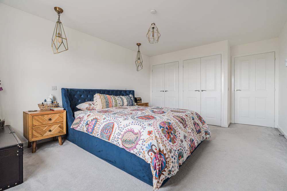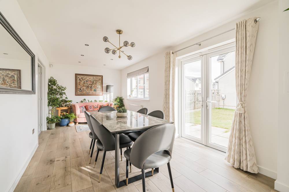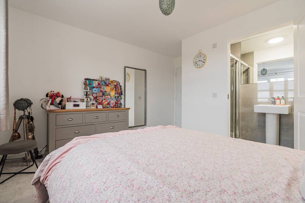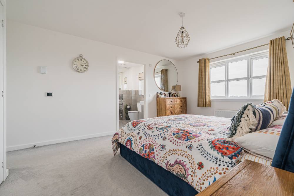 Unlike a brand-new build, this “second-hand new build” has already been road-tested, with landscaping established and early snagging resolved, allowing buyers to move straight in and enjoy the benefits from day one with the further benefit of no onward chain. The front door opens to a wide and welcoming reception hallway with useful storage and a guest cloakroom/WC. To the front, a bright box-bay reception room features double doors opening through to the heart of the home - a superb open-plan kitchen, dining and family space spanning the full width of the property. French doors from the dining area lead directly to the south-facing rear garden, creating a seamless indoor-outdoor flow ideal for entertaining. The contemporary kitchen is well equipped with integrated appliances, complemented by a separate utility room with side access. A versatile second reception room to the front, currently used as a music room, offers flexibility as a home office or fifth bedroom. Upstairs, the principal bedroom enjoys fitted wardrobes and a stylish en-suite, while bedroom two also benefits from its own en-suite. Two further generous double bedrooms with built-in wardrobes are served by a modern family bathroom. Additional storage is provided via a loft hatch and airing cupboard. The property further benefits from gas central heating, double glazing and solar panels with inverter in the under stair cupboard. A turnkey modern home combining the advantages of contemporary construction with the reassurance of a settled, established setting.