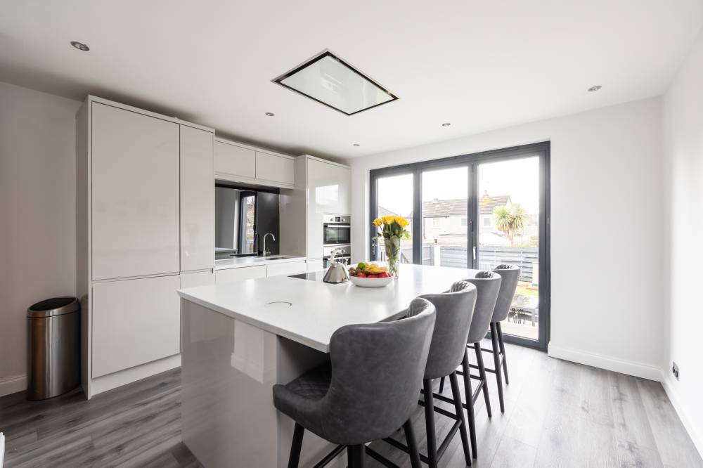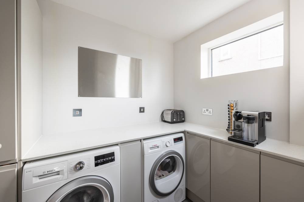 In brief the accommodation comprises; welcoming entrance hallway with useful storage cupboards, spacious and bright reception room with gas fireplace, stunning fitted kitchen with integrated appliances, kitchen island and bi-folding doors to rear garden, good size utility room, generously proportioned twin windowed principal bedroom with large fitted cupboard, a further good sized double bedroom, and contemporary family bathroom with three-piece suite and rainfall shower over bath. Further benefits include gas central heating (new boiler installed 2022) and double glazing.