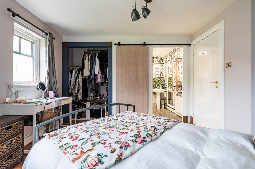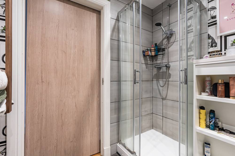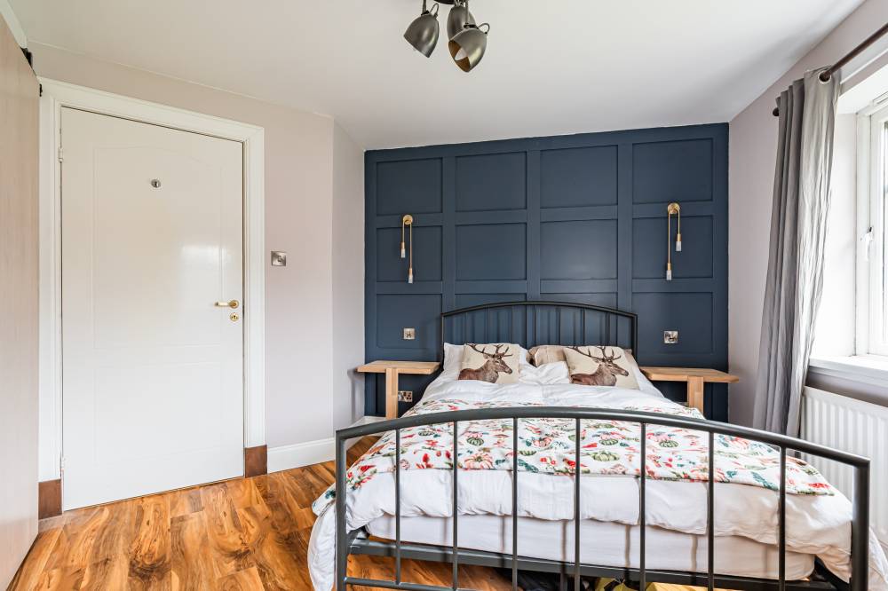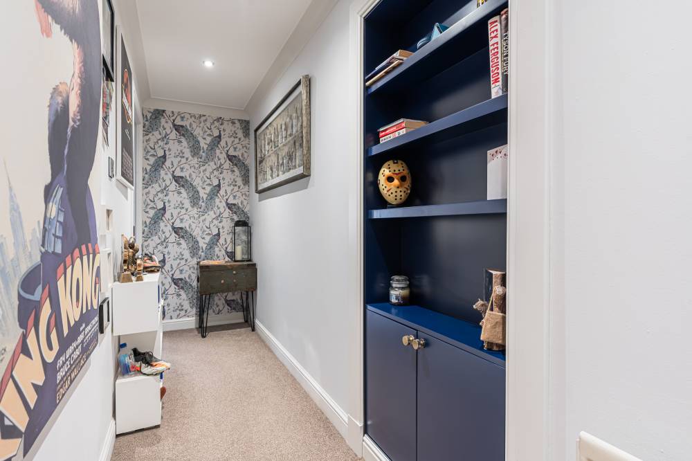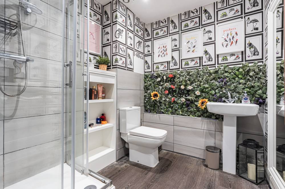 The accommodation is accessed via a welcoming entrance hallway, which provides useful storage options. The generously proportioned reception room is flooded with natural light from three windows and is finished in modern décor, offering ample space for both lounge and dining furniture, making it ideal for relaxing and entertaining. The kitchen is fitted with a stylish range of sage green wall and base units, complemented by tiled splashbacks and a combination of integrated and freestanding appliances, providing a practical and attractive workspace. The principal bedroom is a particularly spacious dual-aspect double, featuring built-in wardrobes and the added luxury of a modern en-suite shower room. The en-suite is fitted with a white two-piece suite and a glass shower cubicle with full tiling and a thermostatic shower. There is a second well-proportioned double bedroom, finished with laminate flooring and offering additional storage. The third bedroom is cleverly concealed behind a bookshelf entrance, creating a flexible space ideal for use as a study, home office, or hobby room. Completing the accommodation is the main bathroom, which is fitted with a three-piece suite and a shower over the bath.