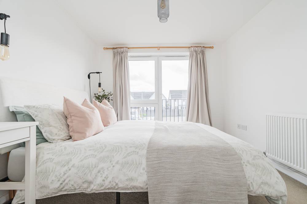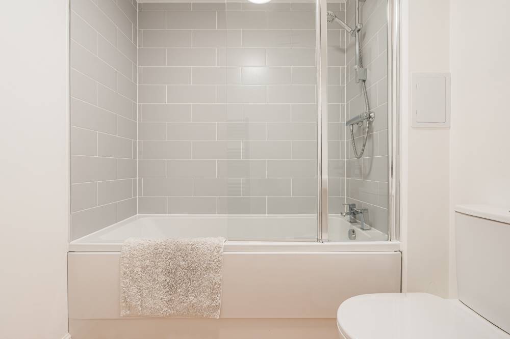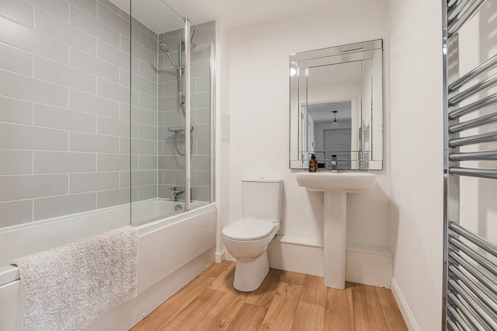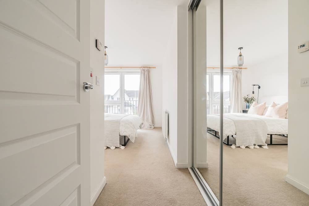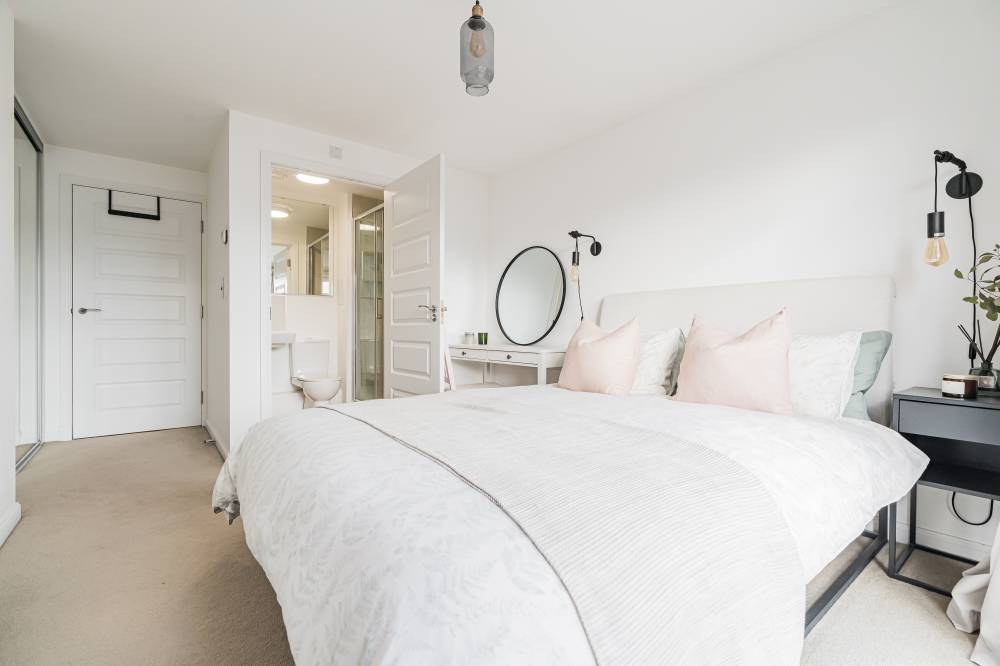 A light and airy hallway with ample storage leads into the heart of the home. The modern open-plan living space combines a reception area, dining space, and a fitted kitchen, all finished in contemporary décor. Large windows and a separate Juliet balcony allow natural light to flood the room, creating a bright and welcoming environment. The kitchen is fitted with a range of wall and base units, wood-effect worktops, and integrated appliances, offering a stylish and practical workspace. The principal bedroom is a generous double with a sunny southern aspect, carpeted flooring, and mirror-fronted built-in wardrobes. This room is complemented by a lavish en-suite shower room, featuring a crisp white two-piece suite, a fully tiled shower cubicle, and a chrome ladder radiator. The second double bedroom is also well-proportioned, with modern décor, carpeted flooring, and ample space for freestanding storage. A stylish family bathroom completes the accommodation, comprising a white three-piece suite with a thermostatic shower over the bath and tasteful tiling around. With its contemporary style, practical layout, and excellent location, this property represents an outstanding opportunity to acquire a ready-to-move-in home in a popular and well-connected area.