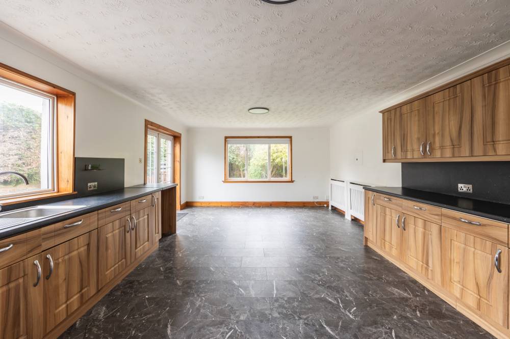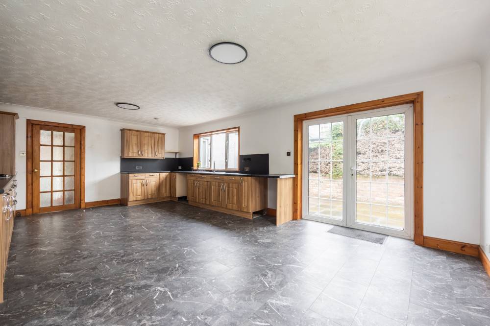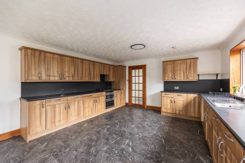 Also positioned to the rear is the expansive dining kitchen, forming the heart of the home. Fitted with an array of wall and base units, the kitchen provides excellent storage and worktop space, along with integrated appliances. The generous layout easily accommodates a dining table and offers flexibility for an additional family or sitting area if desired. Windows overlook the rear garden, and a door provides direct access outside, making it ideal for family living and entertaining.