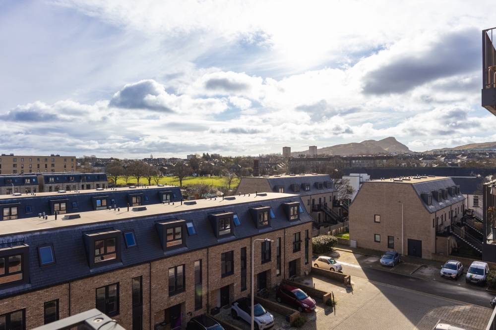 Internally, the property is presented in immaculate, true walk-in condition and briefly comprises: secure entry system, lift and stair access to all floors, and a welcoming entrance hallway with a useful storage cupboard. The generously proportioned reception/dining room offers an ideal space for both relaxing and entertaining, with direct access to a spacious private balcony boasting stunning views towards Arthur’s Seat. The open-plan, contemporary fitted kitchen is thoughtfully designed with a stylish peninsula, ample worktop space, and a range of integrated appliances. The well-proportioned principal double bedroom benefits from fitted wardrobes and a sleek, modern en-suite shower room. A second sizeable double bedroom, also with fitted wardrobes, provides excellent flexibility for guests or home working. Completing the accommodation is a partially tiled bathroom fitted with a white suite, over-bath shower, and heated towel rail. Further benefits include gas central heating and double glazing throughout.