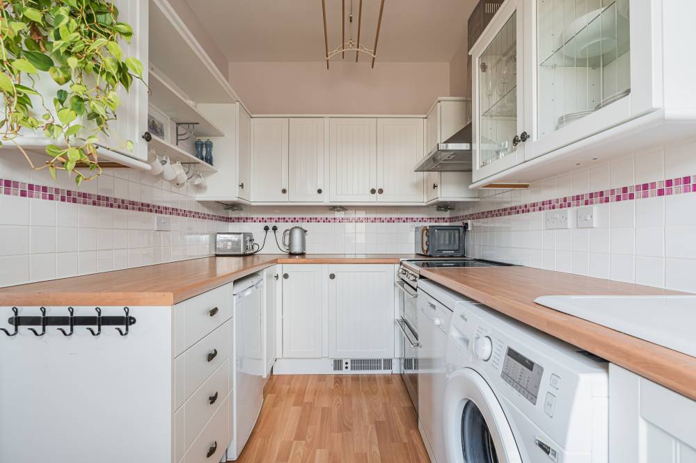 The flat is accessed via a well kept communal stair with secure entry and briefly comprises: entrance hall with built-in storage, light and airy reception/dining room with bay window, focal fireplace, shelved press and wood flooring, well equipped kitchen which has been fitted with a variety of modern base and wall mounted units complete with splash tiling, coordinated worktops and clothes pulley, generously sized principal bedroom with carpeted floor, walk-in cupboard, fireplace and impressive south facing views towards the Pentland Hills, a further good sized double bedroom with a similar aspect which is currently being used as an office/guest bed, and modern family bathroom with mosaic tiling, counter top basin, WC and bath with mains shower/splash screen.