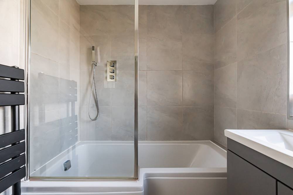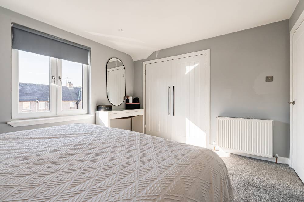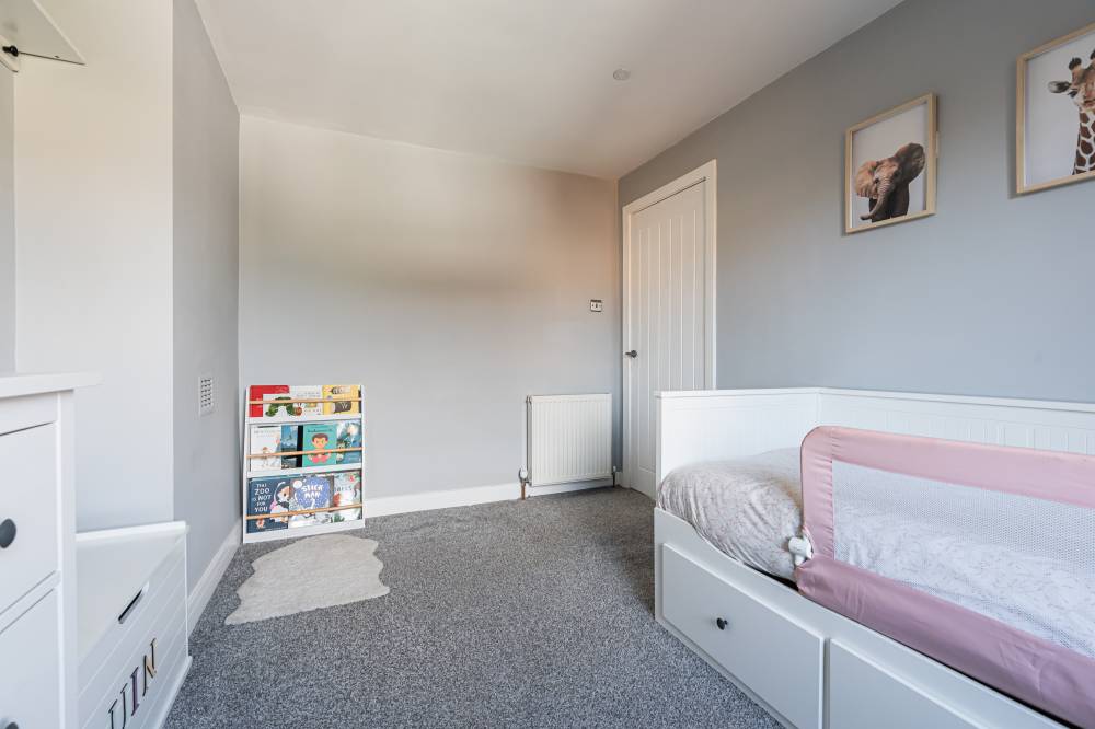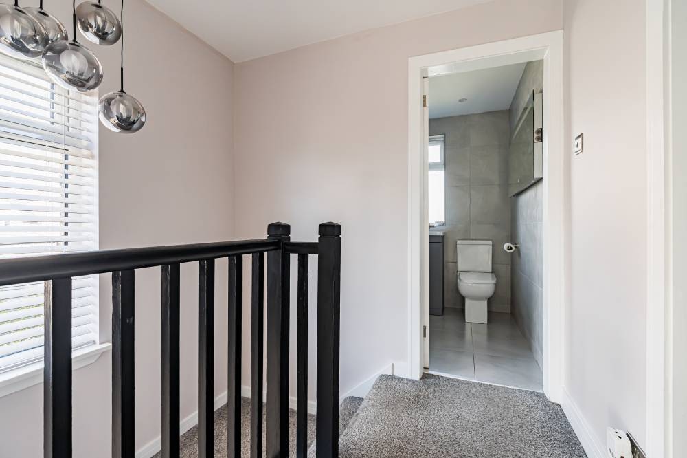 Carpeted stairs with a window allowing in natural light, lead you to the first floor where there are two double bedrooms, one with a good size built in wardrobe, and a contemporary bathroom with a white suite, overhead rainfall shower, and heated towel rail. The property further benefits from a partially floored attic, gas central heating and double glazing.