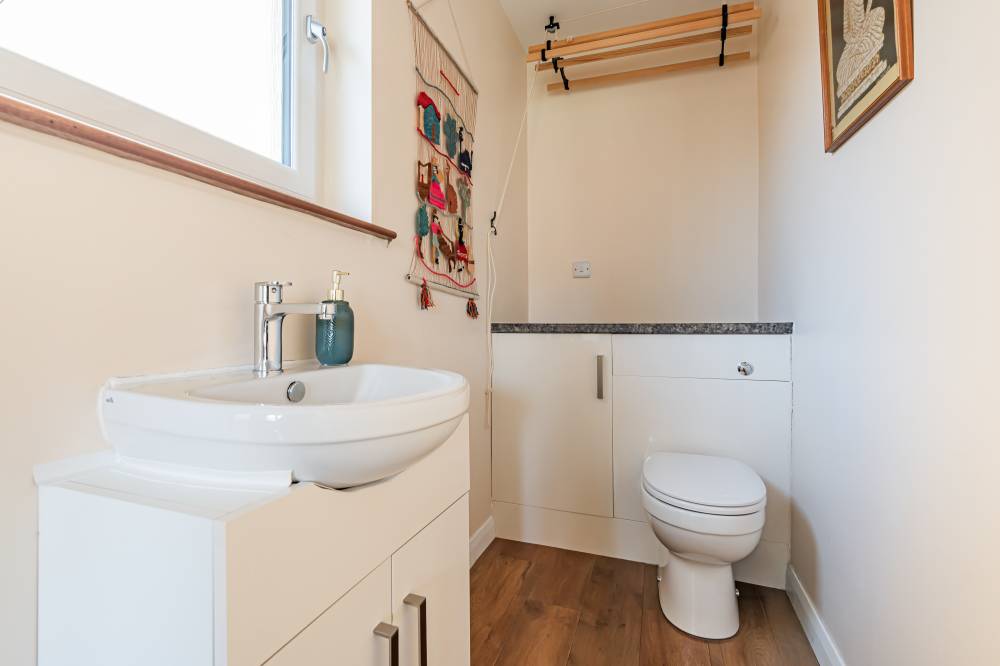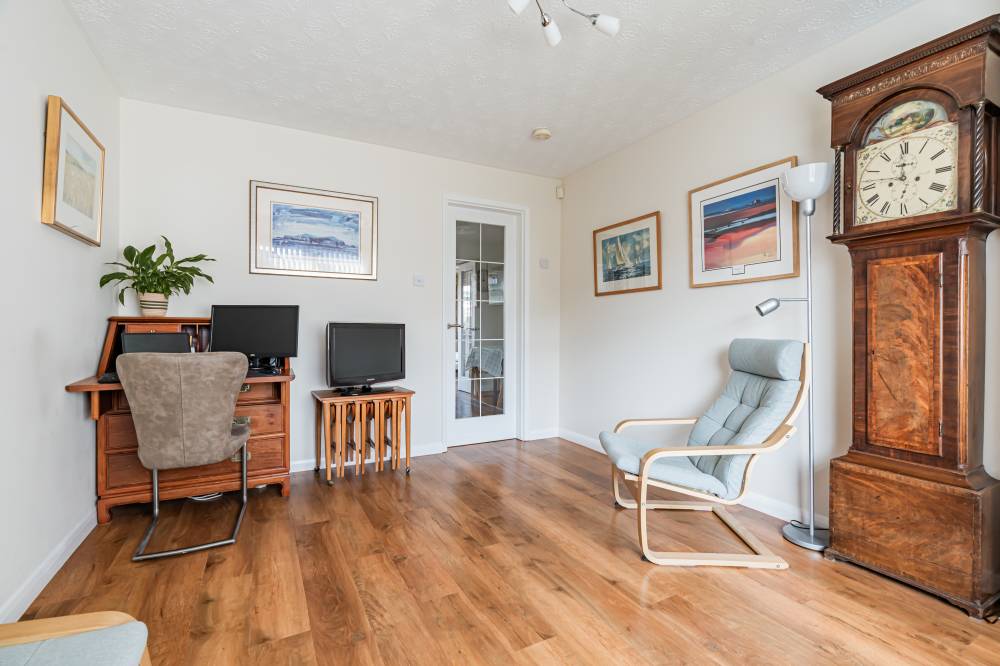 The accommodation is entered via a welcoming hallway with staircase to the upper level and access to the main living space. The front-facing family room features attractive laminate flooring and provides a comfortable setting for everyday living. To the rear, the modern kitchen is fitted with high-gloss wall and base units, integrated appliances and splashback tiling, and opens through glazed double doors into a bright extension. This superb living room offers excellent versatility and could also be utilised as a formal dining room, home office or study, with glazed doors opening directly to the garden and the added convenience of a ground-floor WC. Upstairs, there are two well-proportioned double bedrooms, one positioned to the front and the other to the rear, both benefiting from mirrored built-in wardrobes and carpeted flooring. The bathroom is fitted with a contemporary white three-piece suite and thermostatic shower over the bath.