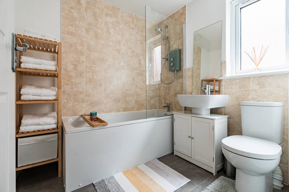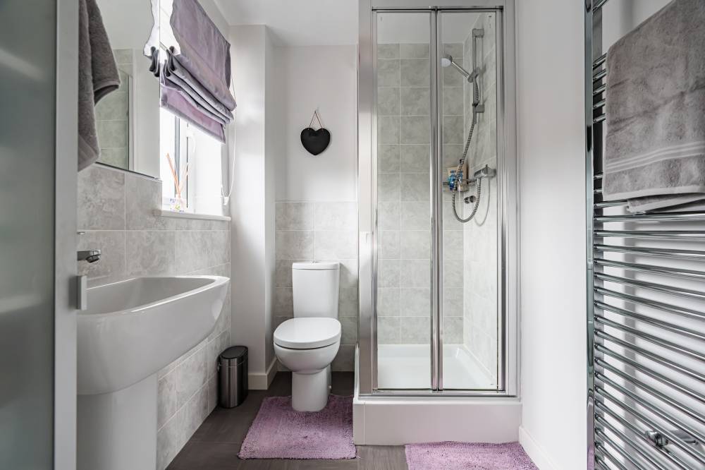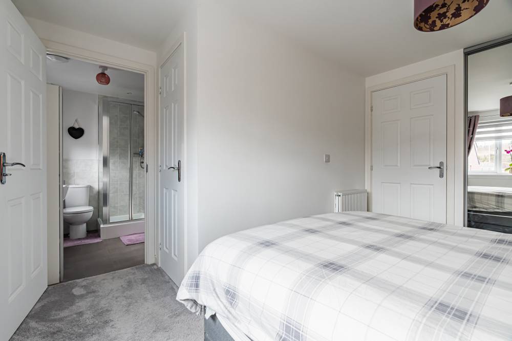 Upstairs, the property offers a generously proportioned principal bedroom with a built-in wardrobe and en-suite shower room, two further double bedrooms enjoying open views, one of which also benefits from a built-in wardrobe, and a contemporary bathroom fitted with a crisp white suite, heated towel rail and shower over the bath. The property also has gas central heating and double glazing.