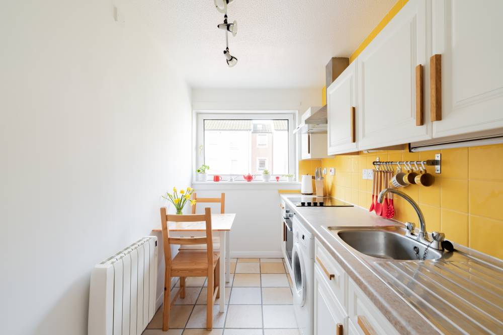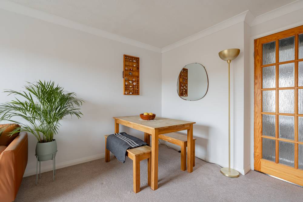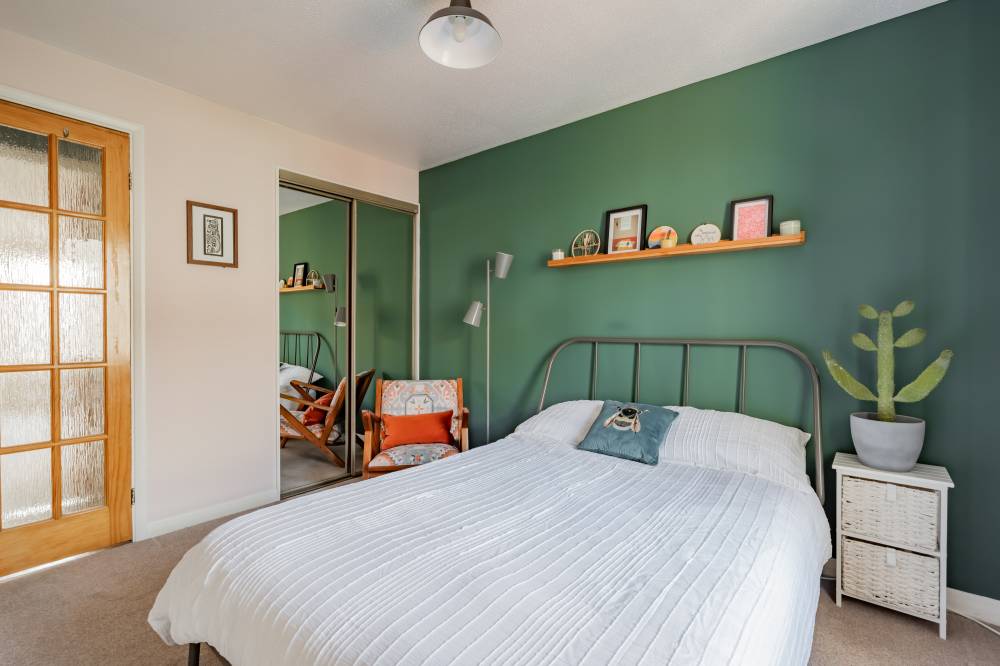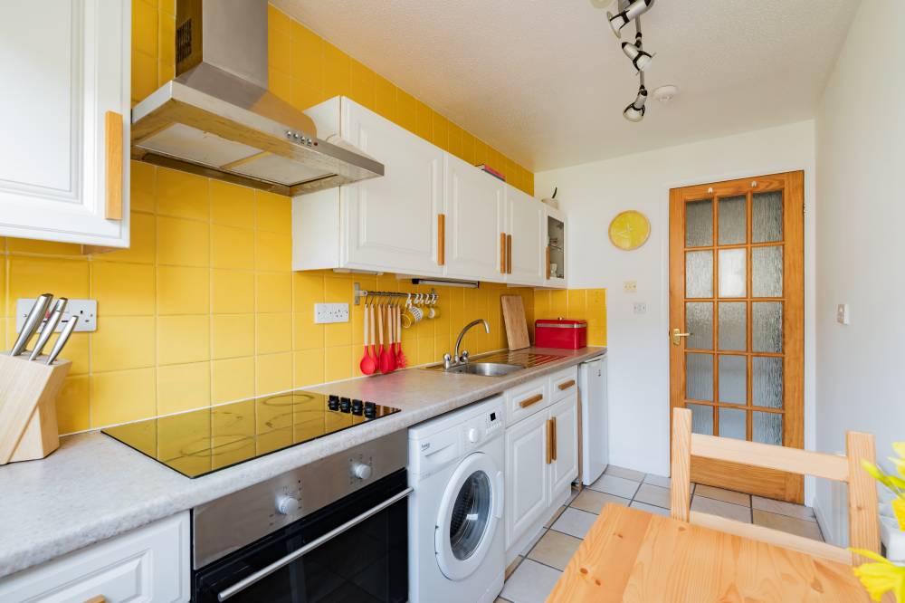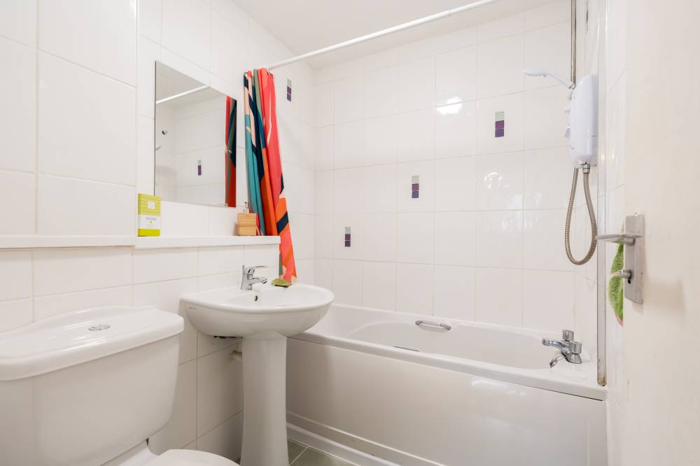 The kitchen is well equipped with a good range of fitted wall and base units, tiled splashbacks and a selection of integrated and freestanding appliances which are included in the sale. The spacious double bedroom features modern décor, fitted carpet and deep mirror-fronted wardrobes offering excellent storage. The bathroom is fully tiled and fitted with a white three-piece suite including an electric shower over the bath.