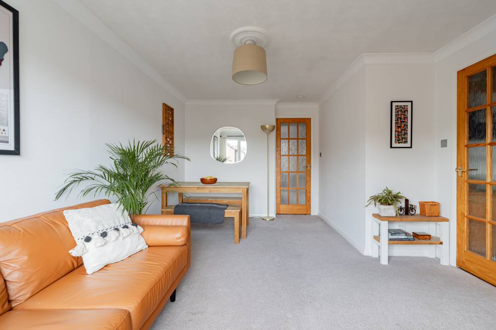 Accessed via its own main door, the accommodation begins with a private internal staircase leading to a bright front-facing reception room overlooking the peaceful courtyard setting. The room is finished with neutral décor and carpeting, providing ample space for both lounge and dining furniture. An inner hallway connects to the kitchen, bedroom and bathroom, and benefits from generous built-in storage as well as access to a floored loft space for additional storage.