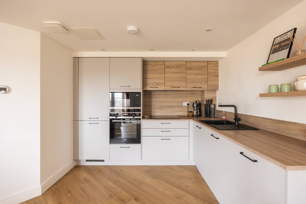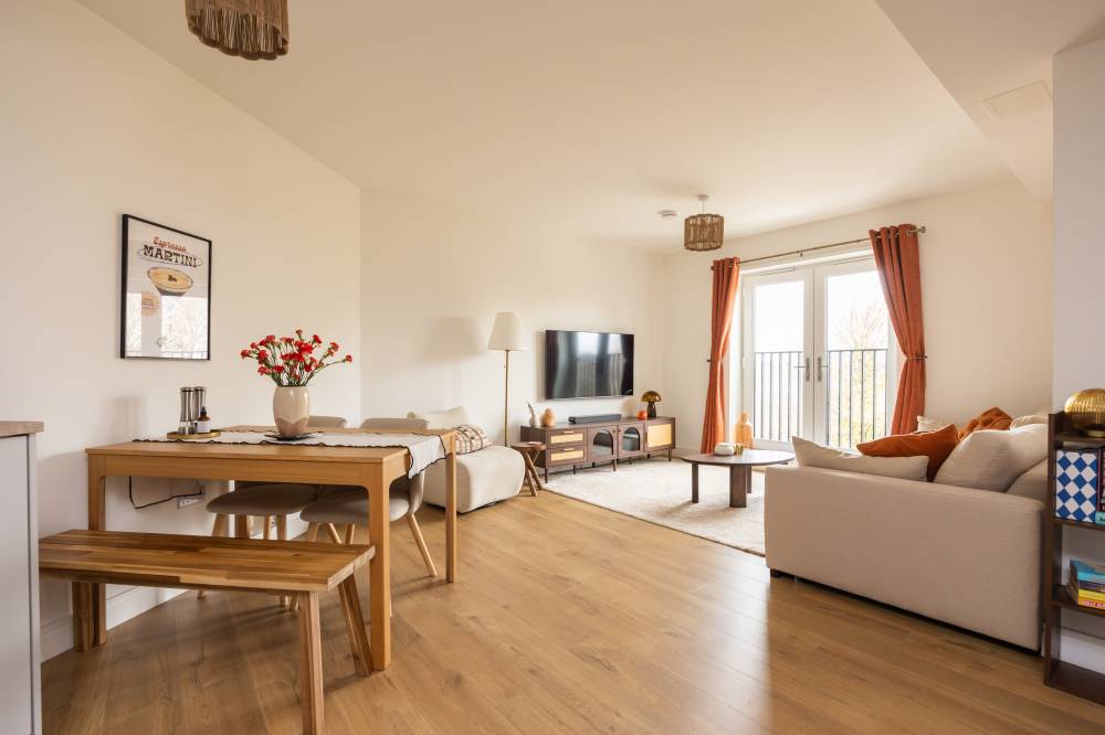 The accommodation opens with a welcoming entrance hallway, featuring a large storage/cloak cupboard along with a separate utility cupboard providing space for additional freestanding white goods. The heart of the home is the impressive lounge/kitchen/diner – a bright and airy open-plan space offering ample room for both living and dining furniture. A double Juliet balcony allows natural light to flood the room while offering a lovely leafy outlook. The stylish fitted kitchen is well-appointed with a range of integrated appliances, under-unit lighting, and coordinated splashback panelling in keeping with the worktop finish. The bedroom is a well-proportioned double, also benefitting from a Juliet balcony with the same attractive outlook, and provides excellent space for freestanding furniture and flexible arrangements. The contemporary bathroom is fitted with a shower over bath, electric heated towel rail, partial tiling, and a sleek wall-to-wall mirror.