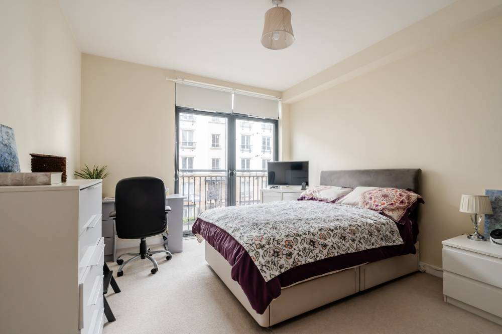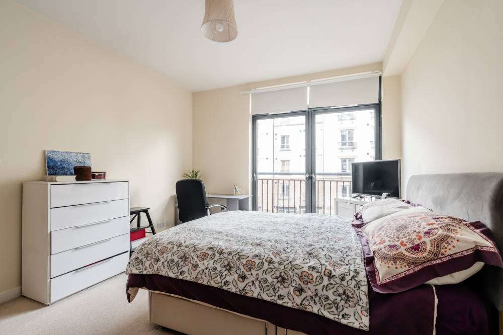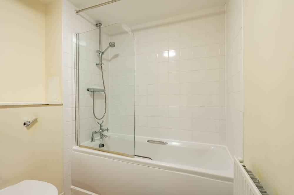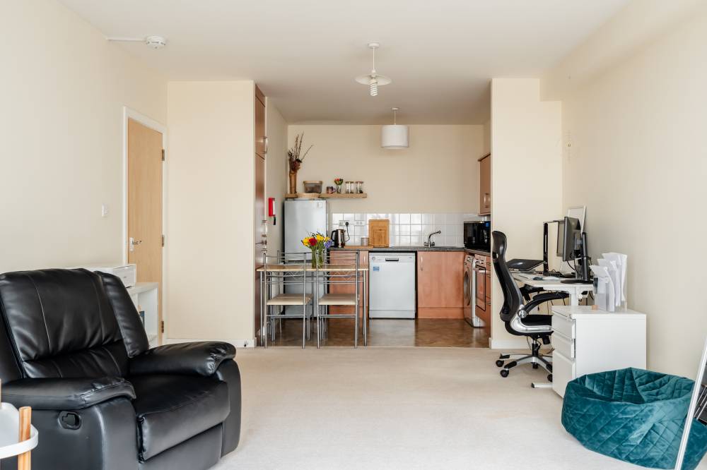 The accommodation is accessed via a secure entry system and opens into a welcoming hallway with useful built-in storage. The main living space is arranged in an open-plan layout, creating a bright and versatile environment for both relaxing and dining. The reception area is finished in neutral décor with carpeted flooring and features a Juliet balcony, allowing natural light to flood the room. The fitted kitchen is positioned off the living area and provides a practical layout with space for freestanding appliances. The bedroom is a generous double, also finished in neutral tones with carpeted flooring, and benefits from a full-height window and Juliet balcony, enhancing the sense of light and space. The bathroom is fitted with a white three-piece suite, including a thermostatic shower over the bath and complementary white tiling surrounding.