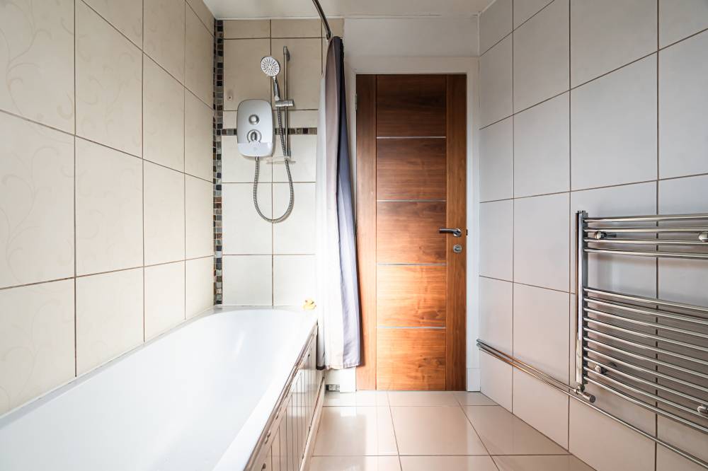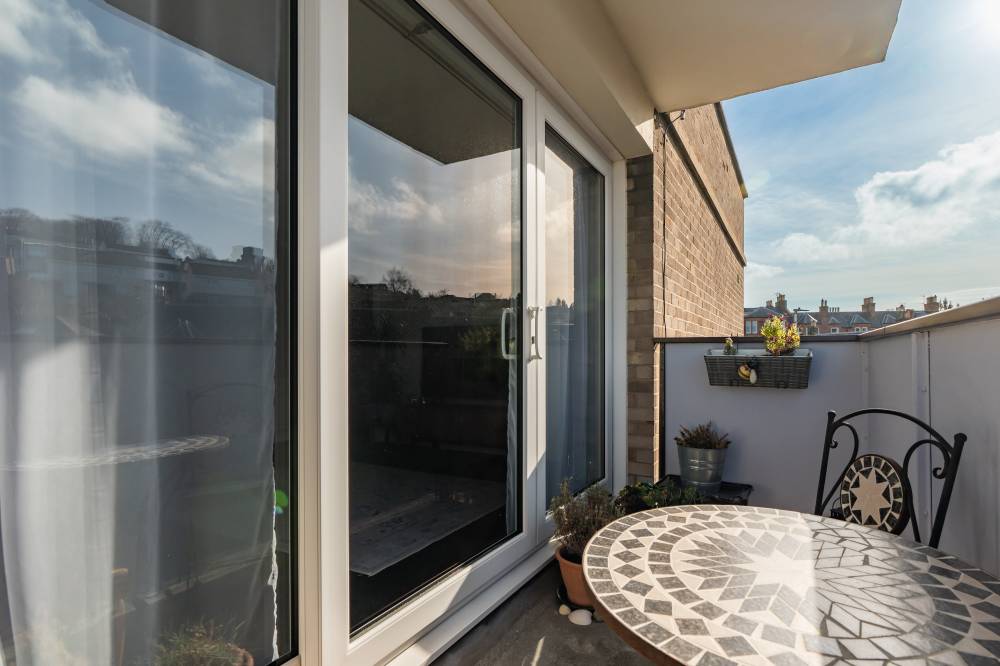 Internally, the property opens into a welcoming hallway which provides useful built-in storage. The spacious reception room is tastefully decorated in modern tones and fitted with carpeting, creating a comfortable living environment. A patio door leads out to a private, sunny balcony, an ideal spot to enjoy the open outlook and outdoor seating. The dining kitchen is well laid out and fitted with attractive two-tone wall and base units, complemented by tiled splash areas and generous worktop space. Integrated appliances include a hob, oven and cooker hood, while there is ample room for a dining table, making it a practical and sociable kitchen space. The property offers three bedrooms. Two are comfortable double bedrooms, both enjoying excellent open views and finished with neutral décor and carpeting. The third bedroom is a compact double, again benefiting from pleasant open aspects. The accommodation is completed by a fully tiled bathroom fitted with a modern three-piece white suite, an electric shower over the bath and a heated chrome towel rail.