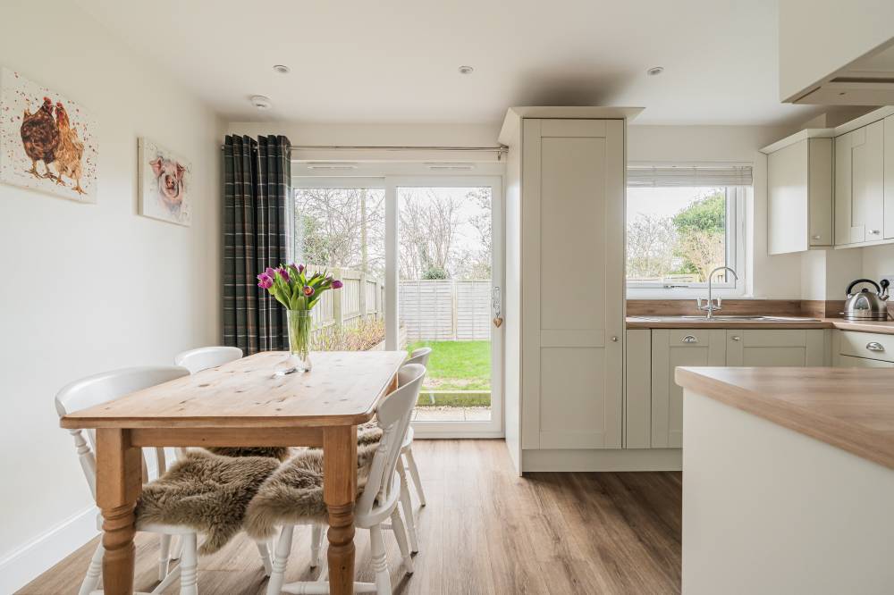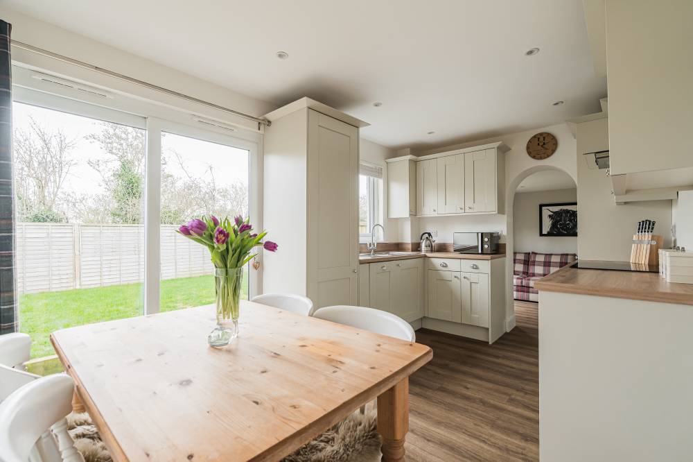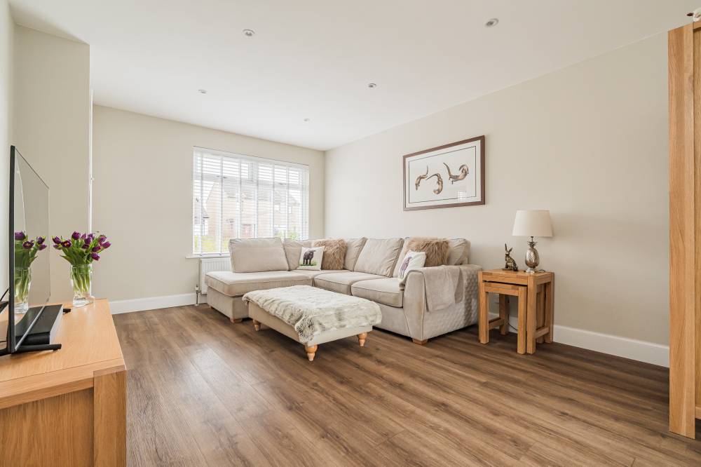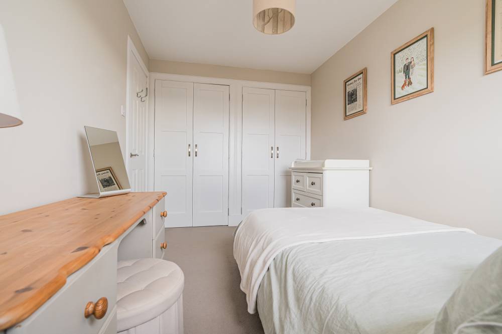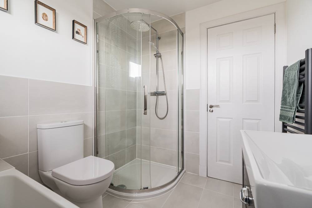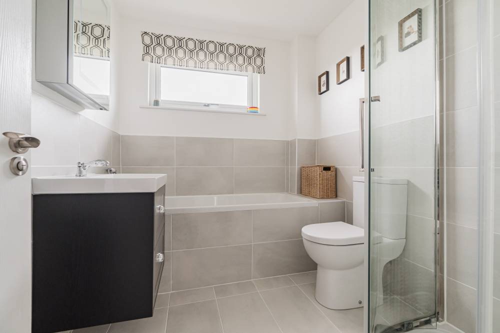 The accommodation begins with a welcoming entrance vestibule, complete with a fitted cupboard providing useful shelving and storage. This leads into a bright hallway, setting the tone for the well-maintained interiors throughout. The lounge is a particularly appealing space – bright and airy with a pleasant front-facing outlook. A practical understairs cupboard adds valuable storage. To the rear, the stylish and modern kitchen/diner is fitted with a range of integrated white goods, complemented by ample cupboard and worktop space. Sliding patio doors open directly onto the rear garden, creating a seamless connection between indoor and outdoor living. The kitchen flows effortlessly into a versatile multi-purpose family room, offering flexible use as a formal dining area, home office, or additional living space. This room further enhances the home’s functionality, providing access to the rear garden, as well as the utility room and garage. Upstairs, the landing includes access to a partially floored loft, offering additional storage potential. The principal bedroom is a spacious front-facing double, benefitting from a walk-in closet. The second bedroom, also a generous double, enjoys a rear aspect and features two integrated double wardrobes. Both bedrooms provide ample space for freestanding furniture and flexible layouts. The bathroom is well-appointed with a bath and separate corner shower cubicle featuring a rainfall shower, alongside a heated towel rail, LED mirror, and stylish tiled flooring.