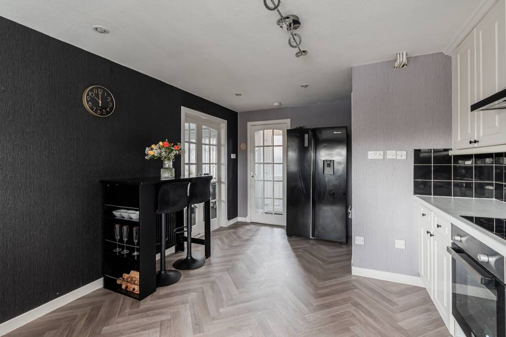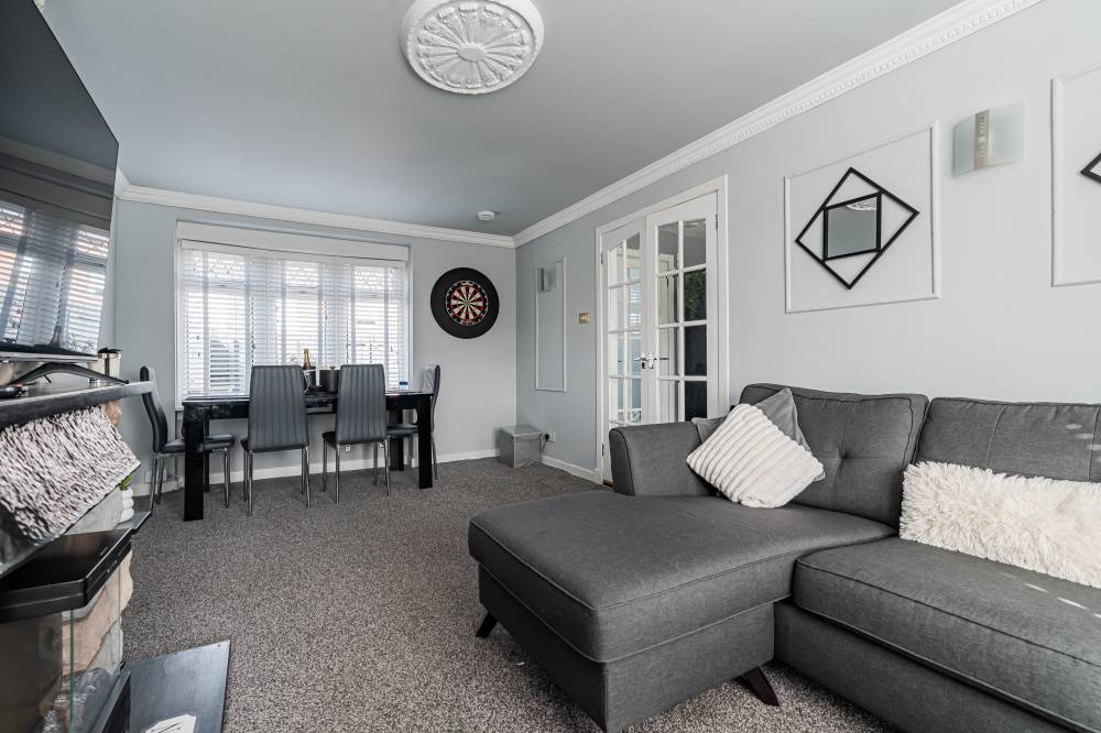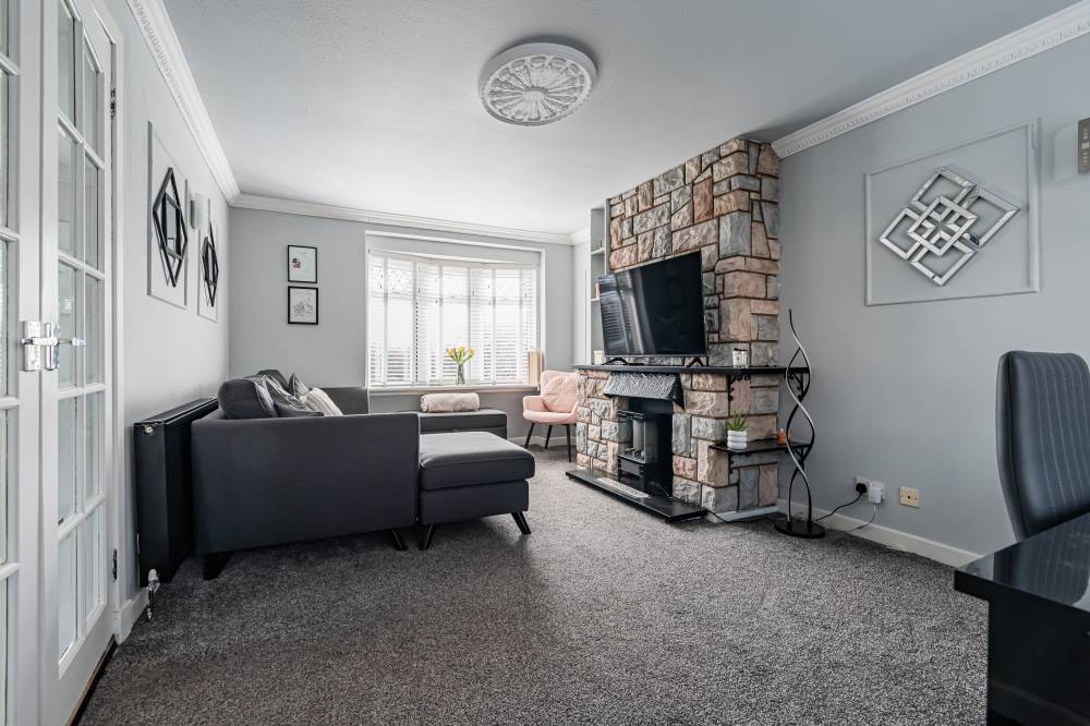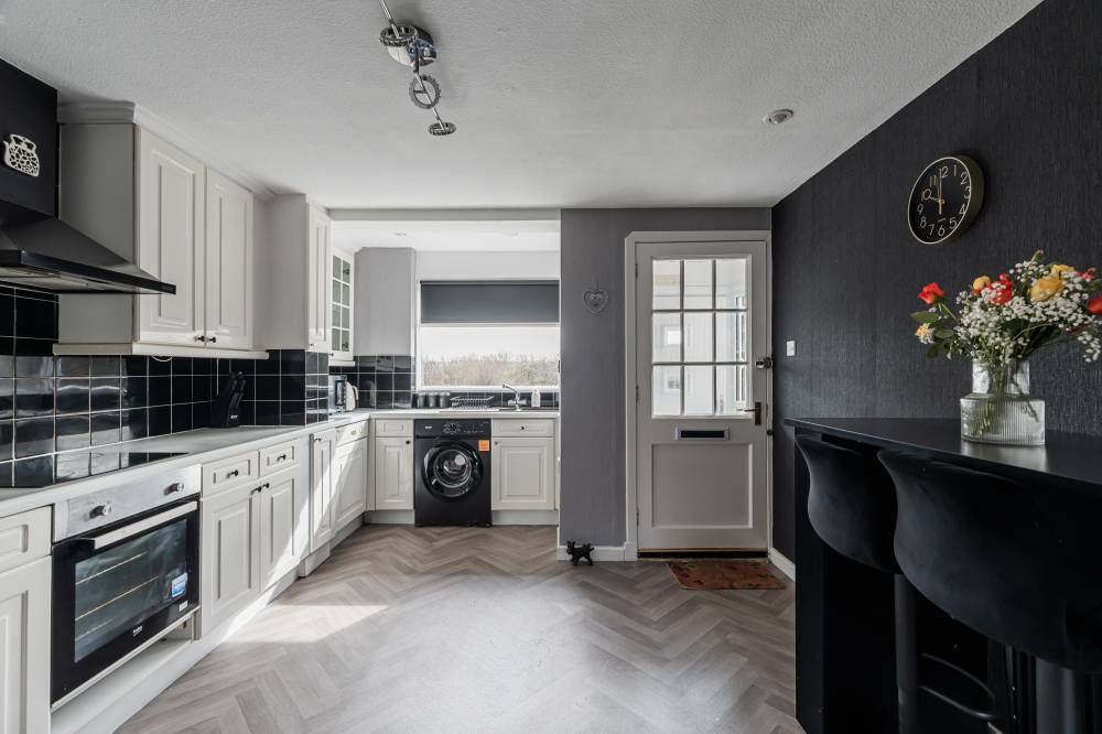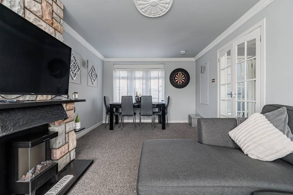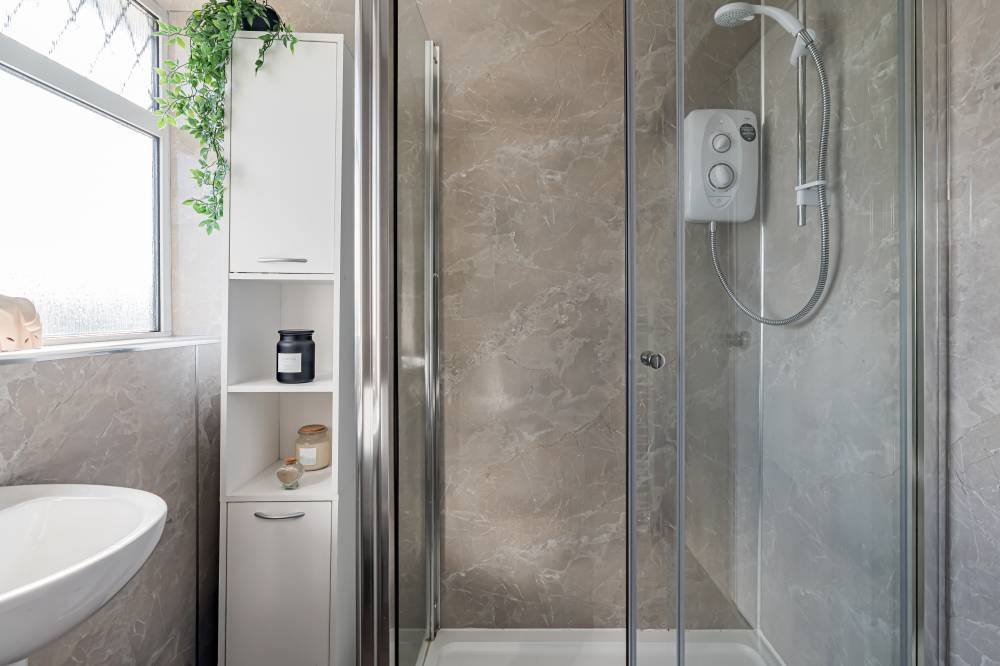 Upon entering through the front porch, you are welcomed directly into a bright and spacious kitchen diner. This impressive area forms the heart of the home and is fitted with an extensive range of floor and wall-mounted units, providing generous storage and worktop space. An integrated electric oven and hob, complete with a traditional extractor hood, ensure practicality for everyday cooking. The layout comfortably accommodates a dining table with seating for four, making it an ideal setting for family meals and entertaining alike. From the kitchen, access leads into the lounge, a well-proportioned and inviting room decorated in fresh modern décor. Dual-aspect windows allow natural light to flood the space, creating a bright and airy atmosphere. A feature brick-effect fireplace provides an attractive focal point, adding warmth and character to the room. The upper level hosts two generous double bedrooms, positioned to the front and rear respectively. Both rooms continue the theme of tasteful modern décor and benefit from built-in storage, offering practical wardrobe solutions while maintaining ample floor space. These rooms provide flexible accommodation, equally suited to family living, guest use, or a home office setup. The family shower room has been thoughtfully upgraded and features a modern white suite comprising a wash hand basin and WC, alongside a large walk-in shower enclosure fitted with an electric shower. The clean, contemporary finish enhances the overall appeal of the home.