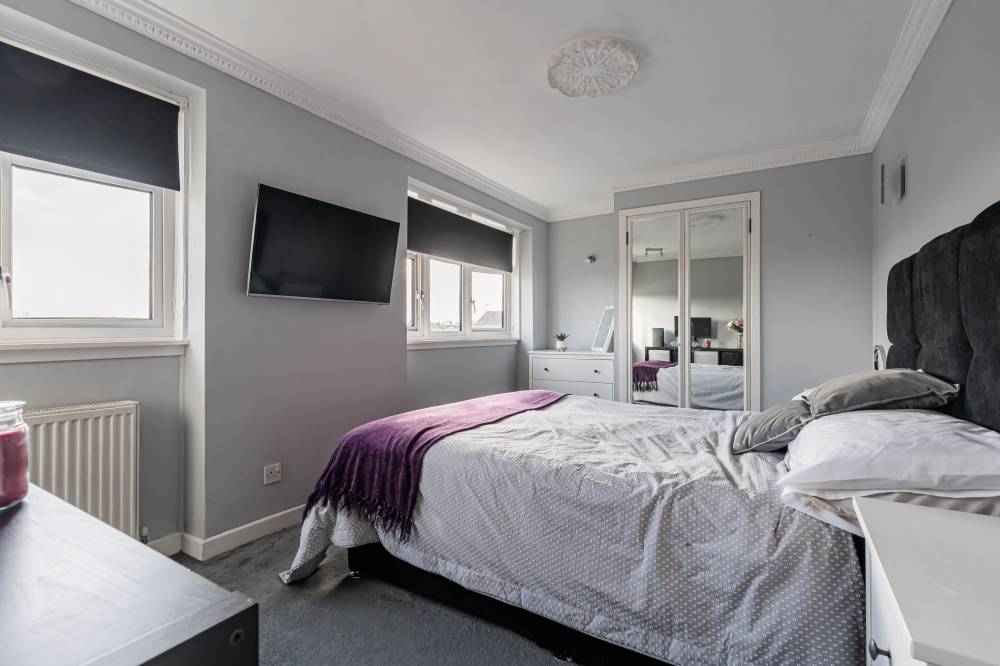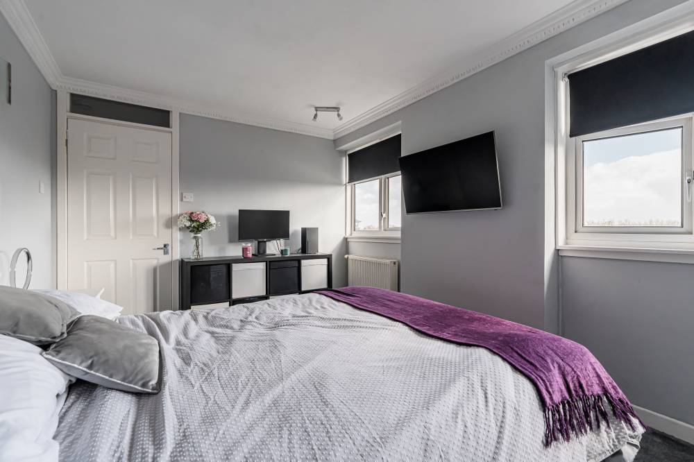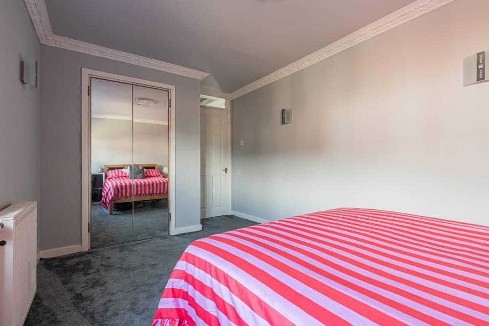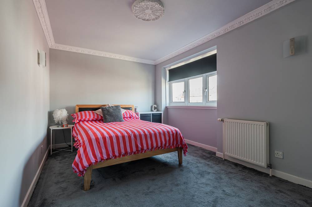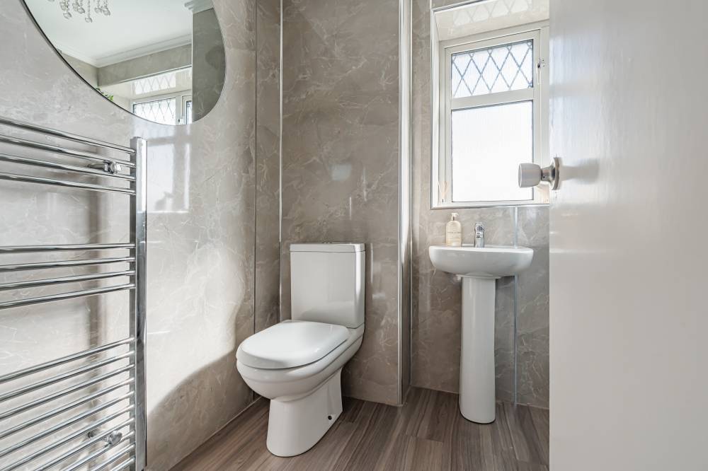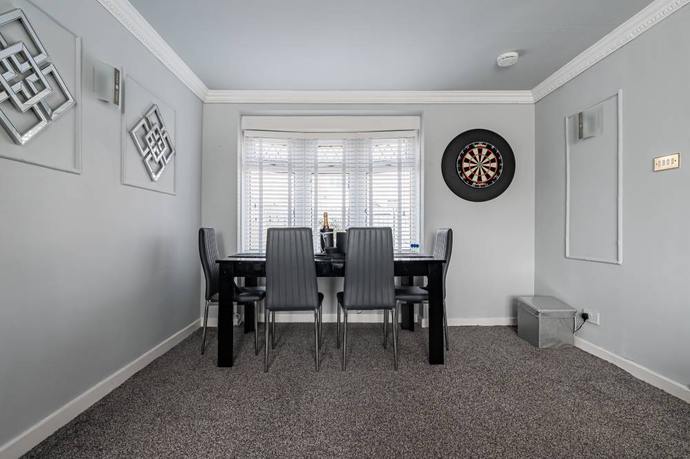 Upon entering through the front porch, you are welcomed directly into a bright and spacious kitchen diner. This impressive area forms the heart of the home and is fitted with an extensive range of floor and wall-mounted units, providing generous storage and worktop space. An integrated electric oven and hob, complete with a traditional extractor hood, ensure practicality for everyday cooking. The layout comfortably accommodates a dining table with seating for four, making it an ideal setting for family meals and entertaining alike. From the kitchen, access leads into the lounge, a well-proportioned and inviting room decorated in fresh modern décor. Dual-aspect windows allow natural light to flood the space, creating a bright and airy atmosphere. A feature brick-effect fireplace provides an attractive focal point, adding warmth and character to the room. The upper level hosts two generous double bedrooms, positioned to the front and rear respectively. Both rooms continue the theme of tasteful modern décor and benefit from built-in storage, offering practical wardrobe solutions while maintaining ample floor space. These rooms provide flexible accommodation, equally suited to family living, guest use, or a home office setup. The family shower room has been thoughtfully upgraded and features a modern white suite comprising a wash hand basin and WC, alongside a large walk-in shower enclosure fitted with an electric shower. The clean, contemporary finish enhances the overall appeal of the home.