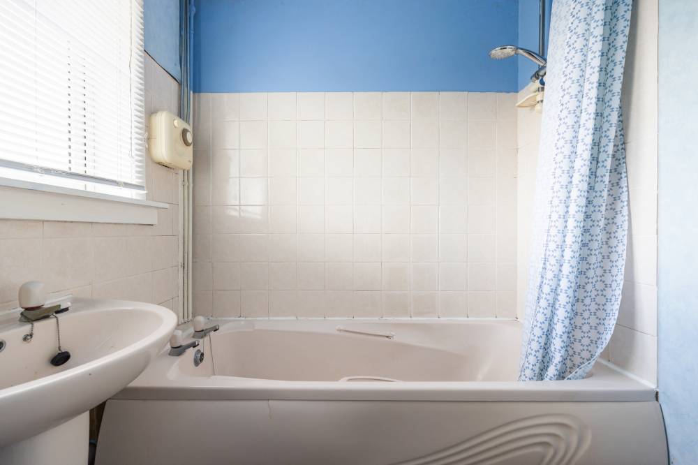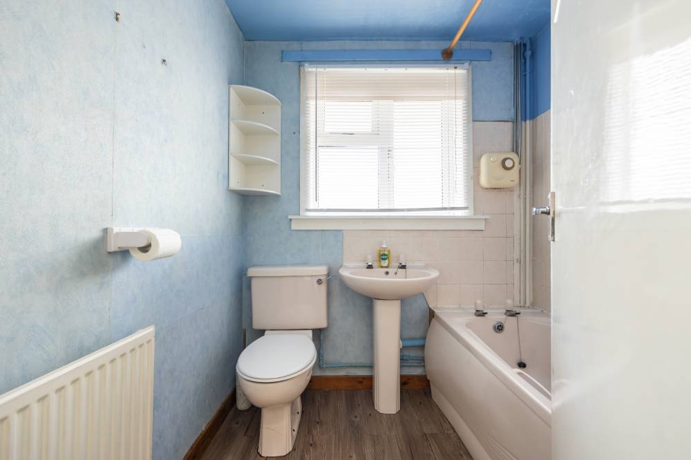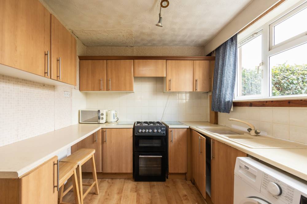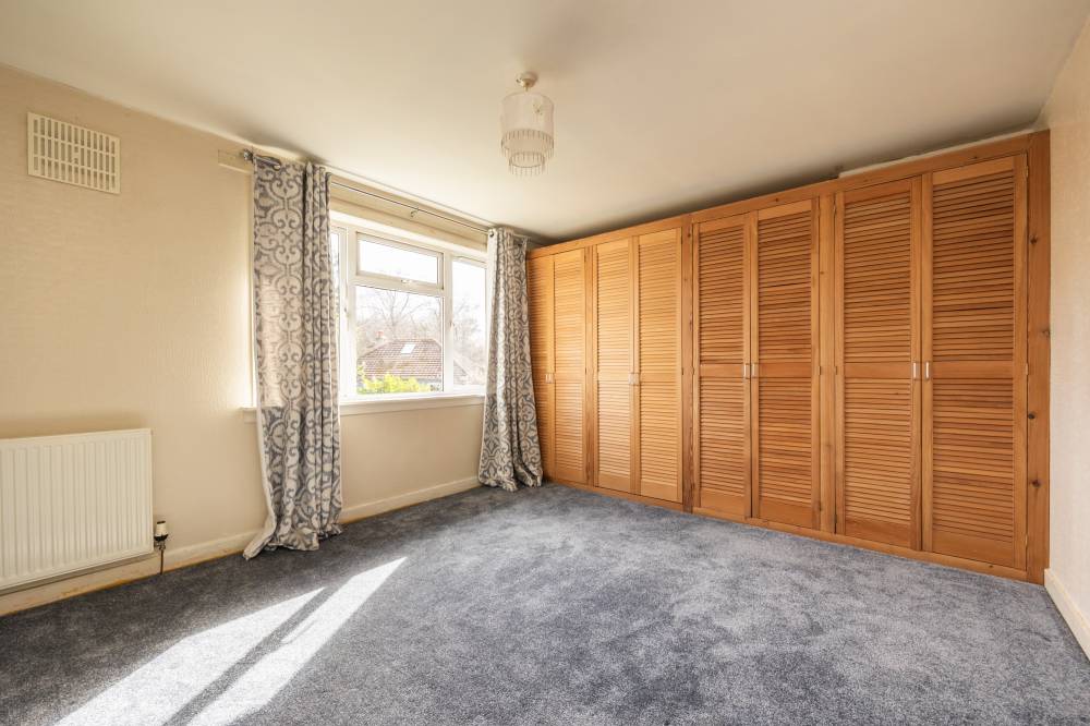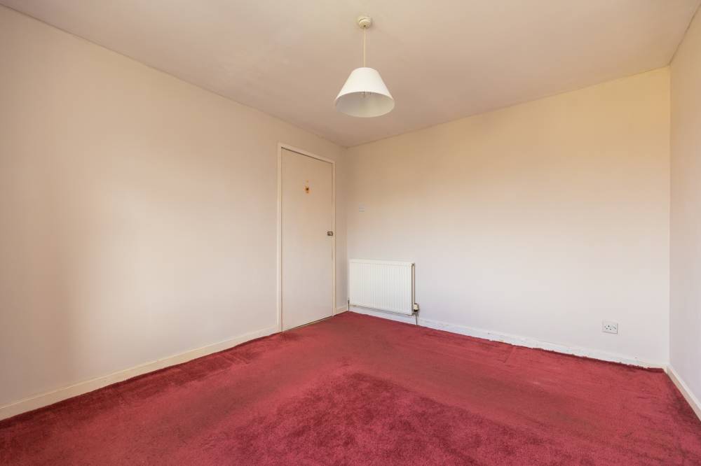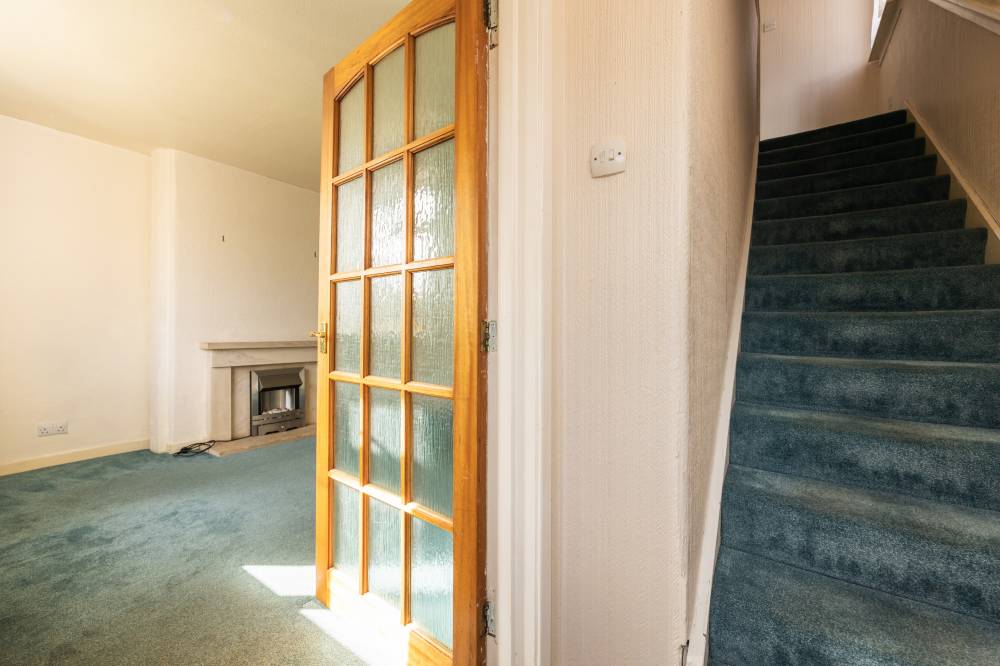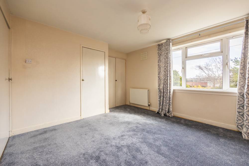The accommodation begins with a welcoming hallway, complete with a staircase leading to the upper level. To the front of the property lies a bright and generously proportioned reception room. This living space is finished with carpeting underfoot and features a charming stone fireplace with an electric fire insert, creating a cosy focal point. A recessed area with built-in shelving provides practical storage. Positioned to the rear, the fitted kitchen is well laid out with a range of wall and base units, complemented by tiling to the splash areas for easy maintenance. A convenient breakfast bar offers casual dining space, ideal for busy mornings or informal meals. The kitchen also provides access to a rear porch, which in turn leads directly to the garden. This area benefits from excellent additional storage options, enhancing the home’s practicality. Upstairs, there are two well-proportioned double bedrooms. The front-facing principal bedroom is bright and comfortable, featuring carpeting and an impressive array of built-in wardrobes and storage solutions. The second double bedroom, located to the rear, is equally spacious and presented in neutral décor, offering flexibility for use as a guest room, home office, or additional family bedroom. The bathroom is fitted with a three-piece suite comprising a bath with shower over, wash hand basin, and WC, providing a functional and well-maintained space.