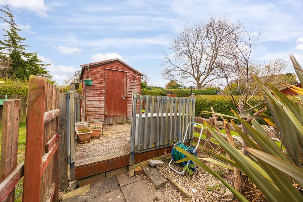Externally, the property benefits from a shared drying green, a driveway providing off-street parking for one car, and a private side area with a wooden deck and shed. There is also a rear garden area laid to lawn and bordered by hedging.