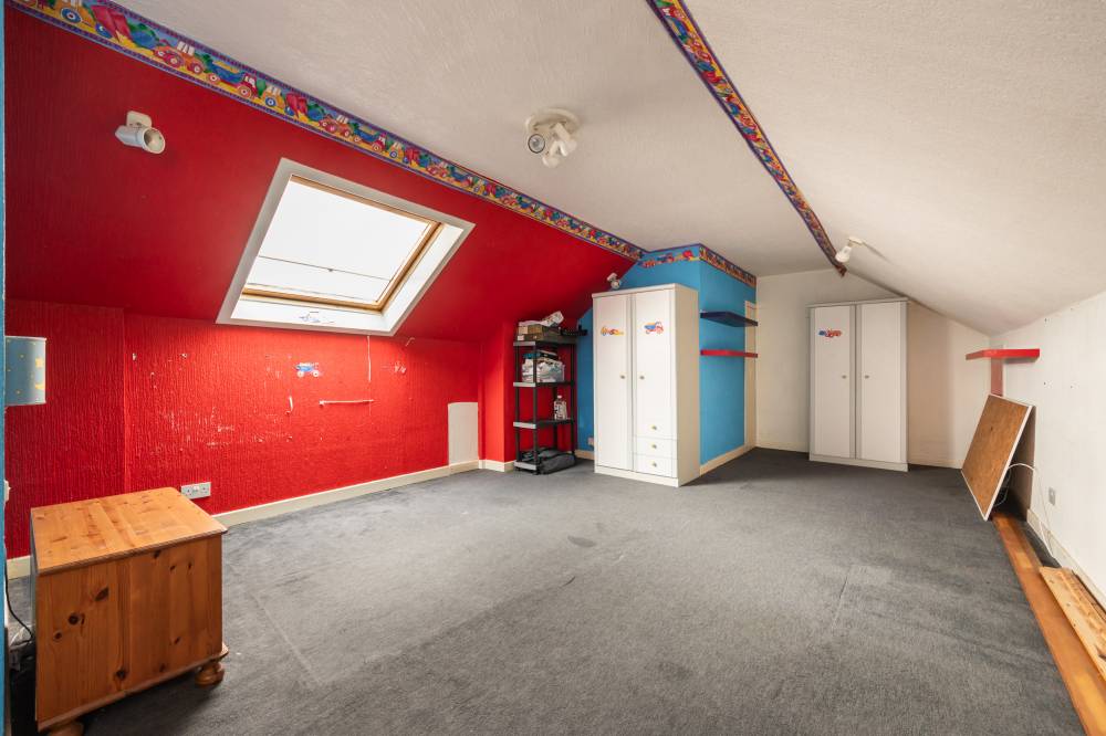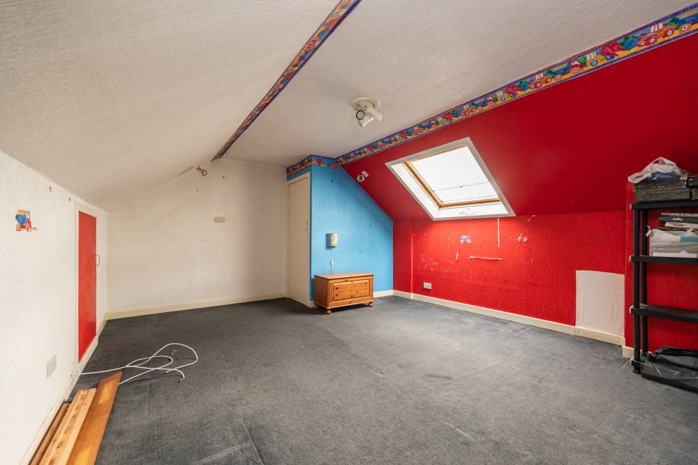 The accommodation is accessed via a private entrance staircase leading to a welcoming hallway. The lounge/diner is bright and airy, enjoying a peaceful rear aspect. It features a traditional press cupboard, fitted cabinets, and an open staircase leading to the attic space. The kitchen is fitted with base and wall-mounted units, with partial tiling in splash areas, under-unit lighting, and tiled flooring. There are two well-proportioned bedrooms. The principal bedroom is a spacious front-facing room with a bay window and gas fireplace. The second bedroom is also a front-facing double, benefitting from fitted cupboards and a large storage cupboard housing the boiler. The shower room is fitted with a single shower cubicle and finished with tiled flooring and fully tiled walls. A notable feature of the property is the floored and lined attic, accessed via a staircase from the lounge. With eaves storage to either side and a Velux window, this space offers excellent potential for further development, subject to the necessary planning and consents.