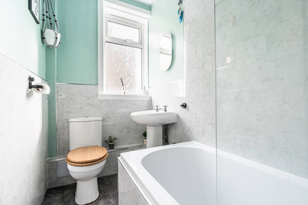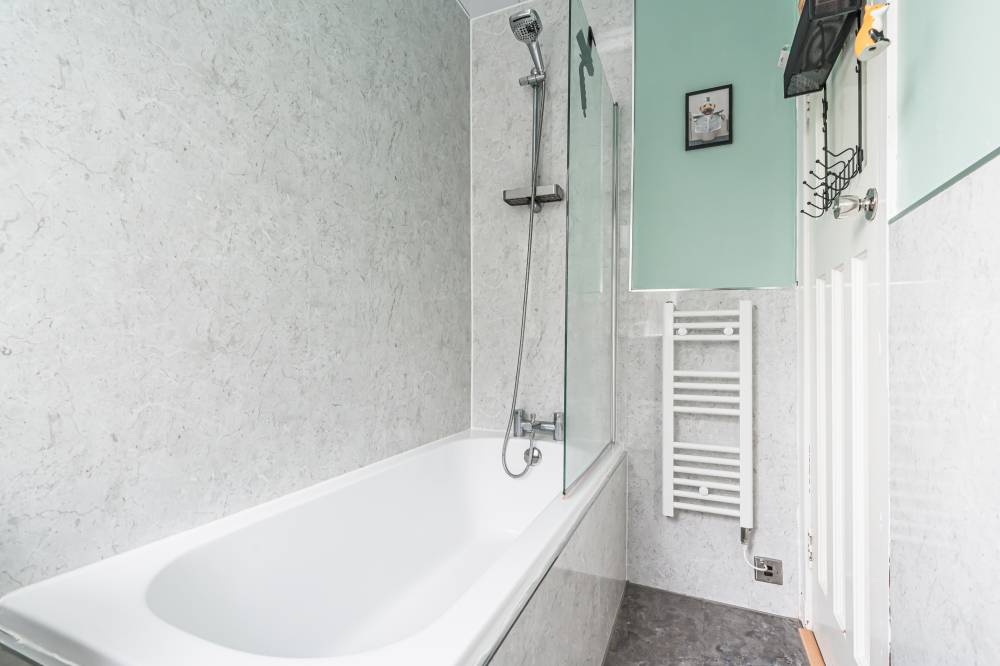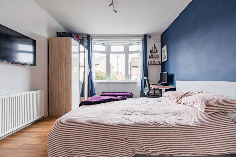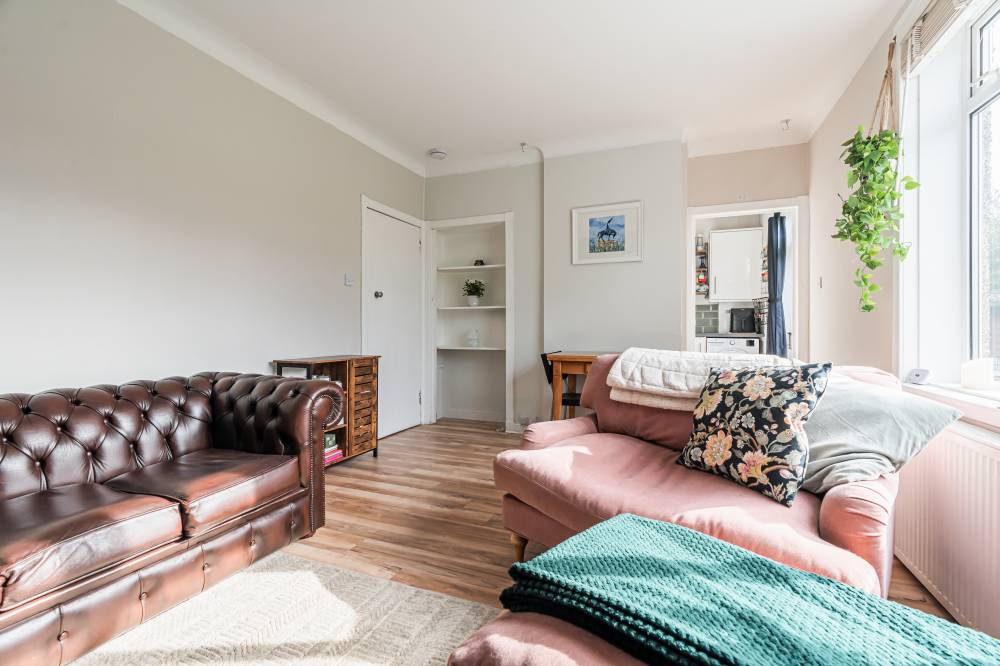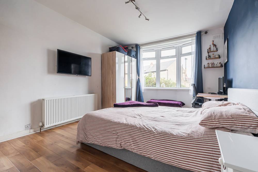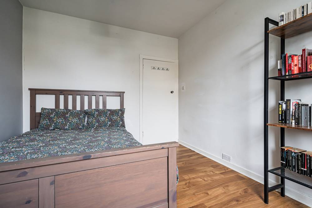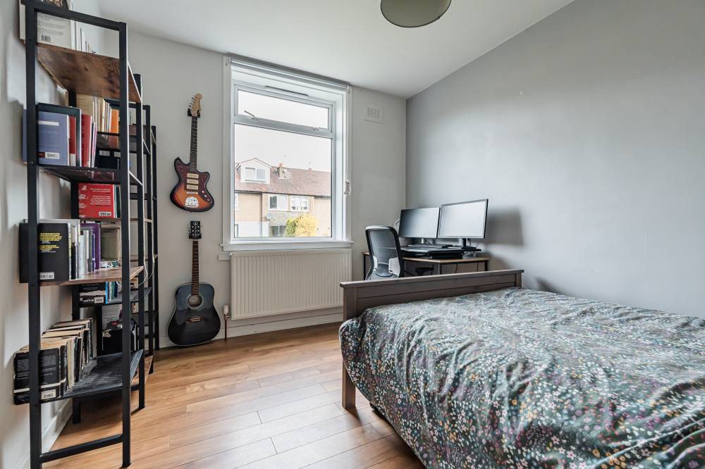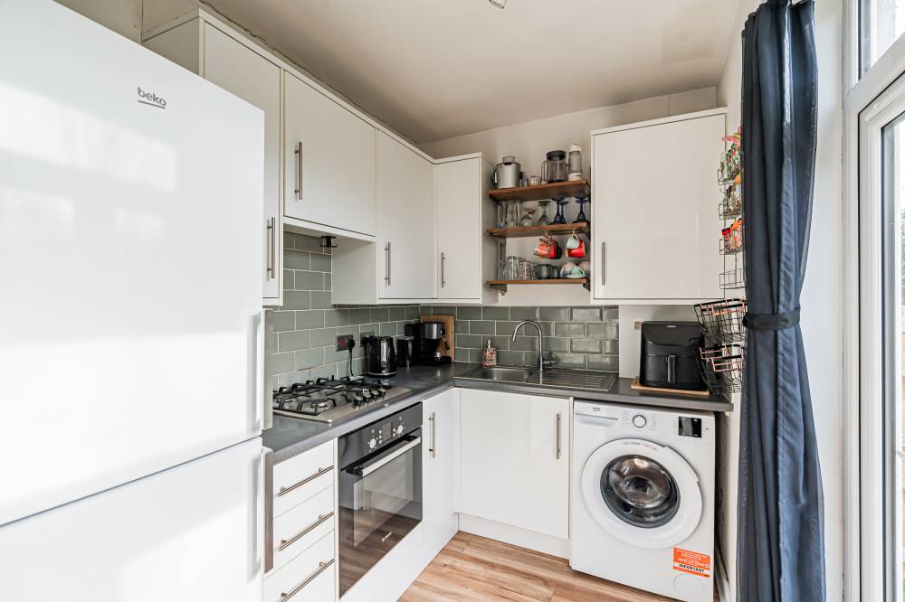 Access is via a private main door which opens into a vestibule leading through to the central hallway, providing access to the principal accommodation. To the rear of the property is a bright and spacious reception room which overlooks the private garden. This welcoming living space features laminate flooring and offers ample room for both lounge and dining furniture, creating a versatile area for relaxing or entertaining. The fitted kitchen is equipped with modern white high-gloss wall and base units, complemented by tiling to the splash areas. Glazed doors provide direct access to the rear garden, allowing for excellent natural light and easy indoor-outdoor living during the warmer months. The principal bedroom is a particularly spacious double, enhanced by a bay window that allows plenty of natural light to flow into the room. It is presented in modern décor, creating a comfortable and stylish space. The second bedroom is another well-proportioned double positioned to the front of the property, featuring laminate flooring and neutral décor which will suit a variety of tastes. Completing the accommodation is the bathroom, fitted with a white three-piece suite including a bath with shower over and a glass shower screen.