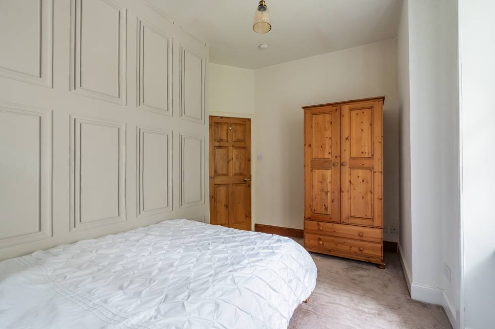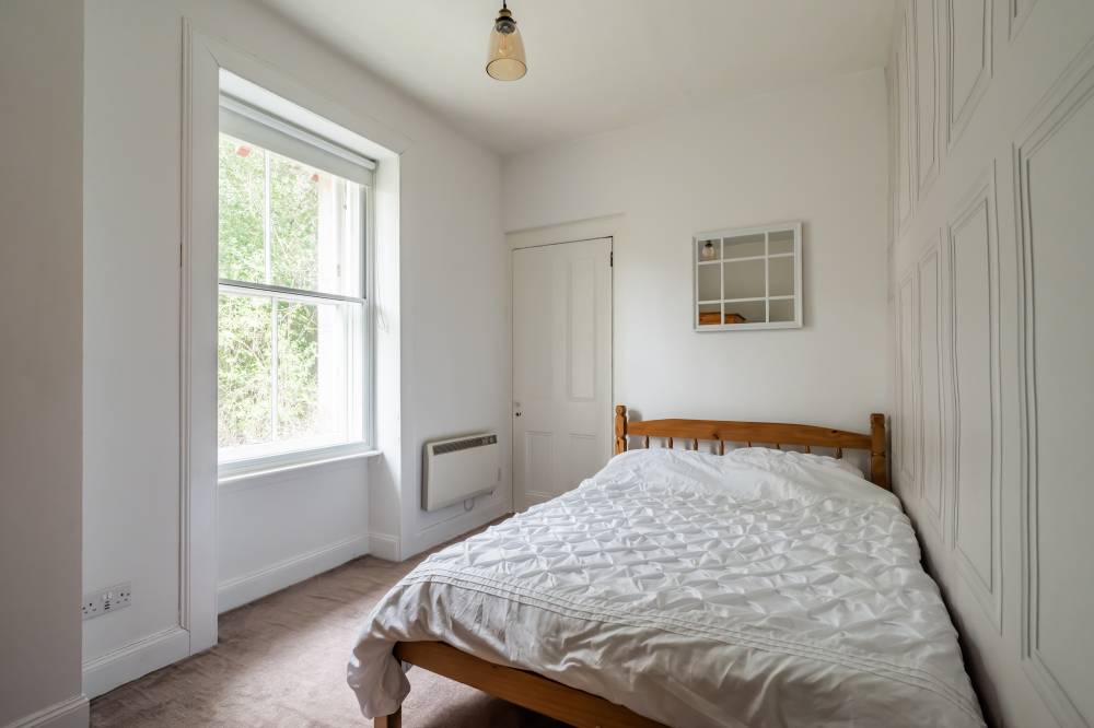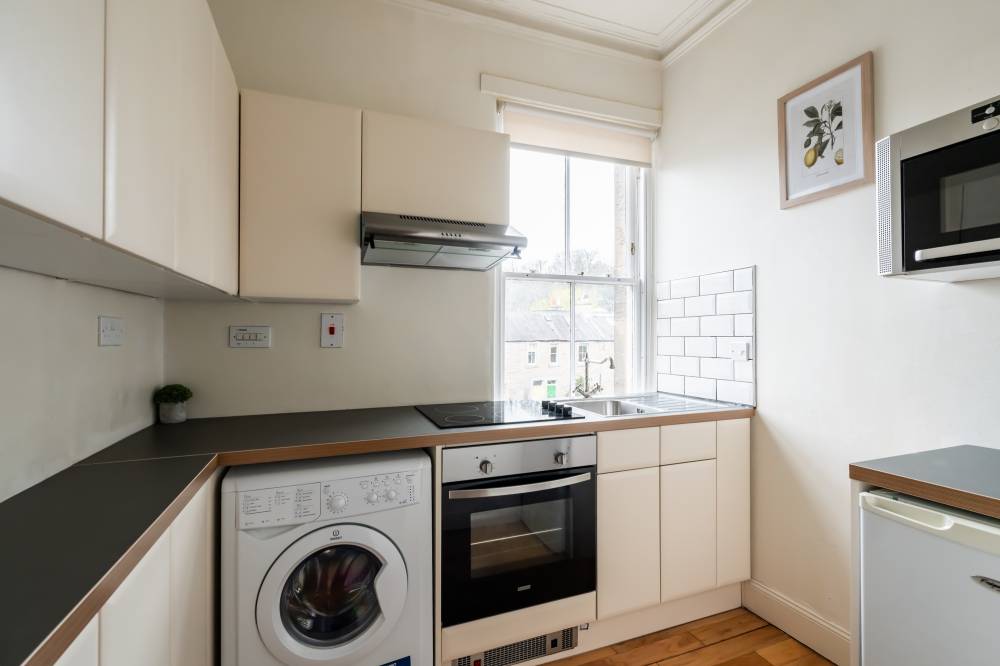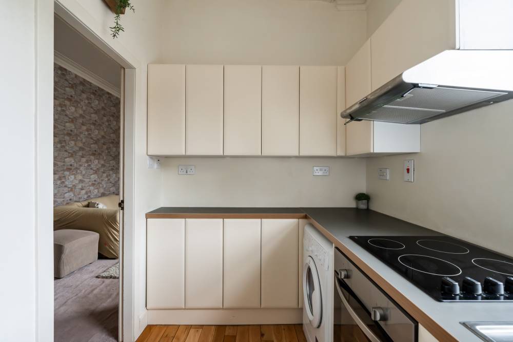 The accommodation opens with a welcoming entrance hallway, featuring a cloak cupboard along with a handy overhead storage cupboard. The lounge/diner is a light and airy space with a pleasant front-facing aspect. It retains character through a traditional shelved Edinburgh press cupboard and a gas fireplace, creating an attractive focal point. The kitchen is well-appointed with a range of integrated and freestanding white goods. It is also partially tiled in splash areas and offers a good amount of cupboard and worktop space. The bedroom is a good-sized double, quietly positioned to the rear with a leafy outlook. It also benefits from an Edinburgh press cupboard and provides ample space for freestanding furniture. The bathroom is fitted with a rainfall shower over bath, complemented by partial tiling and a heated towel rail.