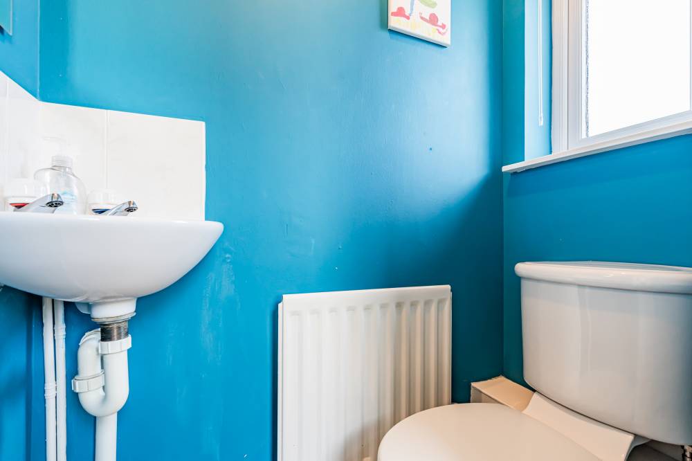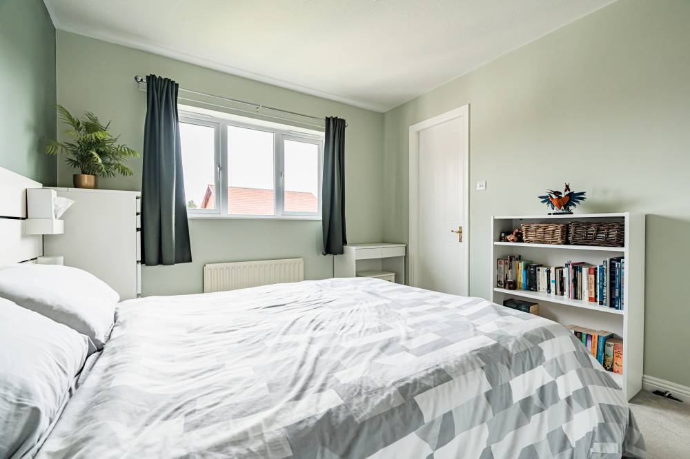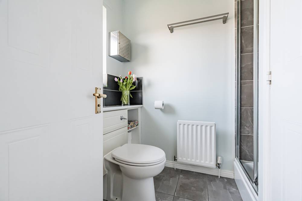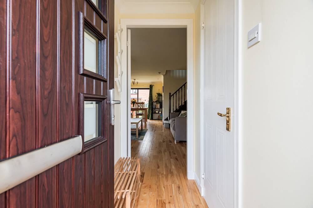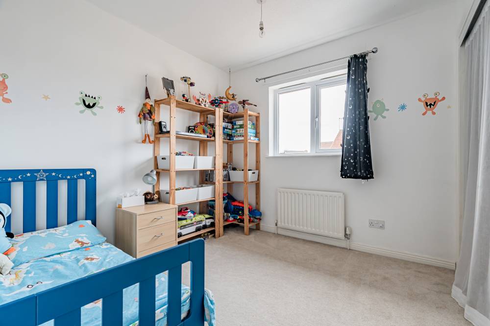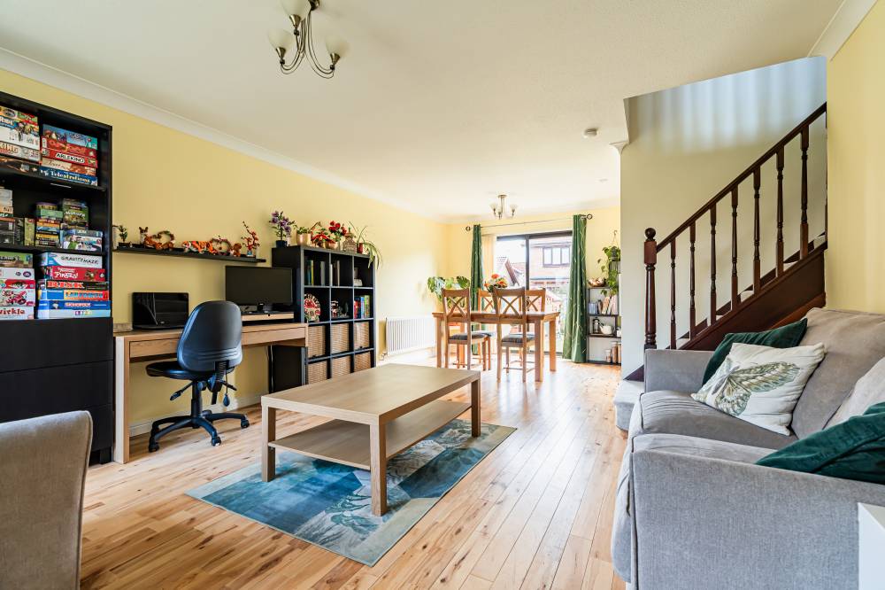 The home opens into a welcoming entrance vestibule, complete with a convenient WC. From here, you are led into a bright and spacious dual-aspect reception room, featuring a window to the front and glazed sliding doors to the rear, allowing for direct access to the garden. This versatile space comfortably accommodates both lounge and dining areas, while an open staircase adds a stylish architectural feature. The modern fitted kitchen is finished with sleek light grey wall and base units, complemented by integrated appliances including a five-burner hob and double oven. The kitchen enjoys a pleasant outlook over the rear garden, creating a calm and inviting space for everyday living. A separate utility room provides additional practicality and includes a side entrance for convenience. On the ground floor, there is a generously sized double bedroom, which could equally serve as a playroom, study, or home office, depending on your needs. Upstairs, the principal bedroom benefits from mirrored built-in wardrobes, soft carpeting, and a contemporary en-suite shower room. Two further well-proportioned double bedrooms provide ample accommodation, while the family bathroom is fitted with a modern white three-piece suite, complete with a shower over the bath and vanity storage. A floored attic offers valuable additional storage space.