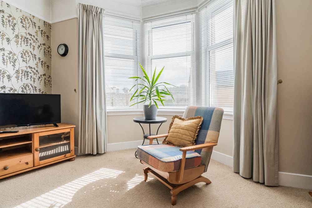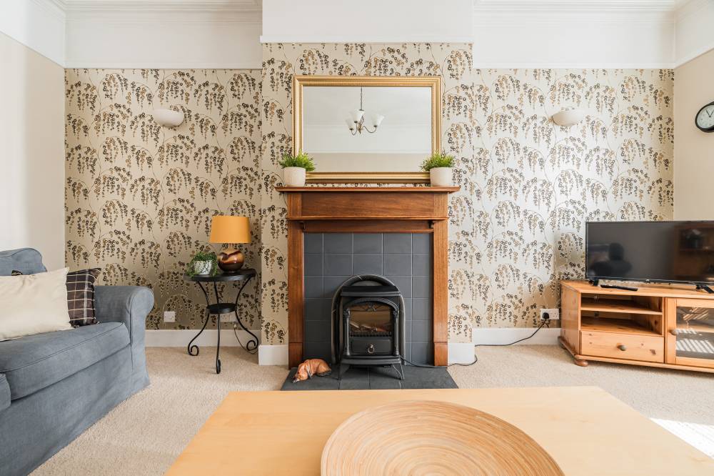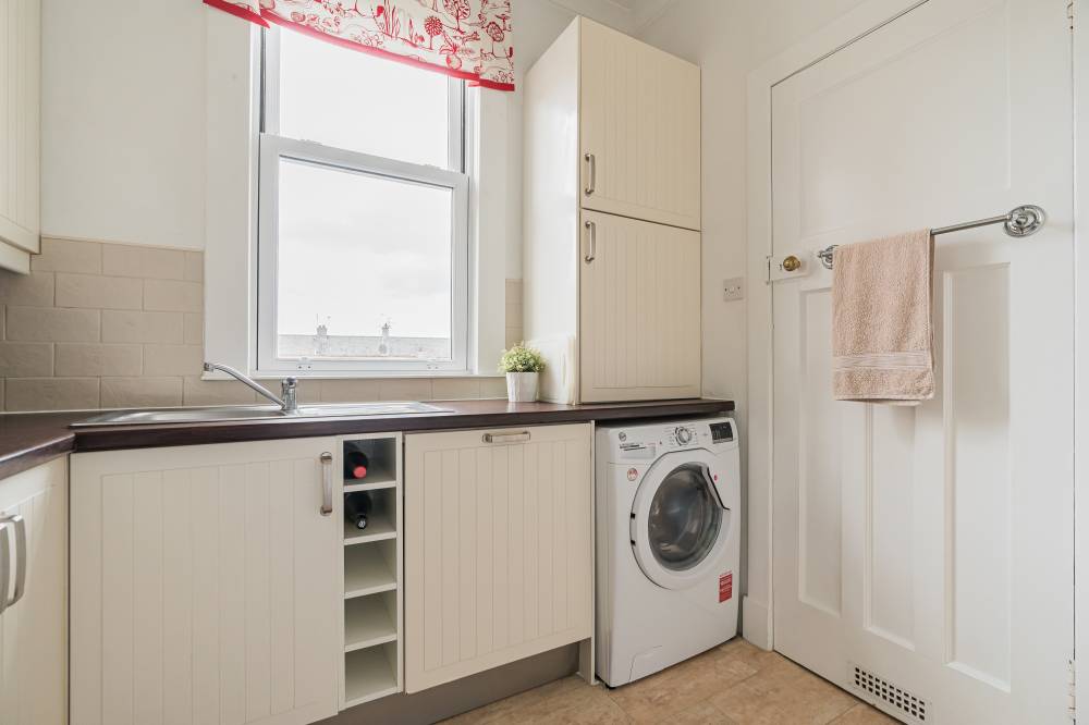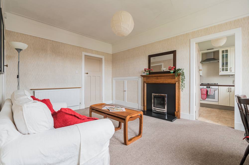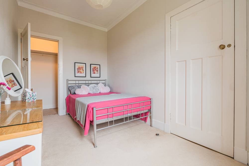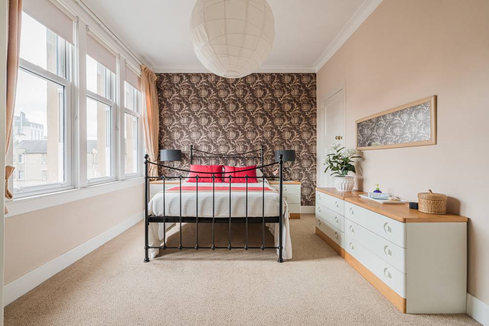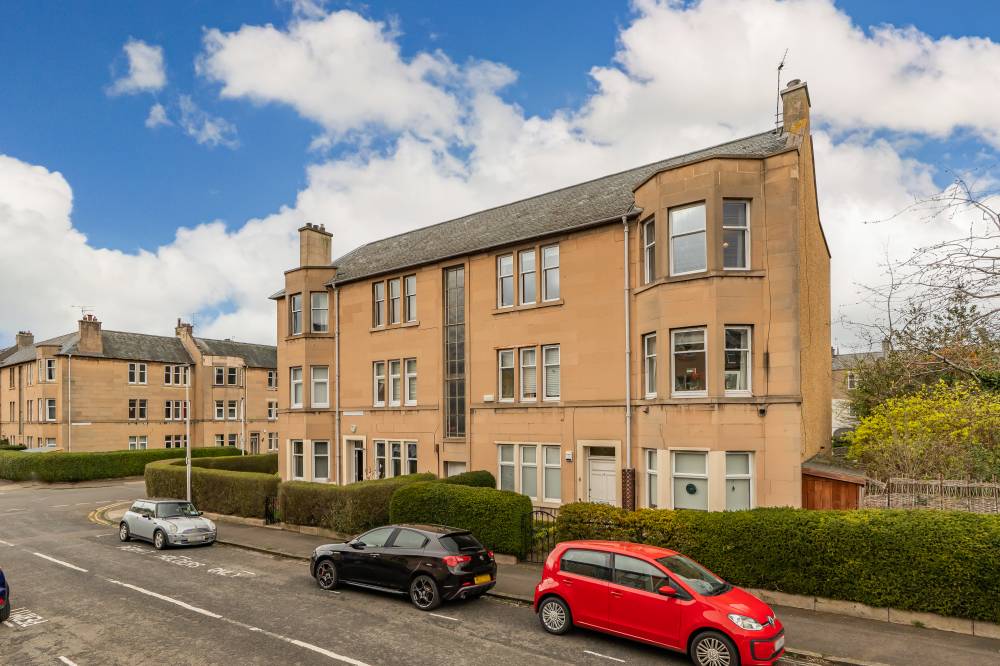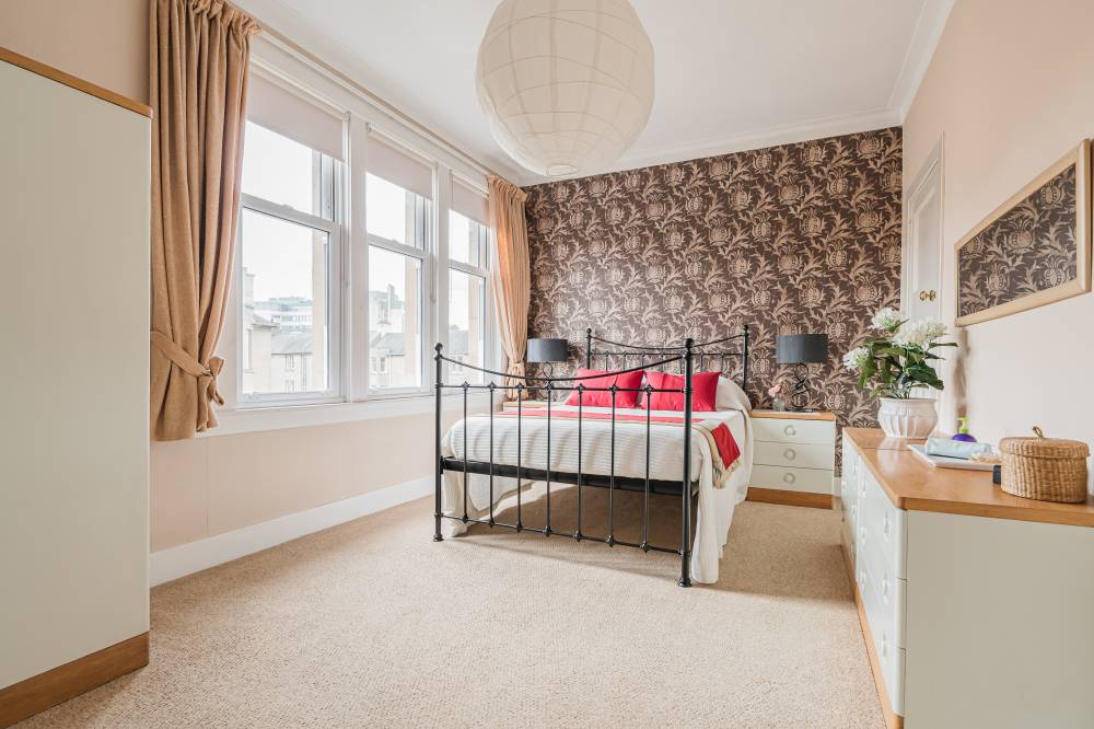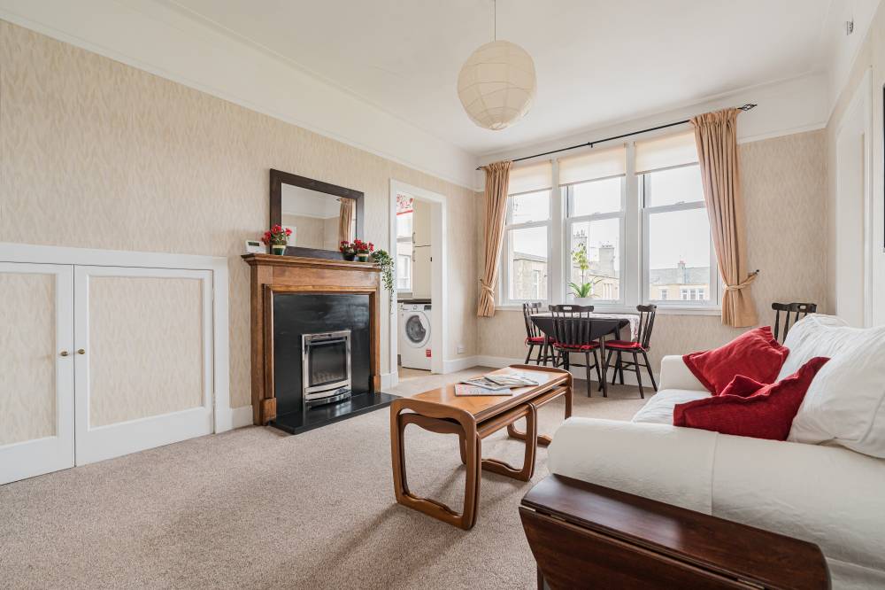 Internally, the property offers flexible and well-balanced accommodation throughout. A welcoming hallway, with large storage cupboard, provides access to the principal rooms and sets the tone for the home. To the front, and facing south, a bright bay windowed formal sitting room enjoys an attractive open outlook and is enhanced by stylish décor, carpeted flooring and a focal fireplace, creating an impressive and elegant living space. A second living/dining room, with three windows, sits to the rear of the property offering a peaceful aspect overlooking the communal garden area towards Fettes College. This versatile room also benefits from a feature fireplace with a high efficiency gas fire and two large, shelved storage cupboards. The layout offers excellent flexibility, with potential for the large front sitting room to be used as a principal bedroom. The kitchen is stylishly fitted and well laid out, featuring a good range of wall and base units, with tiling to splashback areas. It is equipped with a frost free fridge, freezer, gas hob, built under electric oven, full size integrated dishwasher, externally ducted cooker hood, auto washer dryer and full worktop lighting. The recently fitted combi boiler is guaranteed for eight years. The front double bedroom is well proportioned, with triple south facing windows, storage cupboard and with carpeted flooring. In addition, a further double bedroom, to the rear, enjoys views over the communal garden and benefits from a large walk in wardrobe with lighting. The bathroom is fitted with a white three piece suite and includes a thermostatic shower over the bath. There is a large storage cupboard and an extractor fan. The bathroom is finished with crisp white tiling, creating a clean modern feel.