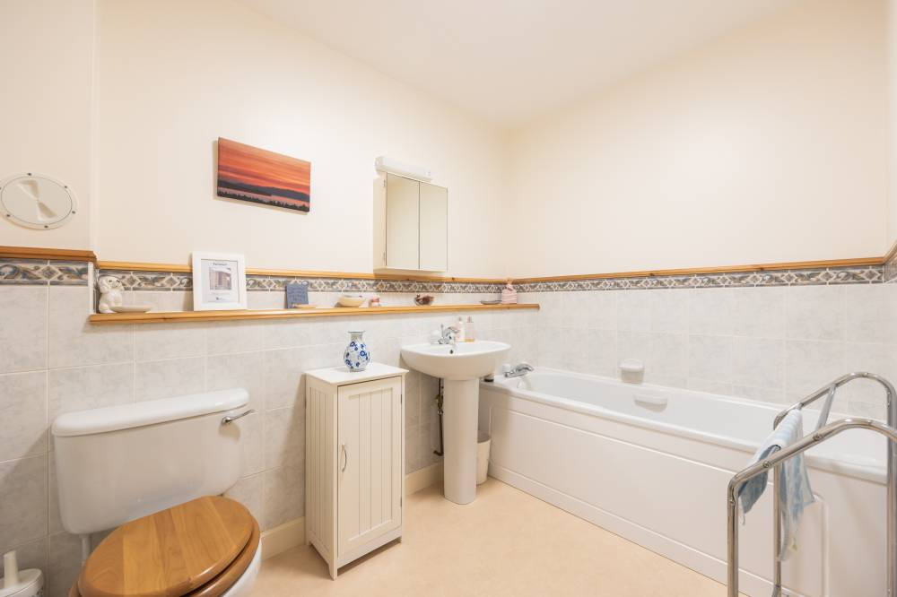 The accommodation opens with a welcoming entrance hallway, benefiting from fantastic in-built storage provisions. The bay-fronted lounge/diner is a bright and spacious room, featuring an electric fireplace and offering ample space for a variety of furniture layouts. Double doors lead through to the kitchen, enhancing the sense of flow within the home. The kitchen is well-appointed with a range of integrated white goods, complemented by partial tiling in splash areas, under-unit lighting, and traditional wooden units. The principal bedroom is a large double, featuring an integrated wardrobe and plenty of space for freestanding furniture. It also benefits from an en suite, fitted with a double shower cubicle and partial tiling. The second bedroom is another comfortable double, offering flexible use depending on individual requirements. The main bathroom is partially tiled and fitted with a bath.