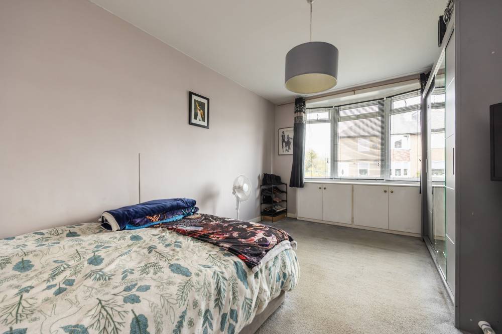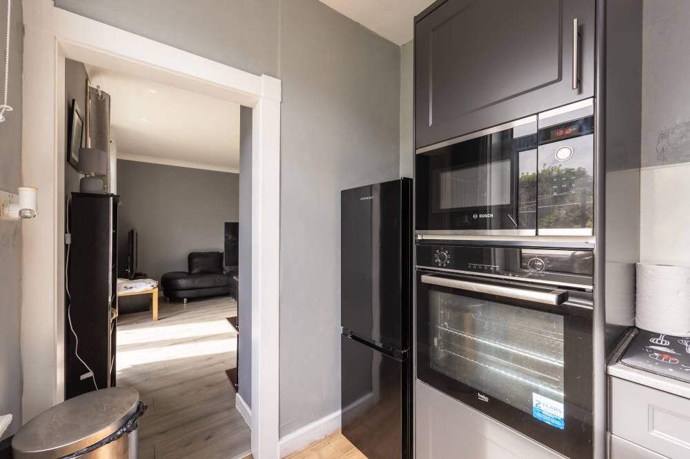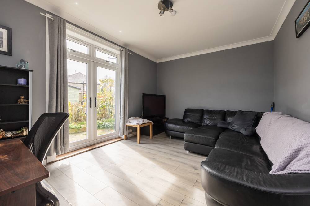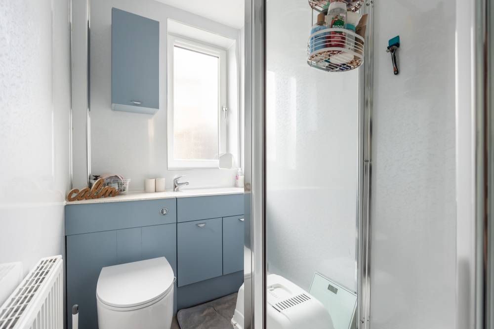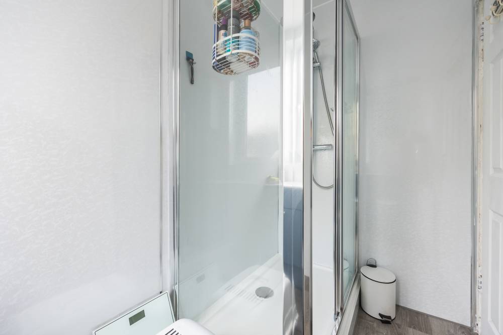 Internally, the accommodation is well laid out and thoughtfully designed. The welcoming hallway provides excellent storage options, helping to keep the living space clutter-free. The reception room is bright and inviting, featuring laminate flooring, shelved storage, and glazed double doors that open directly onto the rear garden, allowing for a seamless indoor-outdoor flow. The fitted kitchen is both stylish and practical, equipped with a range of wall and base units, integrated appliances including a hob, oven, and microwave, and easy-care acrylic splashback panels for added convenience. The principal bedroom is a spacious double, enhanced by a bay window to the front and useful built-in storage beneath. A second well-proportioned double bedroom offers comfortable accommodation and is finished with carpet flooring. Completing the interior is the bathroom, fitted with a modern white two-piece suite and a glass shower cubicle featuring a dual-headed thermostatic shower.