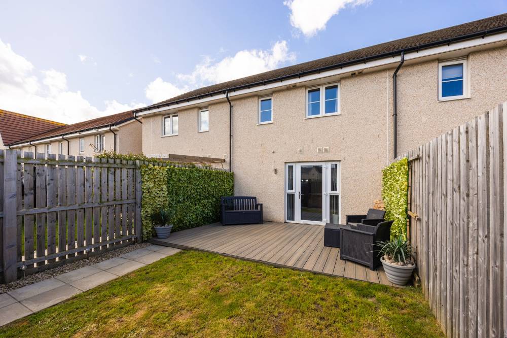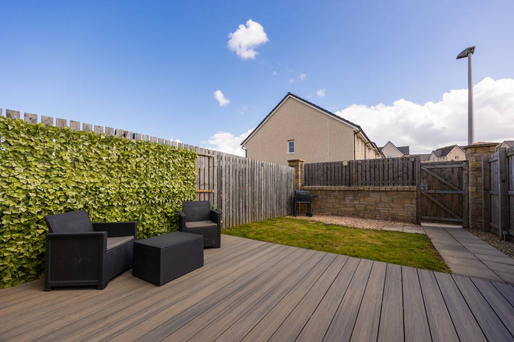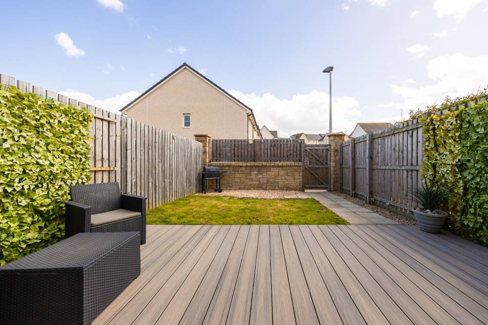 The rear garden is fully enclosed, offering a private and secure outdoor space. It provides convenient access to the parking area, raised deck, and lawn, making it a practical extension of the living space for both relaxation and everyday use.