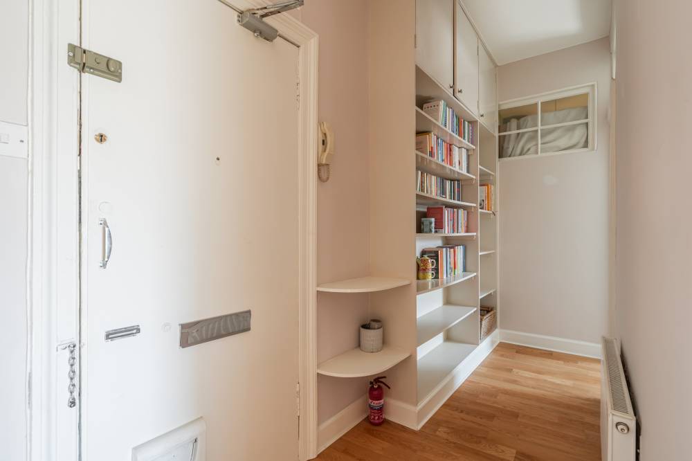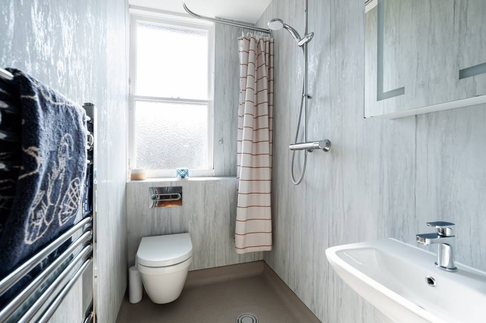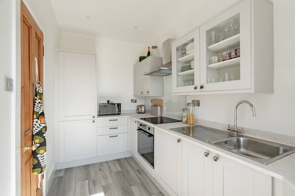 The accommodation opens with a welcoming entrance hallway, featuring fitted book shelving and overhead cupboards, providing both character and practical storage. The lounge/diner is a bright and spacious room, enjoying a lovely open outlook and offering an ideal setting for both relaxing and entertaining. The stylish kitchen is finished in smart neutral tones and fitted with a range of integrated white goods. It benefits from under-unit lighting, a charming window seat nook, and a good selection of storage and worktop space. The bedroom is a large double, offering ample room for freestanding furniture and flexible layouts, and further benefits from a walk-in wardrobe with fitted storage provisions. The sleek wet room is fully panelled and fitted with a rainfall shower, heated LED mirror, and heated towel rail.