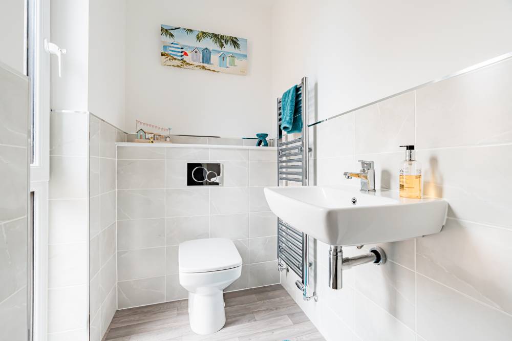 Upon entering, the welcoming hallway offers useful storage, including a cupboard with plumbing suitable for a utility setup (washing machine currently in there), along with a convenient WC with floor to ceiling window and heated towel rail. The heart of the home is the bright and airy open-plan living space, featuring two full-height windows that flood the room with natural light. This versatile area comfortably accommodates both lounge and dining configurations and is finished with soft carpeting and contemporary décor. The adjoining fitted kitchen is well-equipped with integrated appliances and an excellent range of wall and base units, offering both style and practicality. Upstairs, there are two well-proportioned double bedrooms. The principal bedroom benefits from extensive built-in wardrobes with mirrored sliding doors, while the second bedroom is equally spacious and finished in a neutral style, making it ideal for guests, family, or home working. The bathroom is fitted with a modern three-piece white suite, complemented by a thermostatic shower over the bath, stylish tiling, and a chrome heated towel rail. The property is further enhanced by a range of energy efficiency features and modern comforts, including double glazing and central heating, which contribute to a consistent and comfortable indoor environment throughout the year. In addition, the installation of solar panels provides an element of renewable energy generation, helping to improve overall efficiency and support more sustainable day-to-day living.